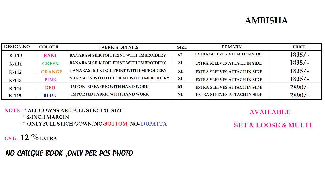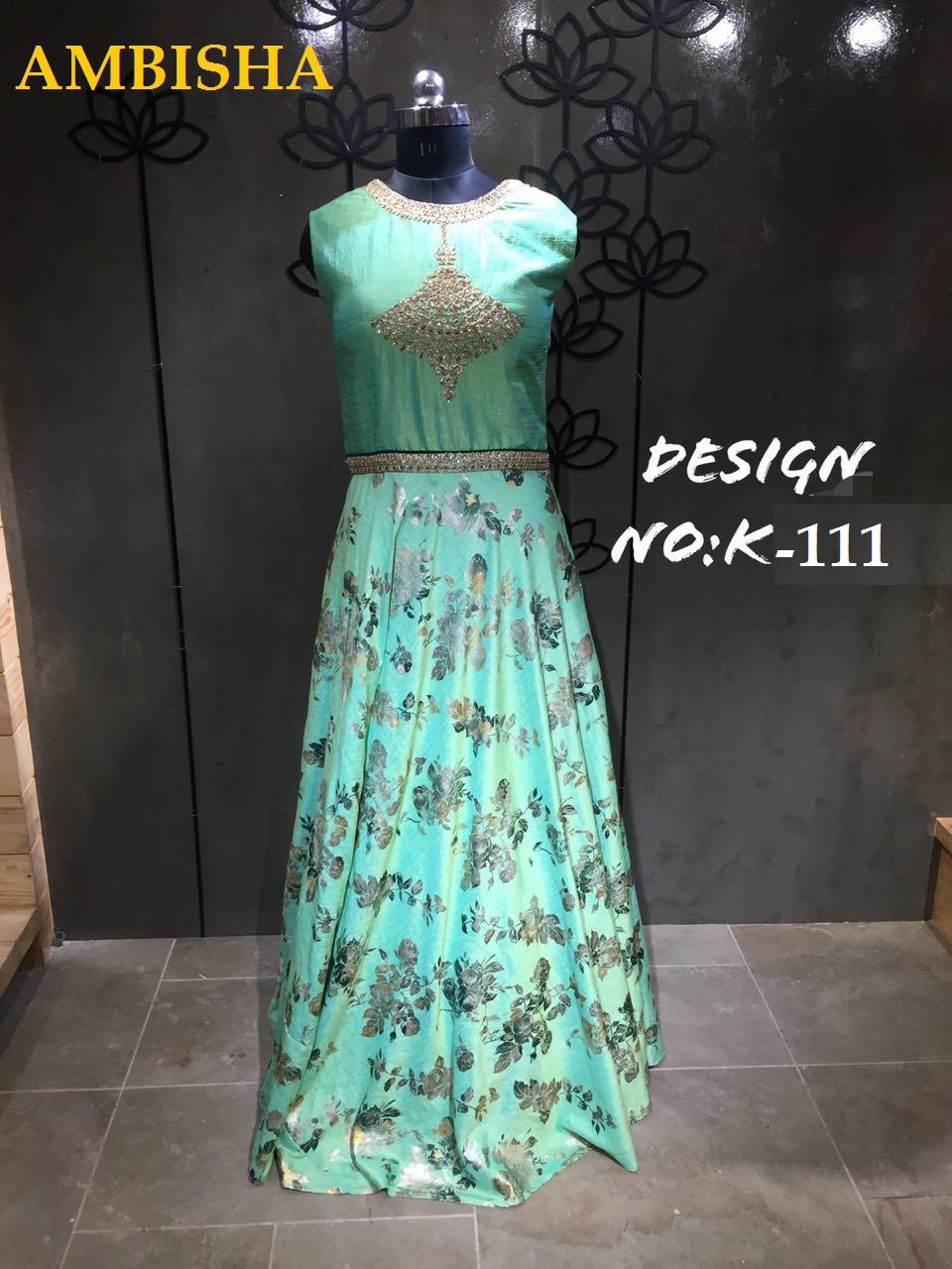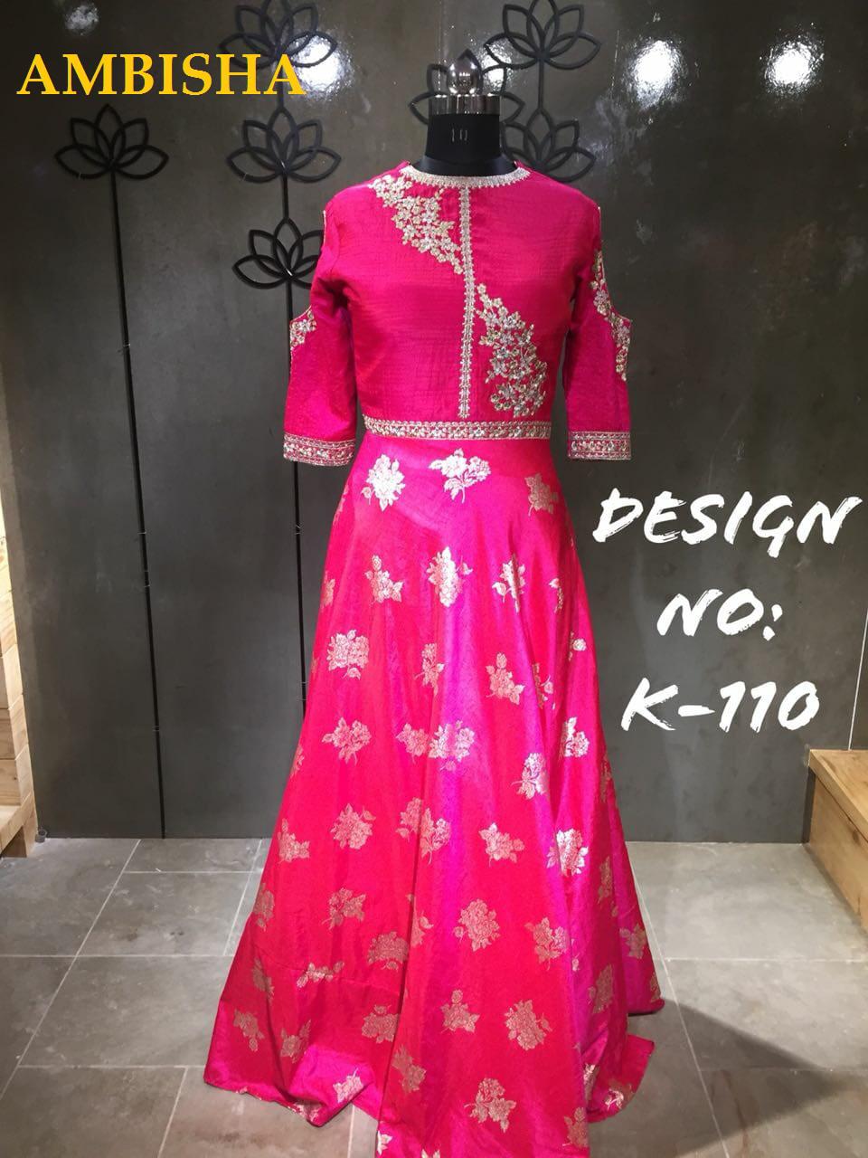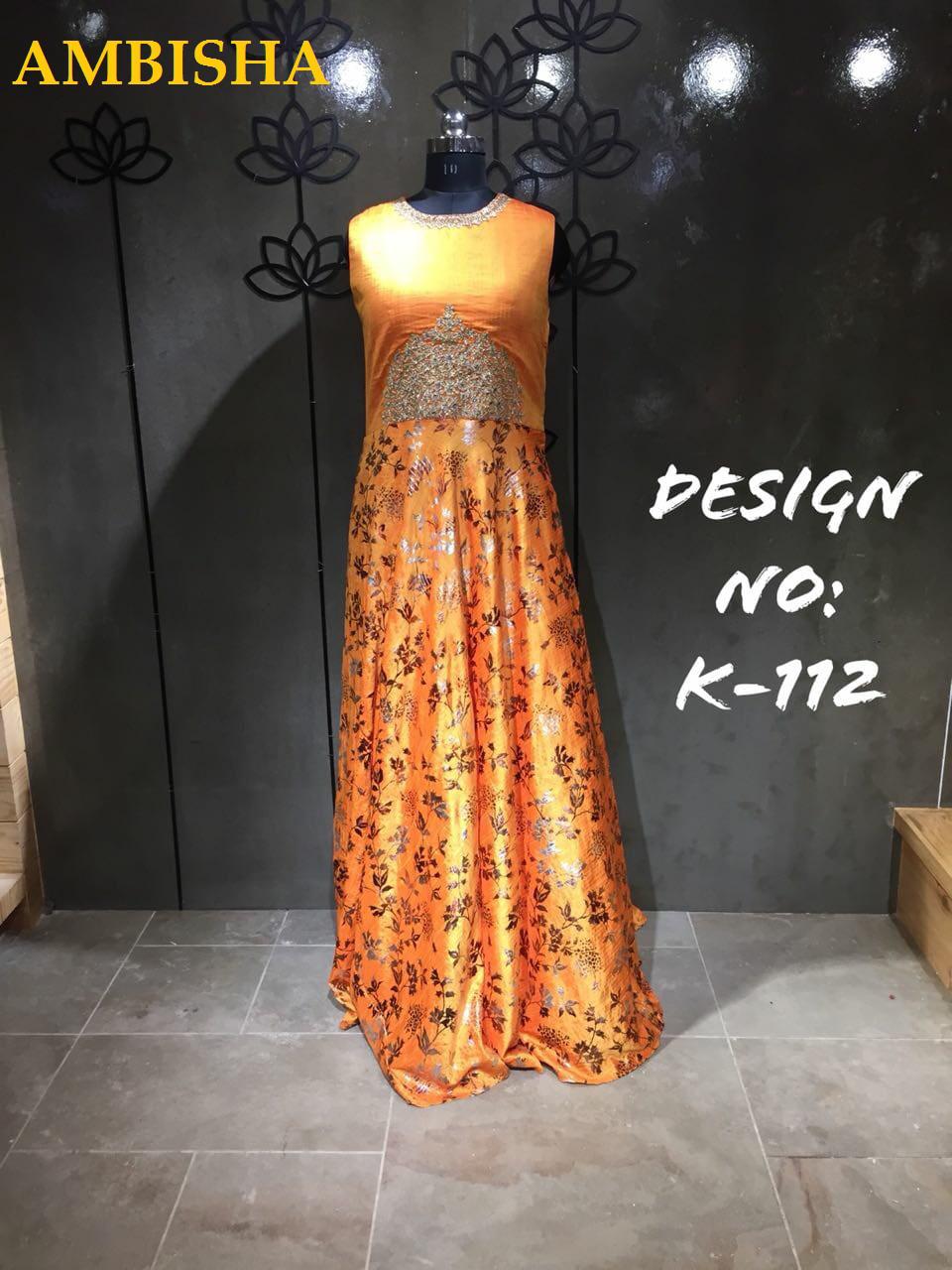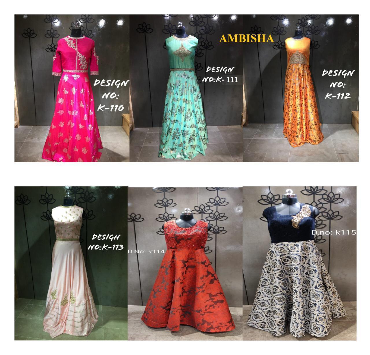 Buy Online Ambisha K 110 Series Designer Gown Suit Collection Wholesaler Surat 6 Pcs of Full Catalogue at Wholesale Price. Looking for Ambisha K 110 Series Designer Gown Suit Collection Wholesaler Surat Full Catalouge at Best Price? Buy Now Ambisha K 110 Series Designer Gown Suit Collection Wholesaler Surat at Wholesale Rate of Rs 0 with Total 6 Pcs from authroized dealer and supplier of Brand. Cost of Each piece is just only Rs 0 which is very low and affordable price to resale the product in your retail store ,This is Surat based Wholesale Supplier & Dealer of Brand. Click on Brand name to Know more about Brand's products.Call or Whatsapp on 9898838984 for booking or enquiry