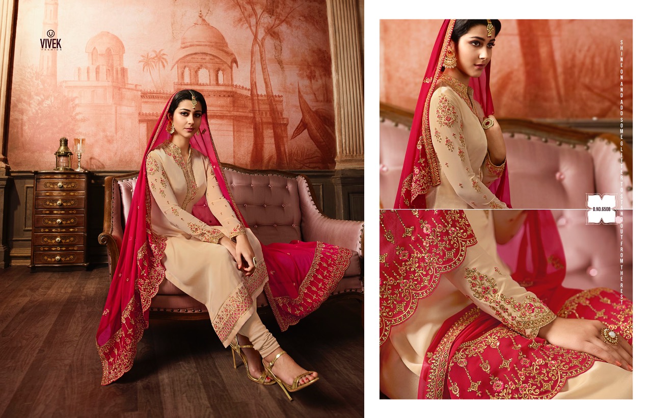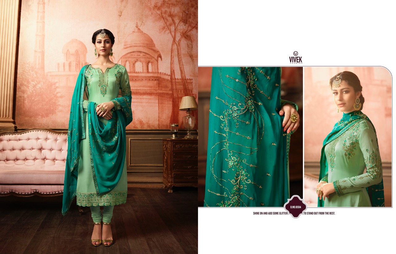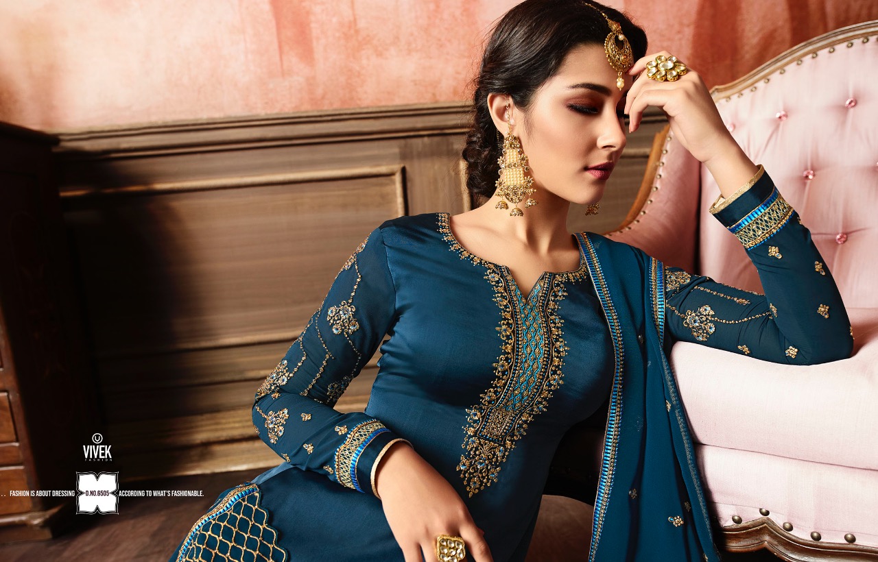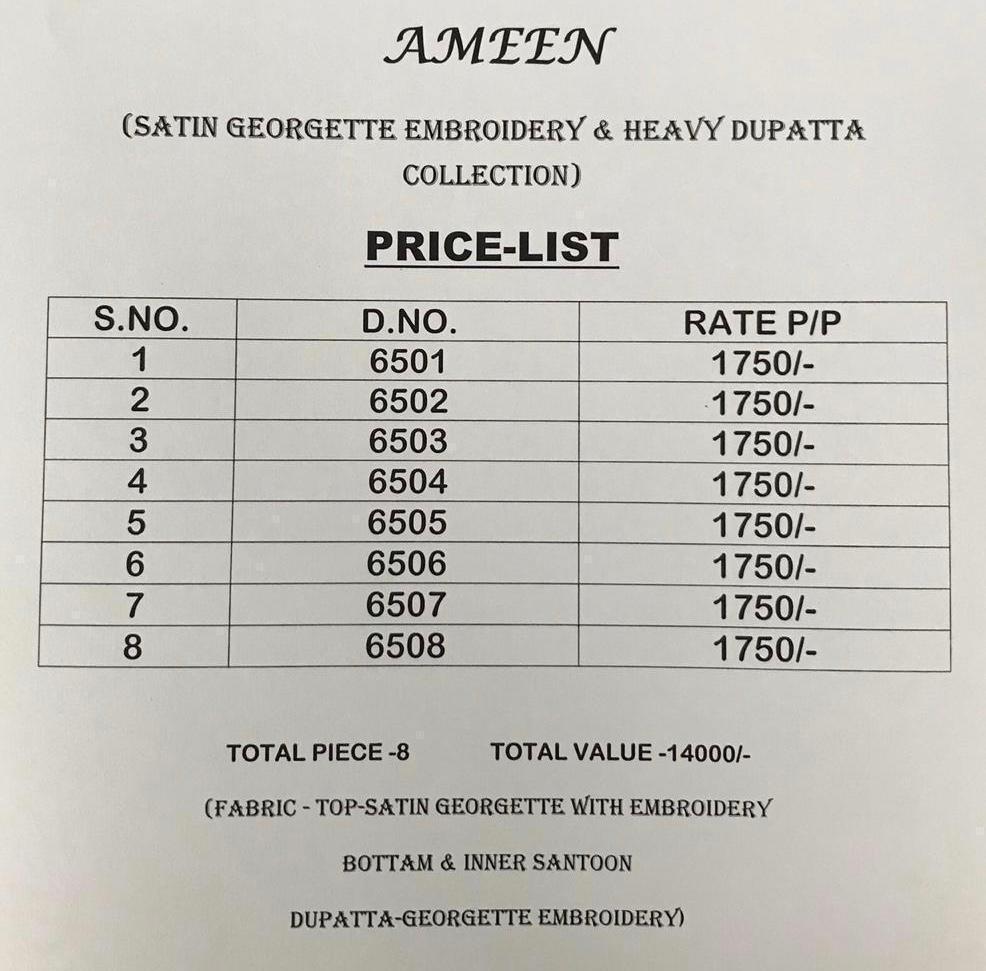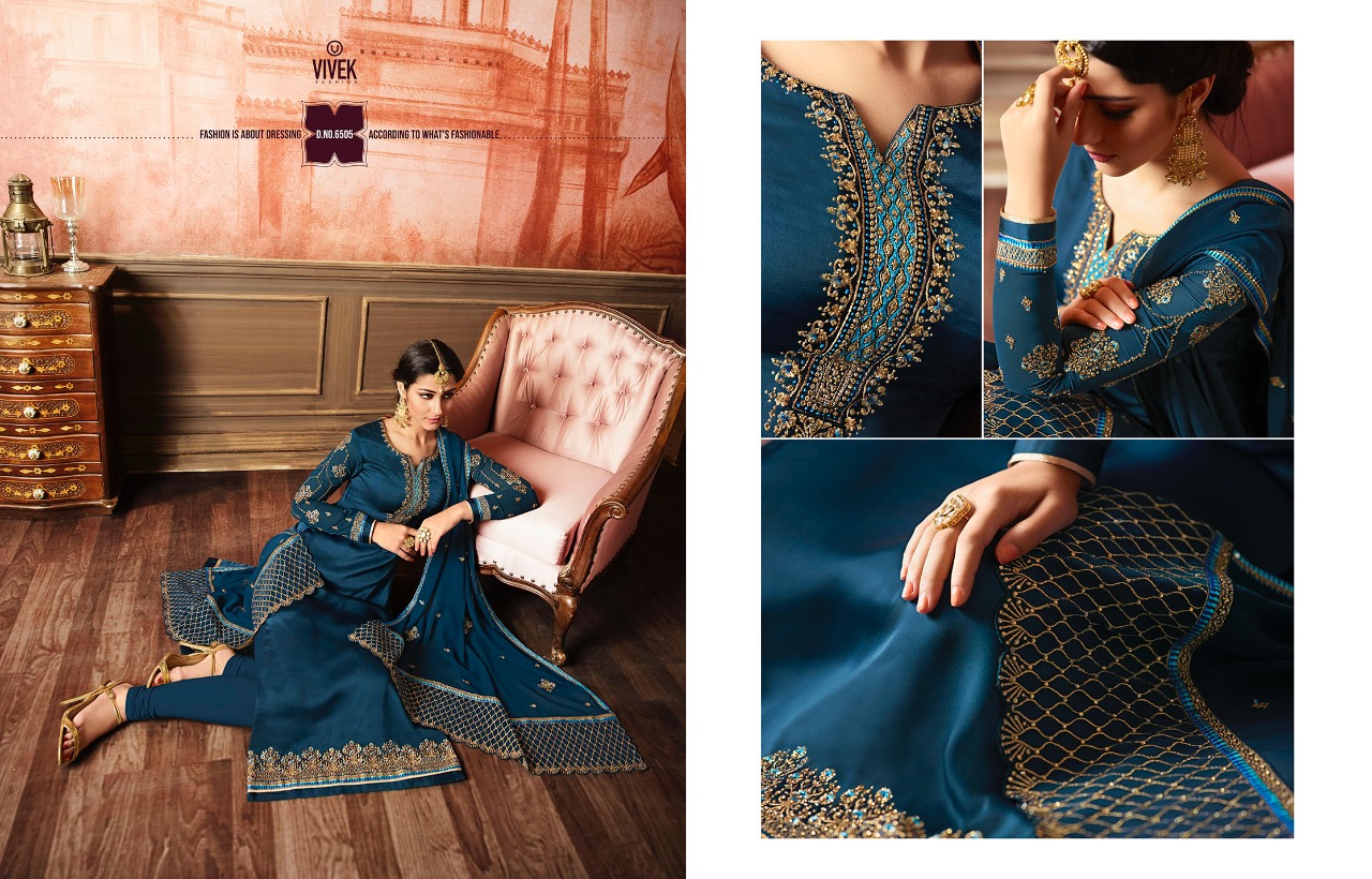 Buy Online Ameen By Vivek 6501 Series Designer Satin Georgette Salwar Kameez Catlog Wholesale Dealer Surat 8 Pcs of Full Catalogue at Wholesale Price. Looking for Ameen By Vivek 6501 Series Designer Satin Georgette Salwar Kameez Catlog Wholesale Dealer Surat Full Catalouge at Best Price? Buy Now Ameen By Vivek 6501 Series Designer Satin Georgette Salwar Kameez Catlog Wholesale Dealer Surat at Wholesale Rate of Rs 14000 with Total 8 Pcs from authroized dealer and supplier of VIVEK FASHION Brand. Cost of Each piece is just only Rs 1750 which is very low and affordable price to resale the product in your retail store ,This is Surat based Wholesale Supplier & Dealer of VIVEK FASHION Brand. Click on Brand name to Know more about VIVEK FASHION Brand's products.Call or Whatsapp on 9898838984 for booking or enquiry