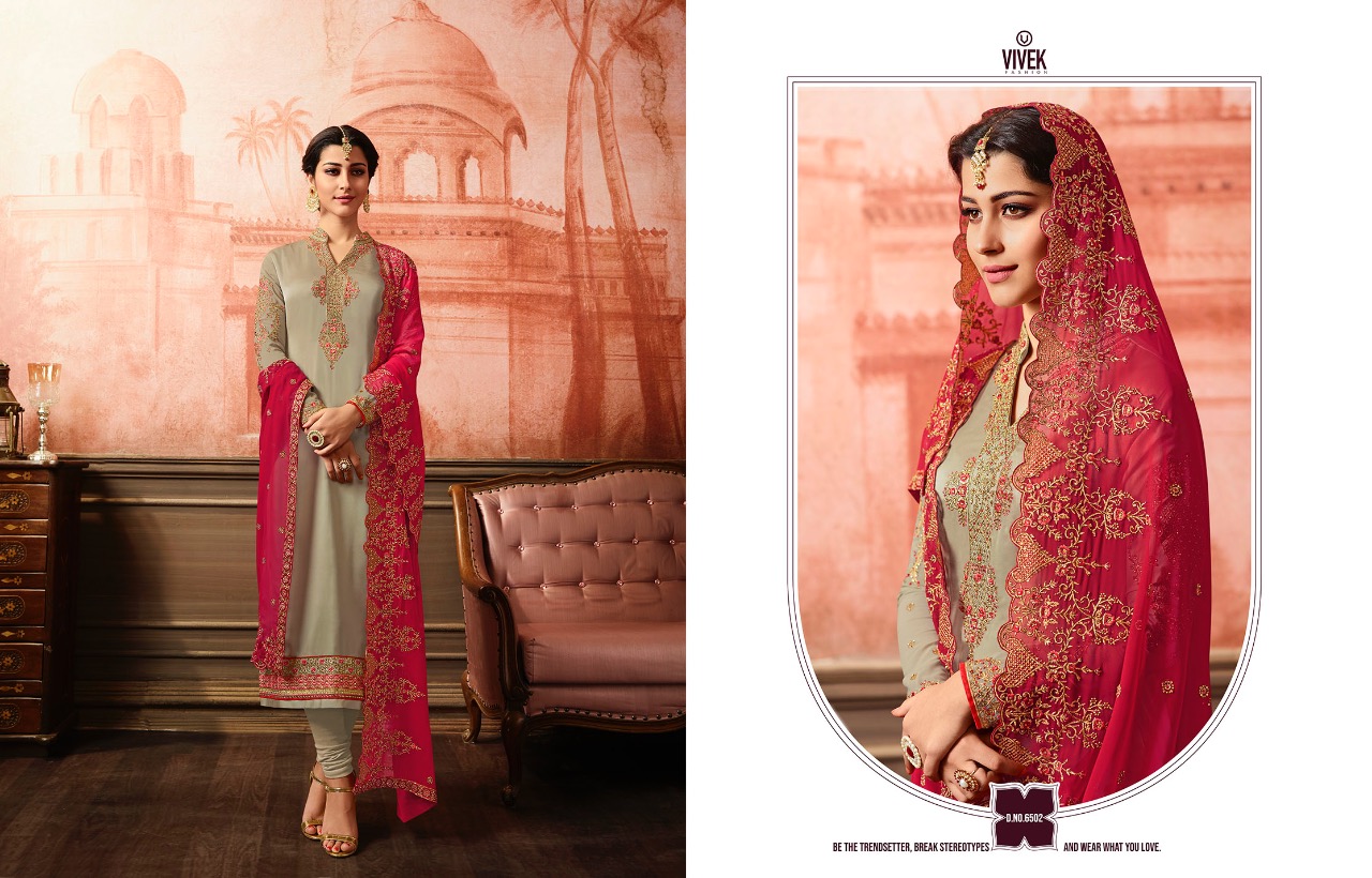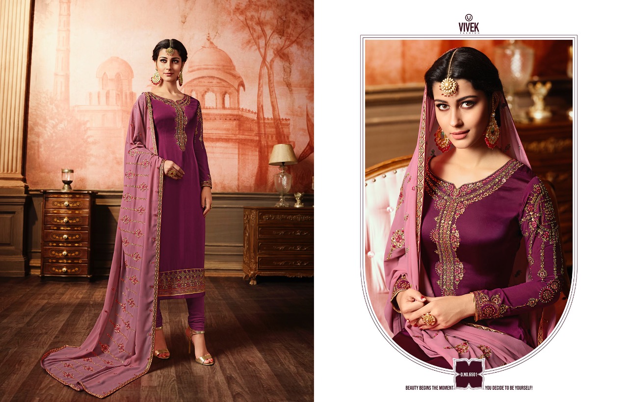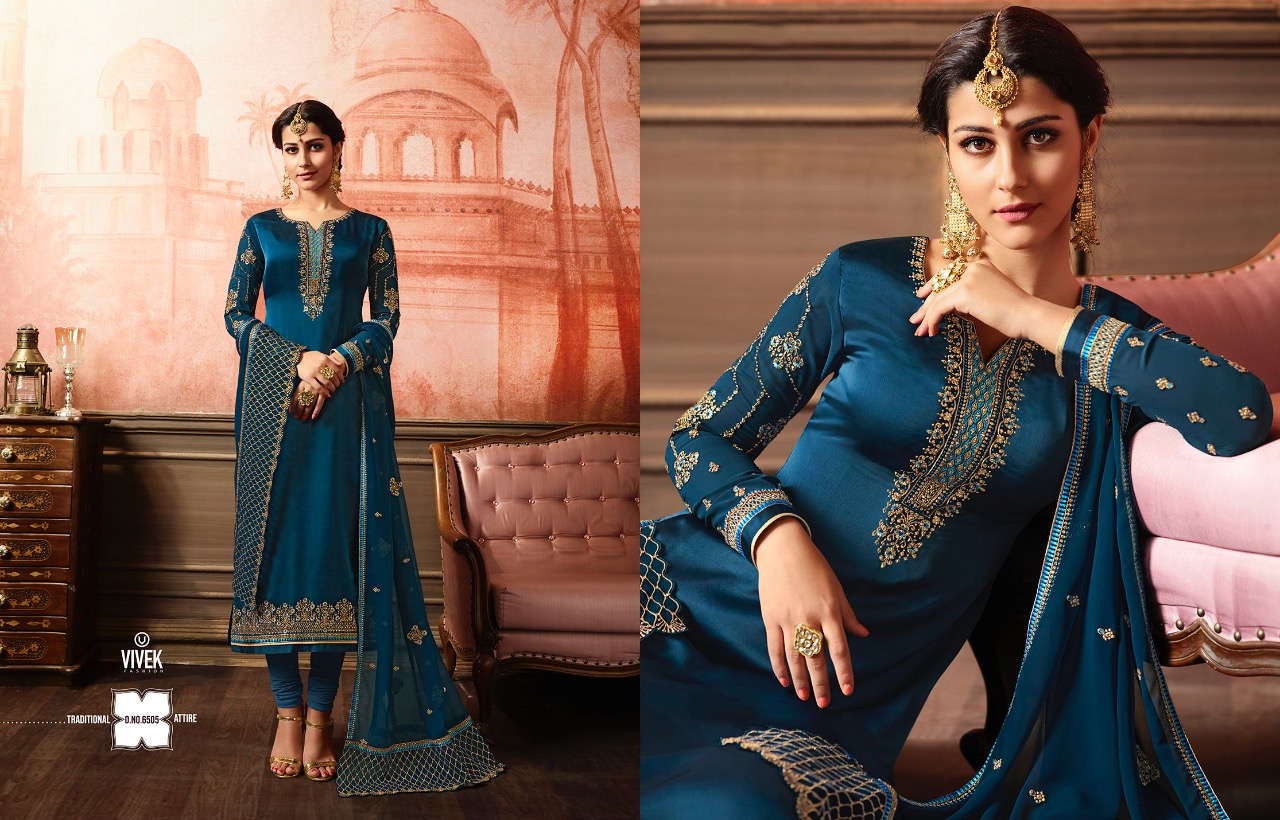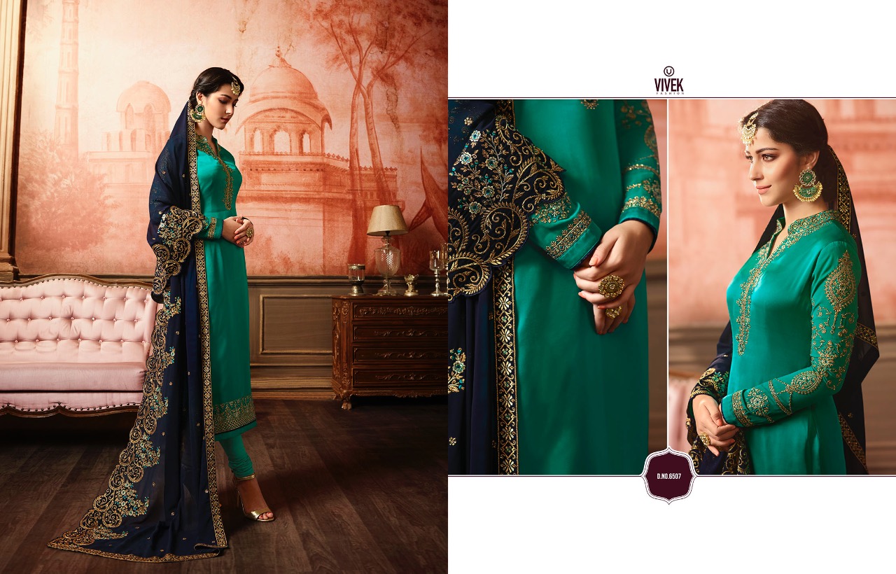 Buy Online Ameen By Vivek 6501 Series Designer Satin Georgette Salwar Kameez Catlog Wholesale Dealer Surat 8 Pcs of Full Catalogue at Wholesale Price. Looking for Ameen By Vivek 6501 Series Designer Satin Georgette Salwar Kameez Catlog Wholesale Dealer Surat Full Catalouge at Best Price? Buy Now Ameen By Vivek 6501 Series Designer Satin Georgette Salwar Kameez Catlog Wholesale Dealer Surat at Wholesale Rate of Rs 14000 with Total 8 Pcs from authroized dealer and supplier of VIVEK FASHION Brand. Cost of Each piece is just only Rs 1750 which is very low and affordable price to resale the product in your retail store ,This is Surat based Wholesale Supplier & Dealer of VIVEK FASHION Brand. Click on Brand name to Know more about VIVEK FASHION Brand's products.Call or Whatsapp on 9898838984 for booking or enquiry