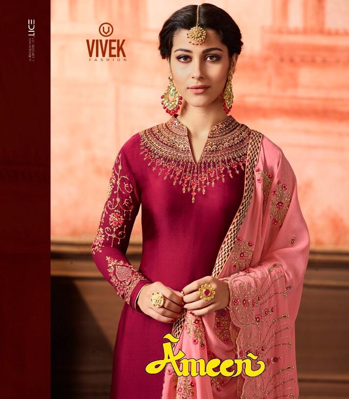 AMEEN by Vivek . Set to set . GST 5 Percent Extra. Fabrics detail TOP :- satin georgette DUPATTA :- georgette with work BOTTOM :- dull santoon Delivery 2 days |