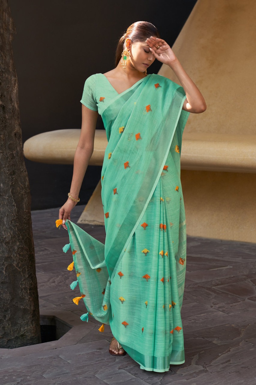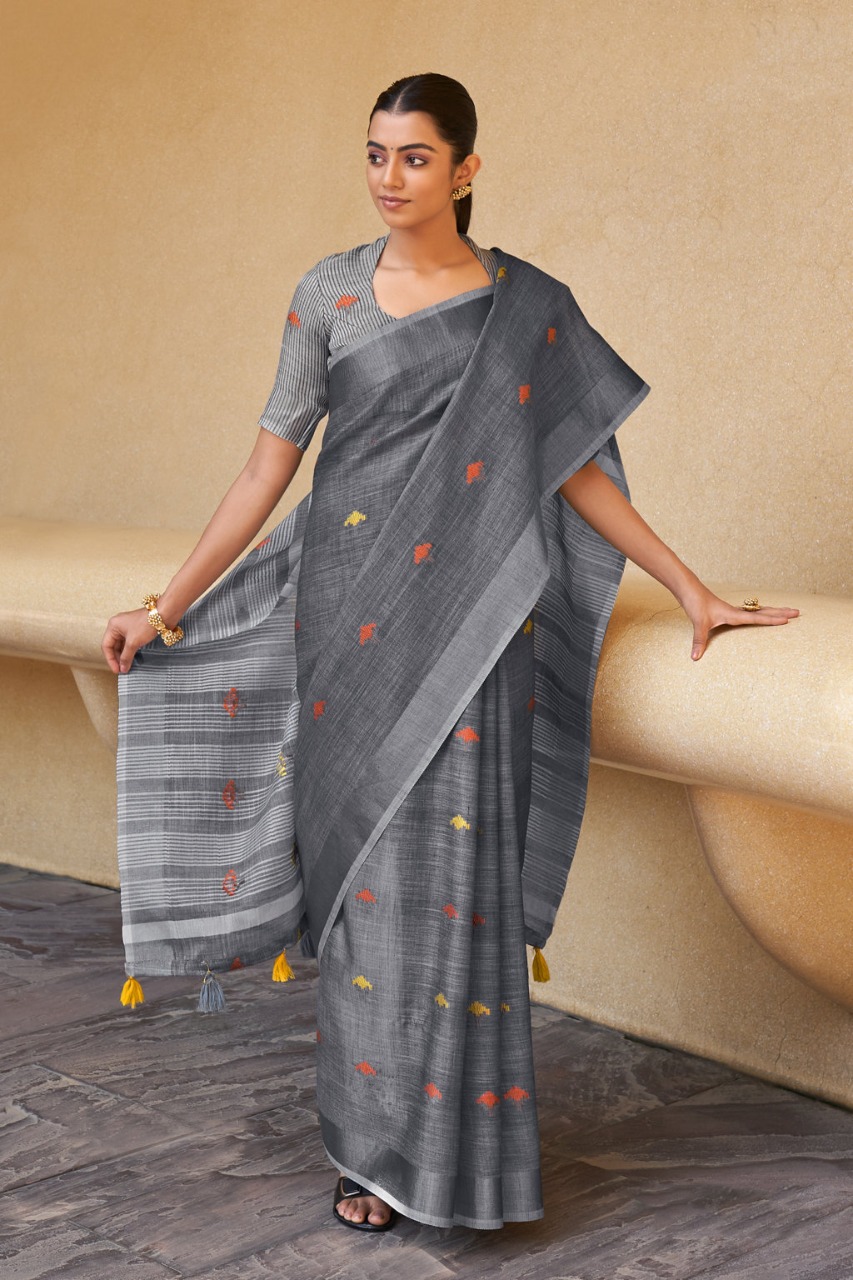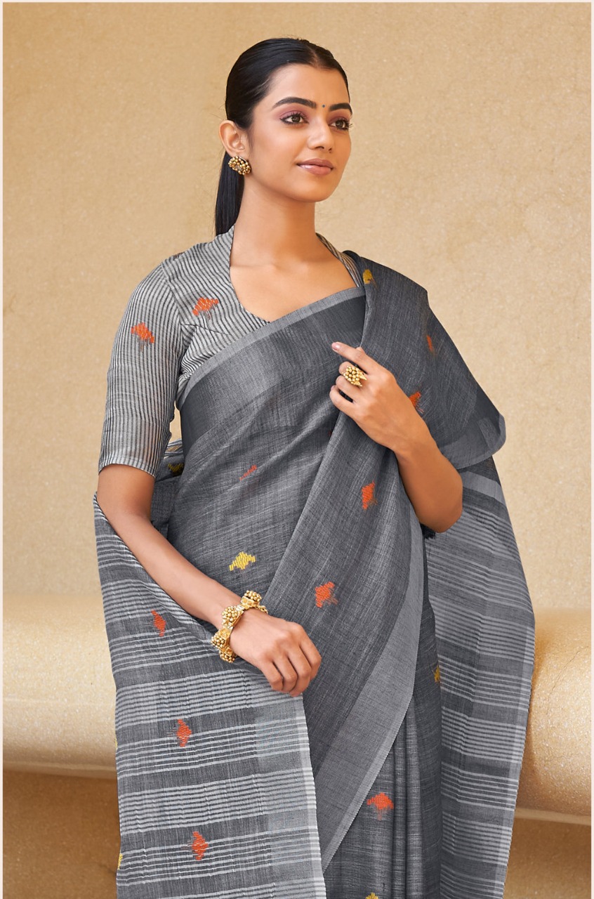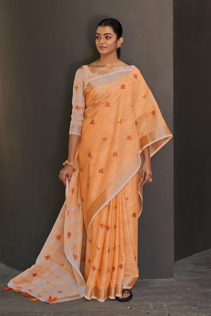 *_New Catalog Launching_* Catalog Name: *_Ameera_* Brand: *_Sangam Prints_* Product Type: Saree Fabric: Linen Price Per Piece: 985/- Gst Extra: 5% Work: Thread Work Other Specifications: Tassel Saree Saree Mtr: 5.5 Mtr Blouse: 0.8 Mtr Total Pcs: 8 *_Book your orders now_* Single 1085+gst |