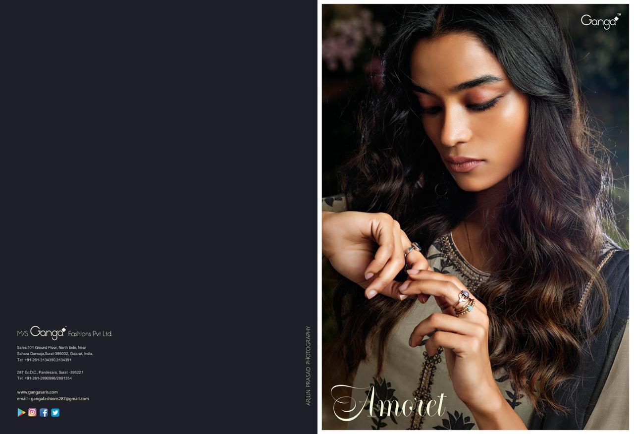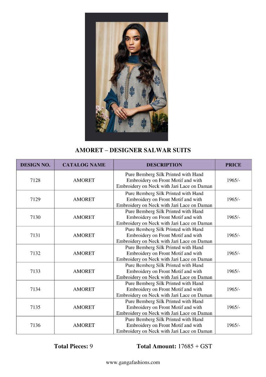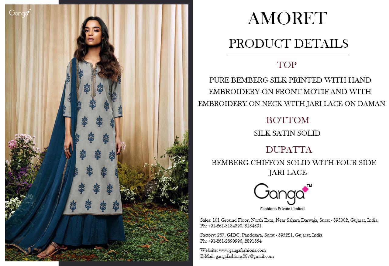 *GANGA* Presents its latest catalogue *AMORET* *Top *: pure bemberg silk printed with hand work and embroidery work on front with jari lace on daman *Bot * :Silk satin solid *Dup* : Bemberg chiffon solid with four side jari lace *RATE* : 1965? *DSN * : 09 *GST* : 05% *DEL* : Tomorow |