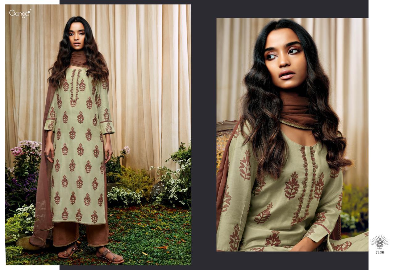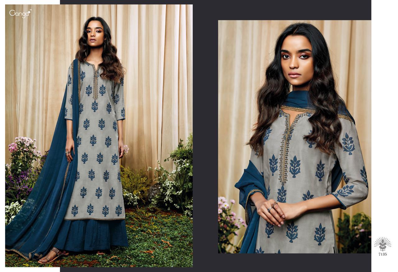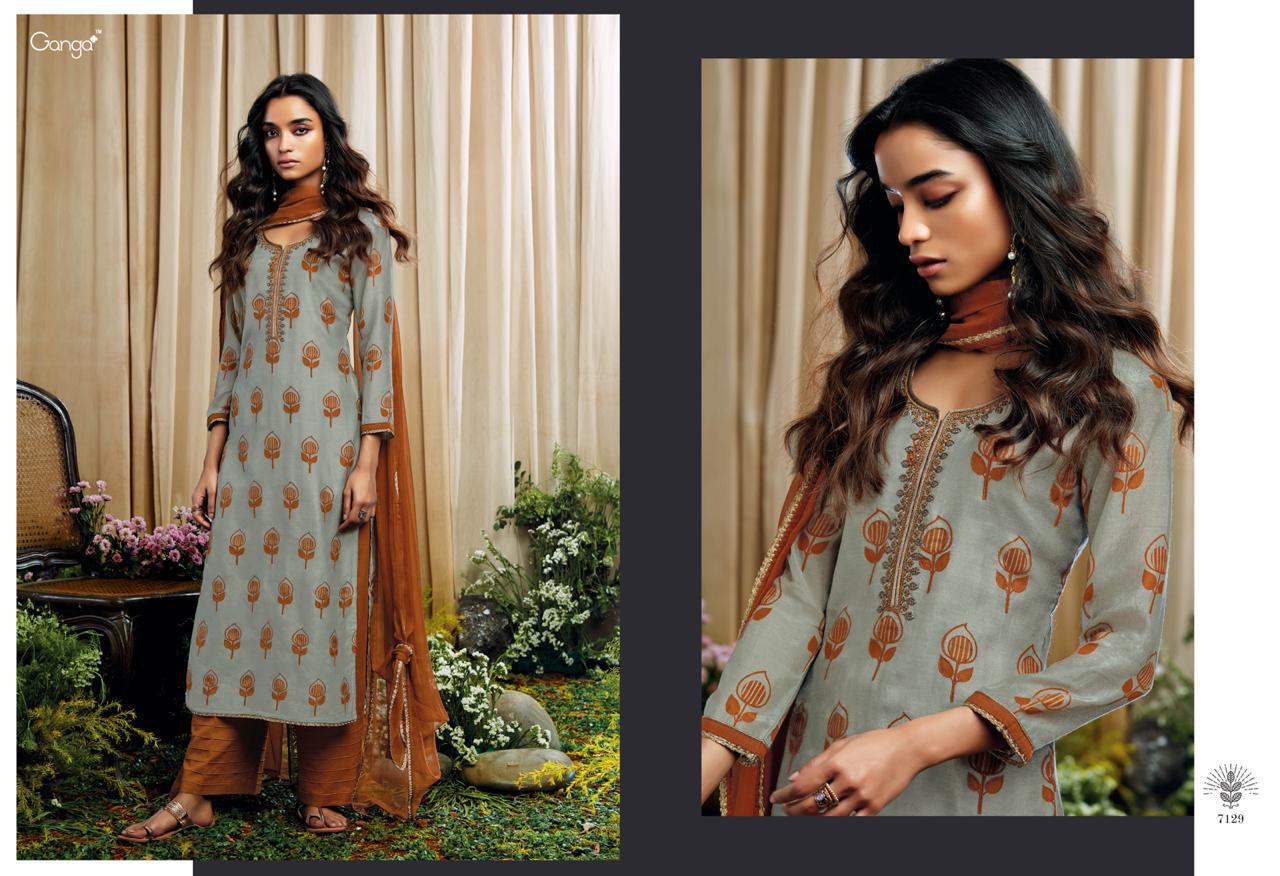 *GANGA* Presents its latest catalogue *AMORET* *Top *: pure bemberg silk printed with hand work and embroidery work on front with jari lace on daman *Bot * :Silk satin solid *Dup* : Bemberg chiffon solid with four side jari lace *RATE* : 1965? *DSN * : 09 *GST* : 05% *DEL* : Tomorow |