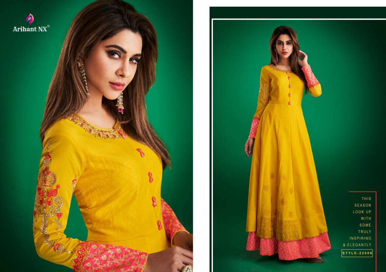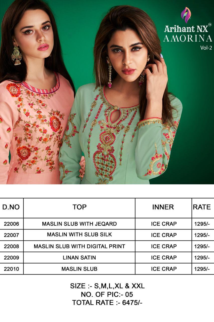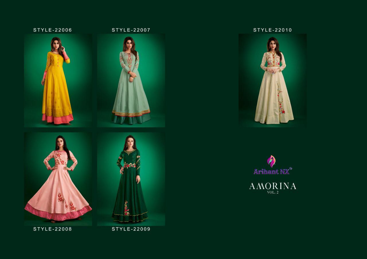 Buy Online Amorina Vol 2 By Arihant Nx Series 22006 To 22010 Masline Slub Designer Party Wear Gowns Wholesale Supplier Gujarat 5 Pcs of Full Catalogue at Wholesale Price. Looking for Amorina Vol 2 By Arihant Nx Series 22006 To 22010 Masline Slub Designer Party Wear Gowns Wholesale Supplier Gujarat Full Catalouge at Best Price? Buy Now Amorina Vol 2 By Arihant Nx Series 22006 To 22010 Masline Slub Designer Party Wear Gowns Wholesale Supplier Gujarat at Wholesale Rate of Rs 6475 with Total 5 Pcs from authroized dealer and supplier of ARIHANT NX Brand. Cost of Each piece is just only Rs 1295 which is very low and affordable price to resale the product in your retail store ,This is Surat based Wholesale Supplier & Dealer of ARIHANT NX Brand. Click on Brand name to Know more about ARIHANT NX Brand's products.Call or Whatsapp on 9898838984 for booking or enquiry