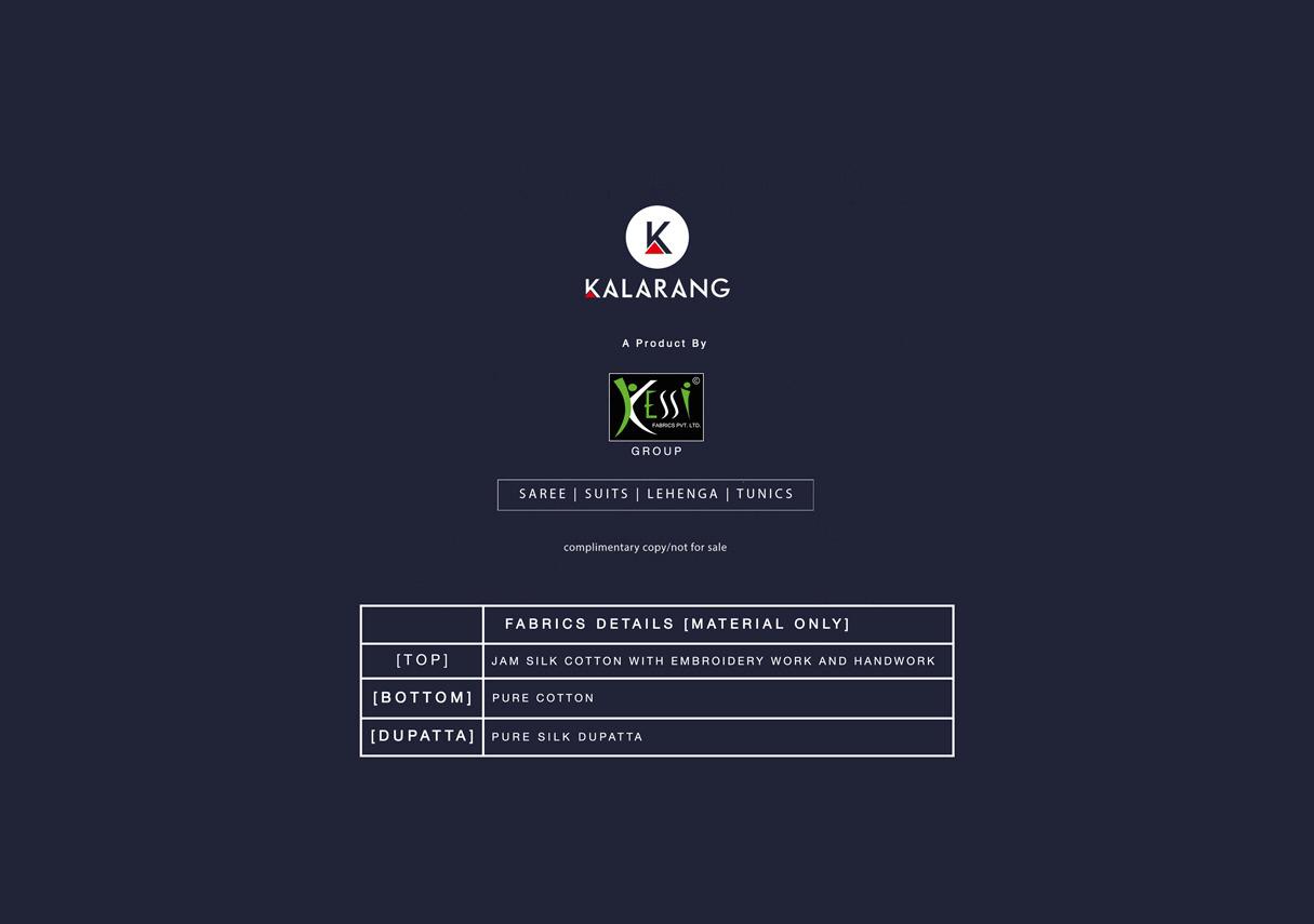 ? *Kalarang.* has launched _Catalog name_ : *AMRUT* ? _Fabric Details_ ? ?Top :- PURE JAM SILK COTTON WITH EMBROIDERY WORK AND HAND WORK ?Bottom:- PURE COTTON ?Dupatta:- PURE SILK DUPATTA ?Total Design :- 4 ?Dispatching 5 to 6 days later ?Booking started from now... ?Order yours soon Rate 825 per Pcs . Set To Set. GST 5 Percent Extra |