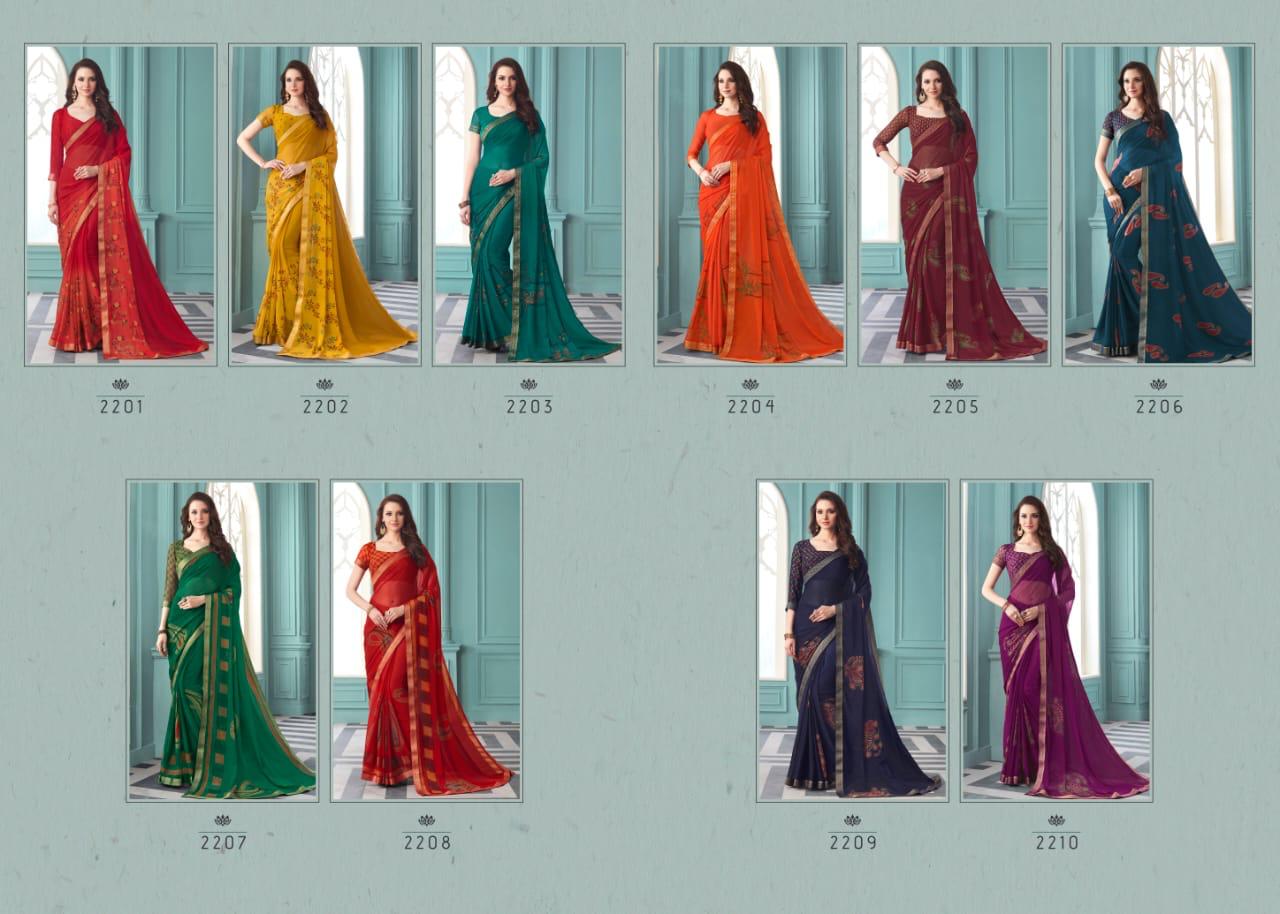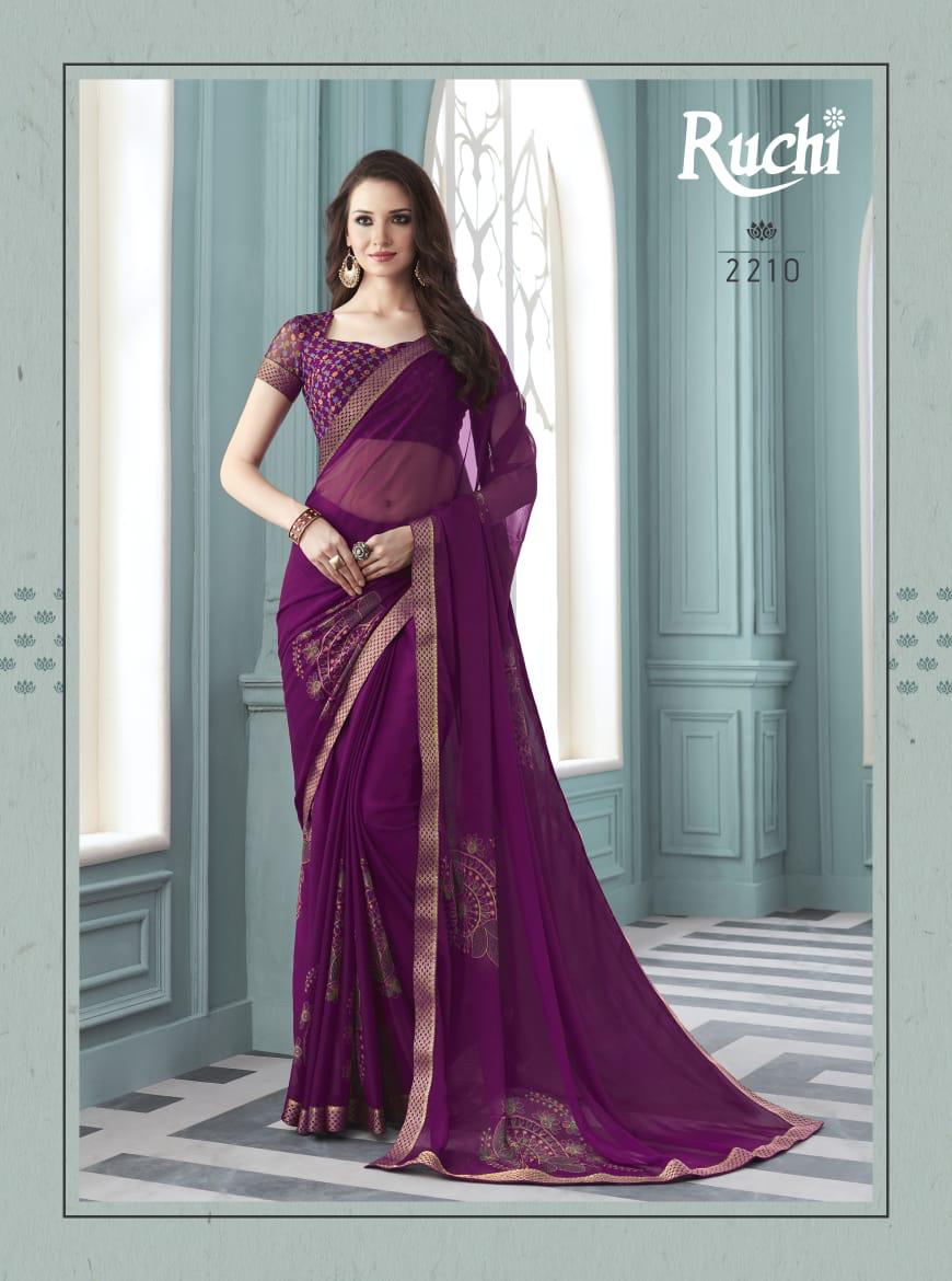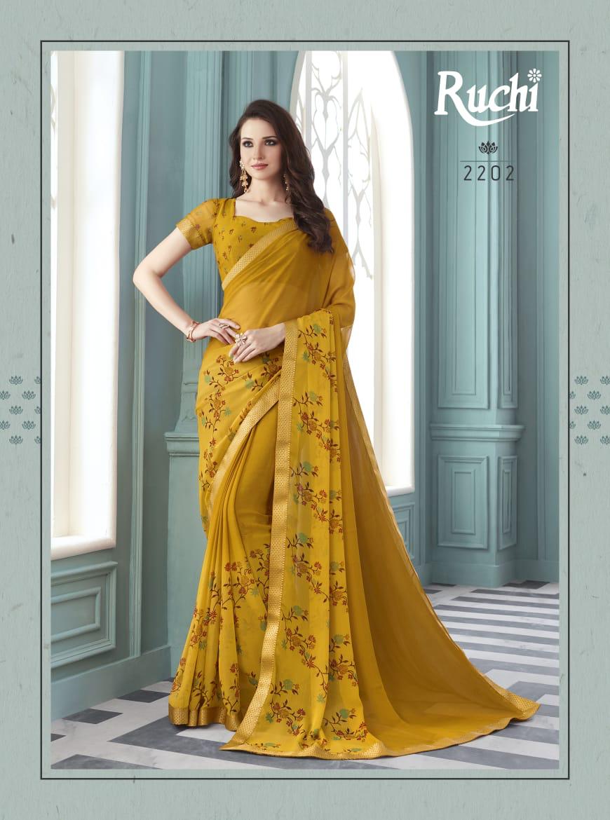 RUCHI SAREES 1). CATALOG- AMRUT. 2). FABRIC- PURE CHIFFON. 3). PCS.- 10. 4). SETWISE PACKING ONLY. 5).rate - 565 per pcs . 6). Set to set. 7). GST 5 Percent Extra. Delivery from today |