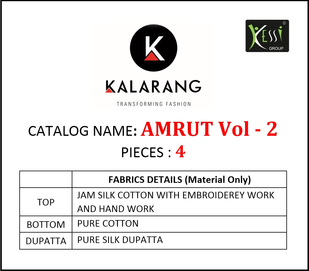 Buy Online Amrut Vol 2 By Kalarang Jam Cotton Dress Materials Wholesale Supplier Surat 4 Pcs of Full Catalogue at Wholesale Price. Looking for Amrut Vol 2 By Kalarang Jam Cotton Dress Materials Wholesale Supplier Surat Full Catalouge at Best Price? Buy Now Amrut Vol 2 By Kalarang Jam Cotton Dress Materials Wholesale Supplier Surat at Wholesale Rate of Rs 3596 with Total 4 Pcs from authroized dealer and supplier of KALARANG Brand. Cost of Each piece is just only Rs 899 which is very low and affordable price to resale the product in your retail store ,This is Surat based Wholesale Supplier & Dealer of KALARANG Brand. Click on Brand name to Know more about KALARANG Brand's products.Call or Whatsapp on 9898838984 for booking or enquiry