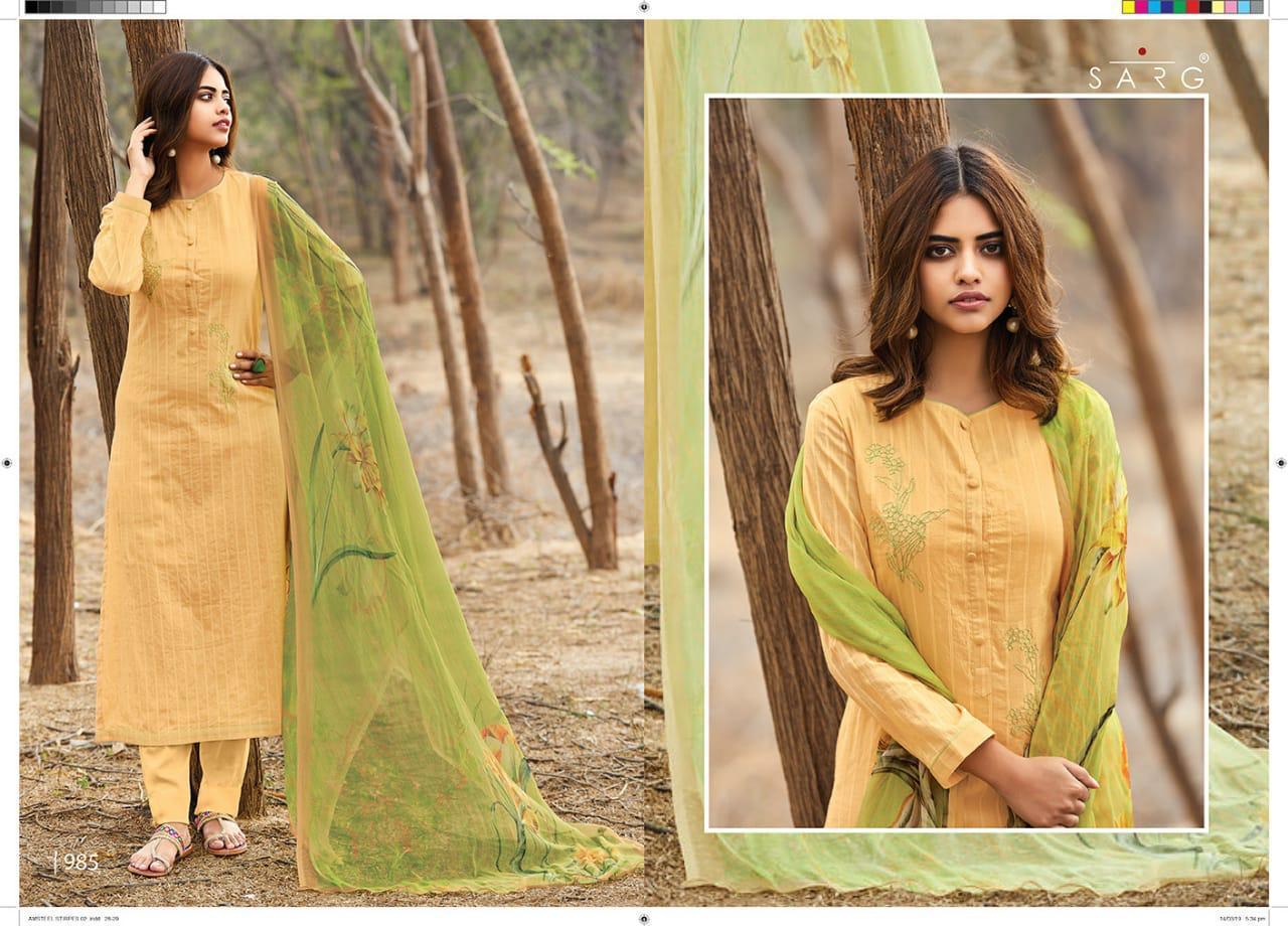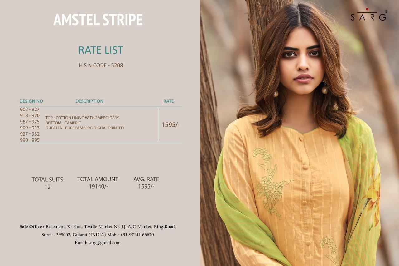 Buy Online Amstel Stripe By Sarg Sahiba Fancy Cotton Lining Salwar Kameez Collection Wholesaler Surat 12 Pcs of Full Catalogue at Wholesale Price. Looking for Amstel Stripe By Sarg Sahiba Fancy Cotton Lining Salwar Kameez Collection Wholesaler Surat Full Catalouge at Best Price? Buy Now Amstel Stripe By Sarg Sahiba Fancy Cotton Lining Salwar Kameez Collection Wholesaler Surat at Wholesale Rate of Rs 19140 with Total 12 Pcs from authroized dealer and supplier of SARG Brand. Cost of Each piece is just only Rs 1595 which is very low and affordable price to resale the product in your retail store ,This is Surat based Wholesale Supplier & Dealer of SARG Brand. Click on Brand name to Know more about SARG Brand's products.Call or Whatsapp on 9898838984 for booking or enquiry