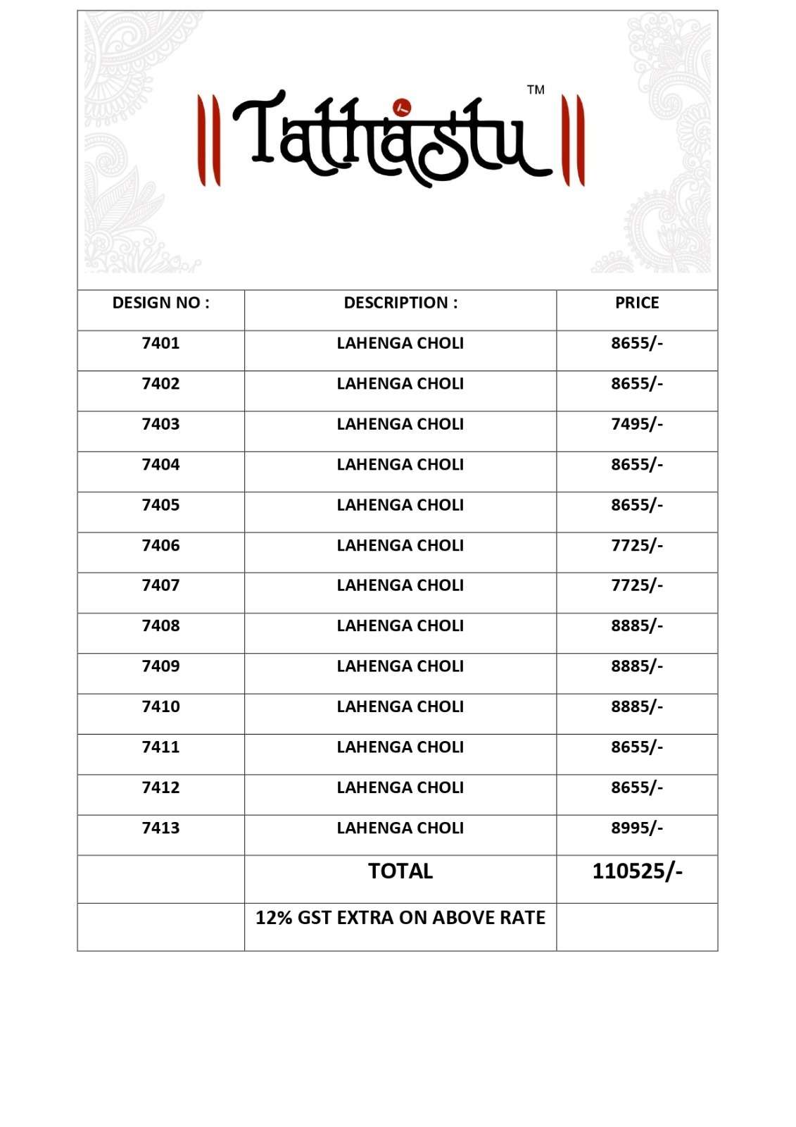 Buy Online ANAARA 7400 SERIES By TATHASTU lehenga choli collection manufacturer surat 7 Pcs of Full Catalogue at Wholesale Price. Looking for ANAARA 7400 SERIES By TATHASTU lehenga choli collection manufacturer surat Full Catalouge at Best Price? Buy Now ANAARA 7400 SERIES By TATHASTU lehenga choli collection manufacturer surat at Wholesale Rate of Rs 0 with Total 7 Pcs from authroized dealer and supplier of TATHASTU Brand. Cost of Each piece is just only Rs 0 which is very low and affordable price to resale the product in your retail store ,This is Surat based Wholesale Supplier & Dealer of TATHASTU Brand. Click on Brand name to Know more about TATHASTU Brand's products.Call or Whatsapp on 9898838984 for booking or enquiry
