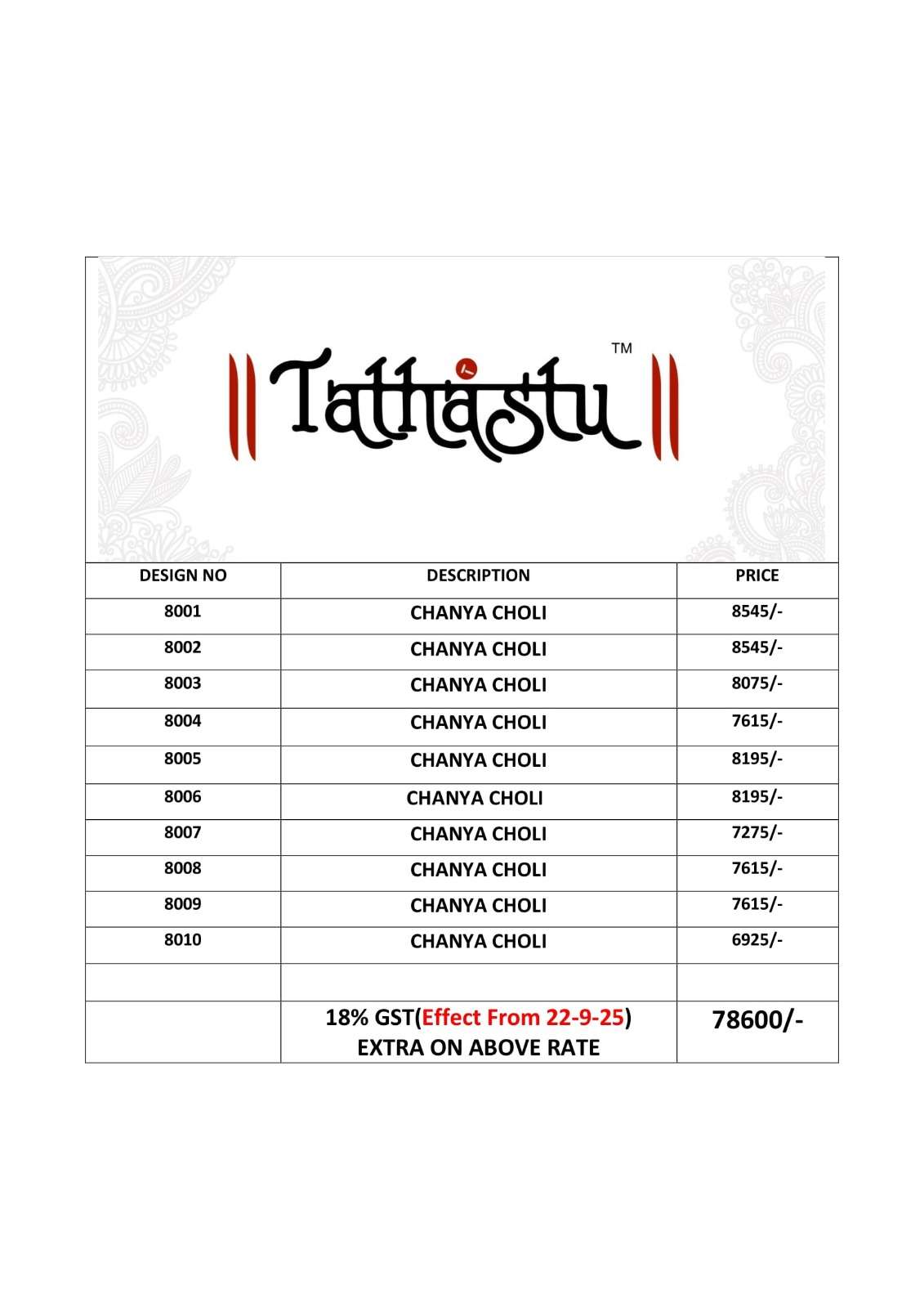 Buy Online Anaara by Tathastu saree Collection manufacturer surat 8 Pcs of Full Catalogue at Wholesale Price. Looking for Anaara by Tathastu saree Collection manufacturer surat Full Catalouge at Best Price? Buy Now Anaara by Tathastu saree Collection manufacturer surat at Wholesale Rate of Rs 0 with Total 8 Pcs from authroized dealer and supplier of BRAND'S Brand. Cost of Each piece is just only Rs 0 which is very low and affordable price to resale the product in your retail store ,This is Surat based Wholesale Supplier & Dealer of BRAND'S Brand. Click on Brand name to Know more about BRAND'S Brand's products.Call or Whatsapp on 9898838984 for booking or enquiry