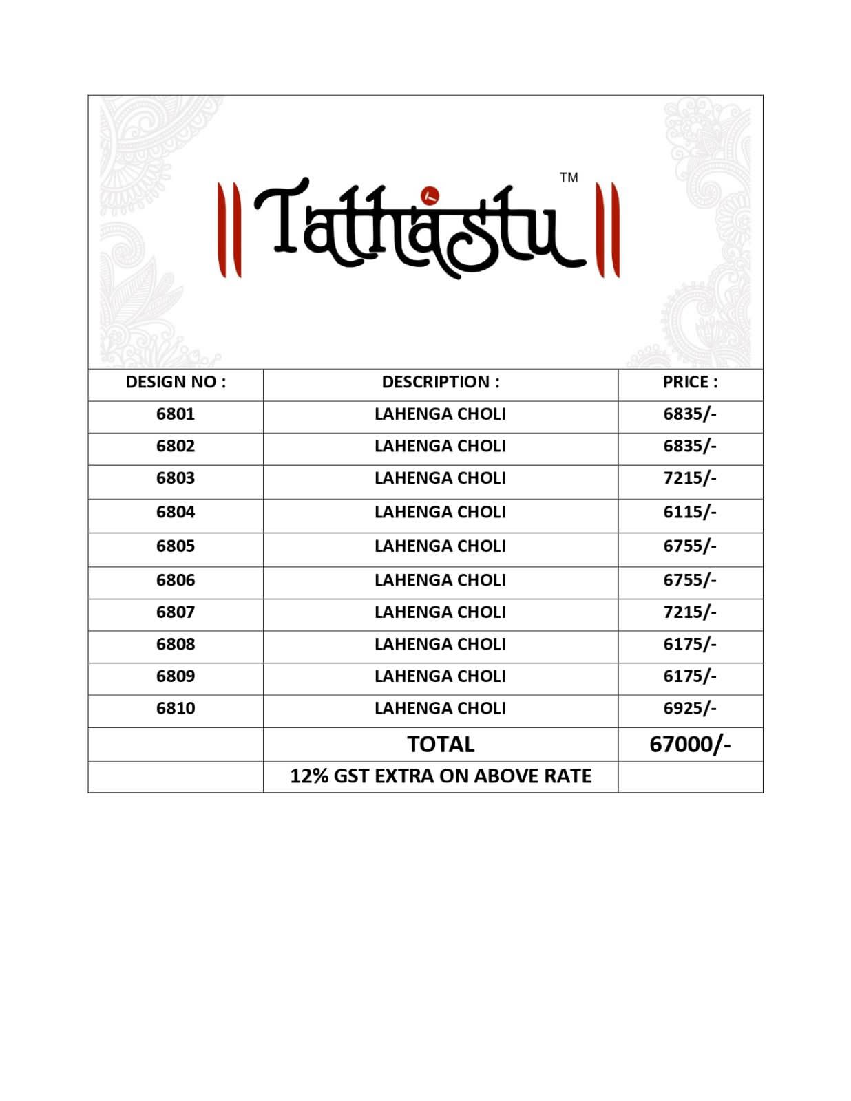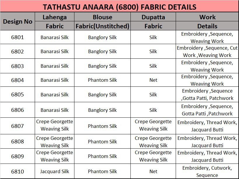 Buy Online Anaara Series 6801 To 6810 By Tathastu Designer Lehenga Choli Collection Manufacturer Surat 10 Pcs of Full Catalogue at Wholesale Price. Looking for Anaara Series 6801 To 6810 By Tathastu Designer Lehenga Choli Collection Manufacturer Surat Full Catalouge at Best Price? Buy Now Anaara Series 6801 To 6810 By Tathastu Designer Lehenga Choli Collection Manufacturer Surat at Wholesale Rate of Rs 0 with Total 10 Pcs from authroized dealer and supplier of TATHASTU Brand. Cost of Each piece is just only Rs 0 which is very low and affordable price to resale the product in your retail store ,This is Surat based Wholesale Supplier & Dealer of TATHASTU Brand. Click on Brand name to Know more about TATHASTU Brand's products.Call or Whatsapp on 9898838984 for booking or enquiry