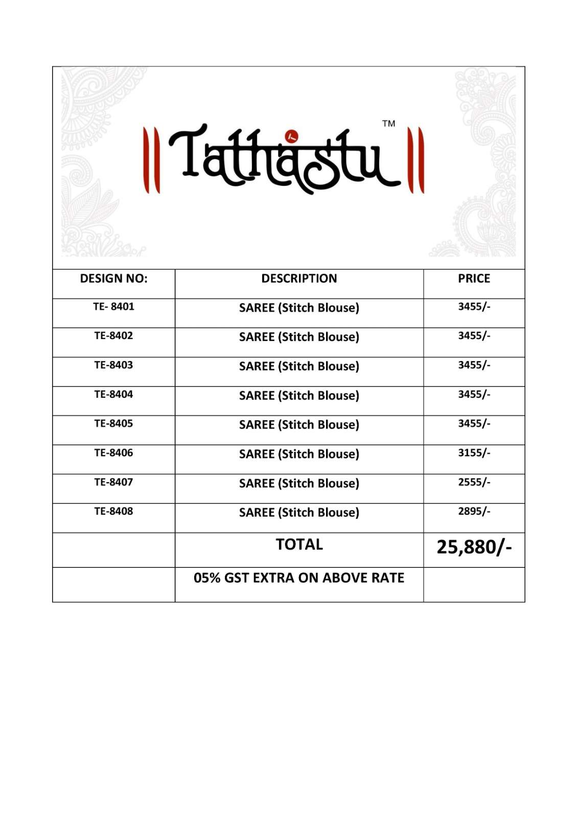 Buy Online Anaara Series 8401 To 8408 By Tathastu saree Collection manufacturer surat 8 Pcs of Full Catalogue at Wholesale Price. Looking for Anaara Series 8401 To 8408 By Tathastu saree Collection manufacturer surat Full Catalouge at Best Price? Buy Now Anaara Series 8401 To 8408 By Tathastu saree Collection manufacturer surat at Wholesale Rate of Rs 0 with Total 8 Pcs from authroized dealer and supplier of TATHASTU Brand. Cost of Each piece is just only Rs 0 which is very low and affordable price to resale the product in your retail store ,This is Surat based Wholesale Supplier & Dealer of TATHASTU Brand. Click on Brand name to Know more about TATHASTU Brand's products.Call or Whatsapp on 9898838984 for booking or enquiry