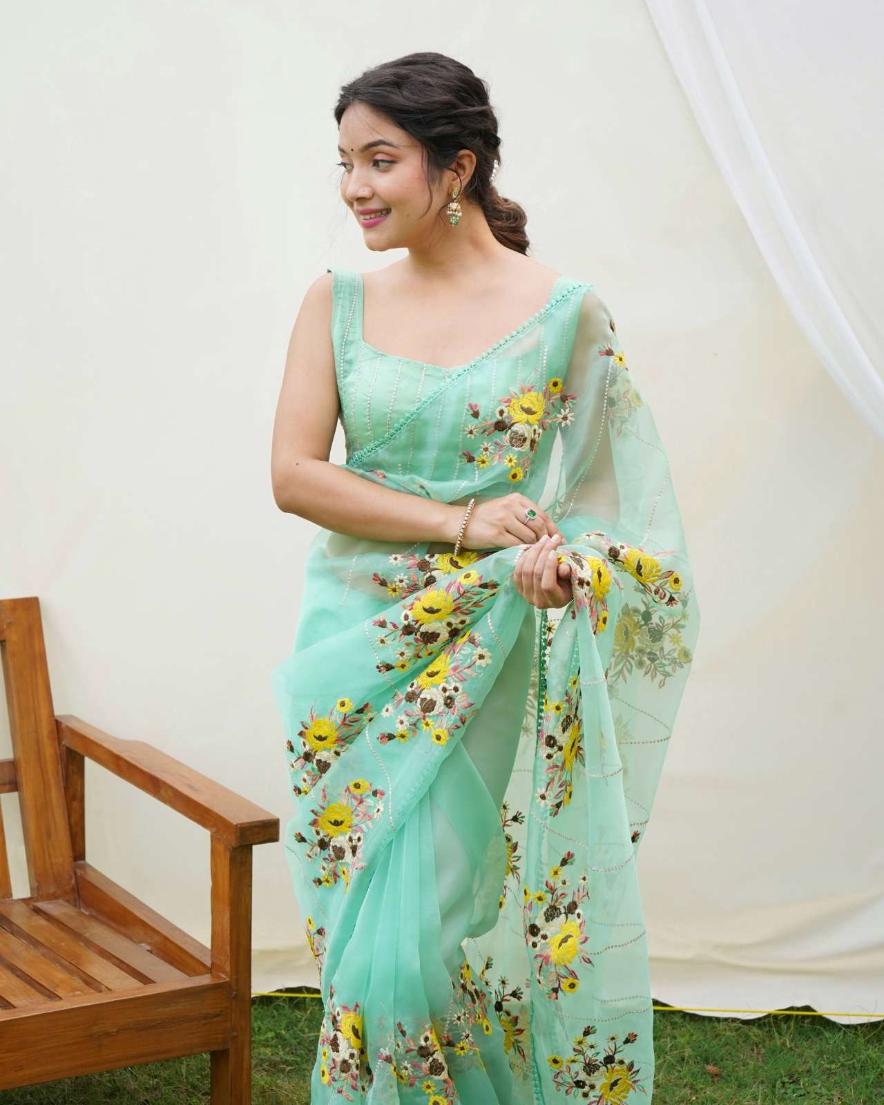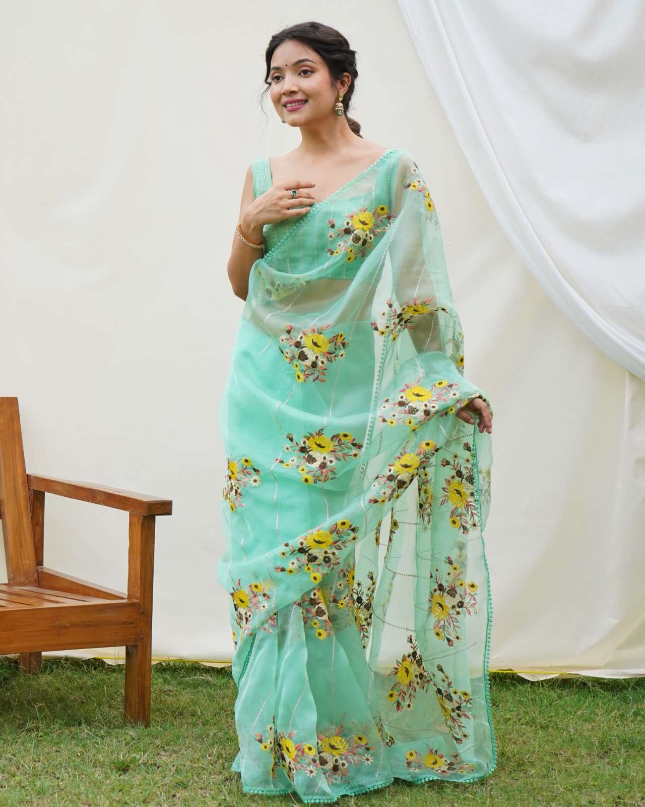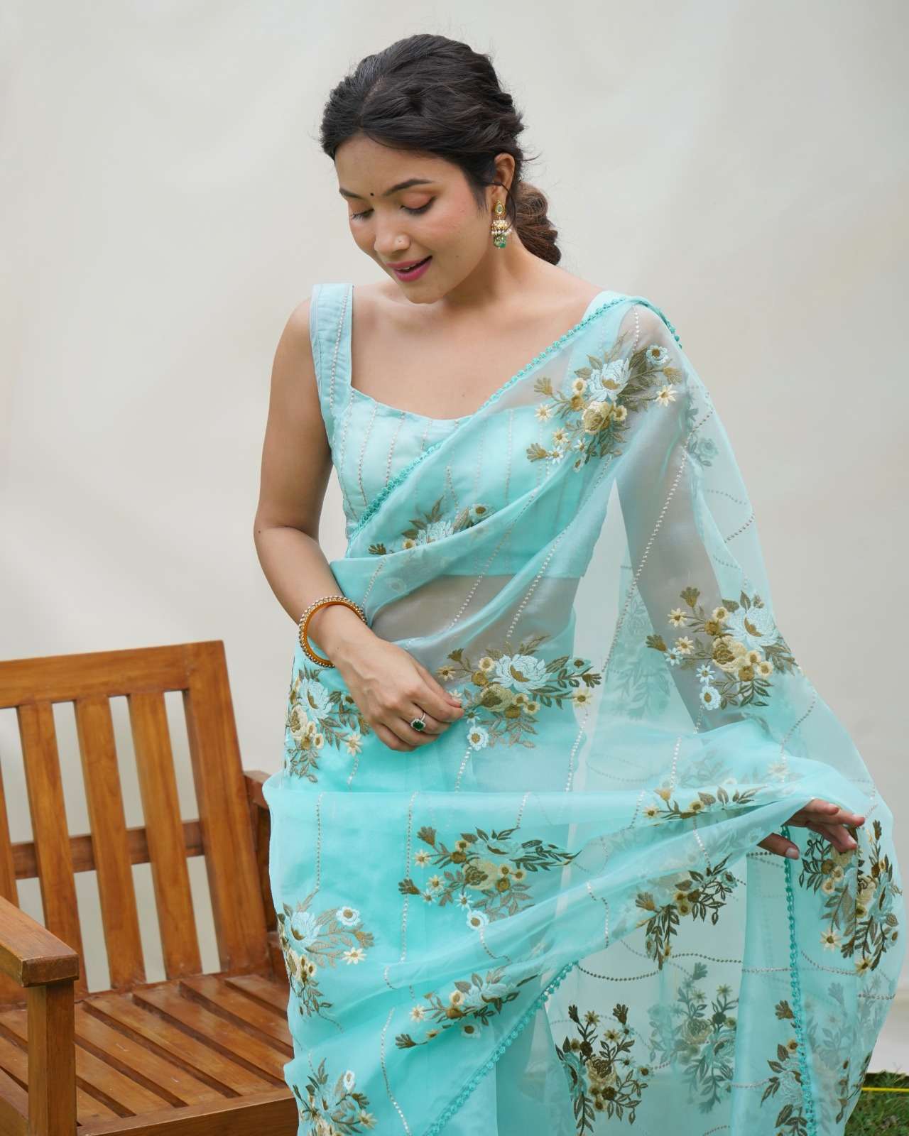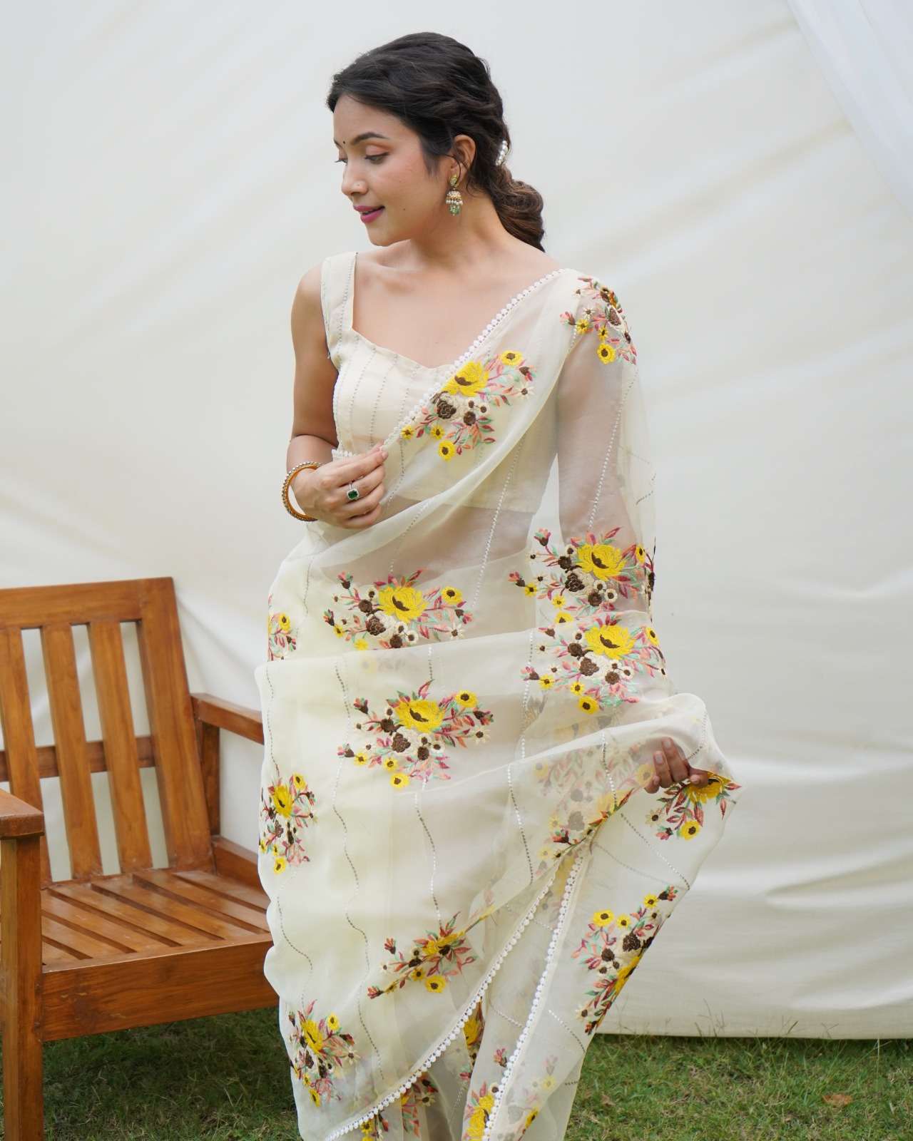 Catalog Name : *Anamika* No of Pcs : 4 Fabric : Organza Silk Work : Embroidery Work Border - Dyable Lace border Blouse Fabric - Silk Organza Blouse - Unstitched