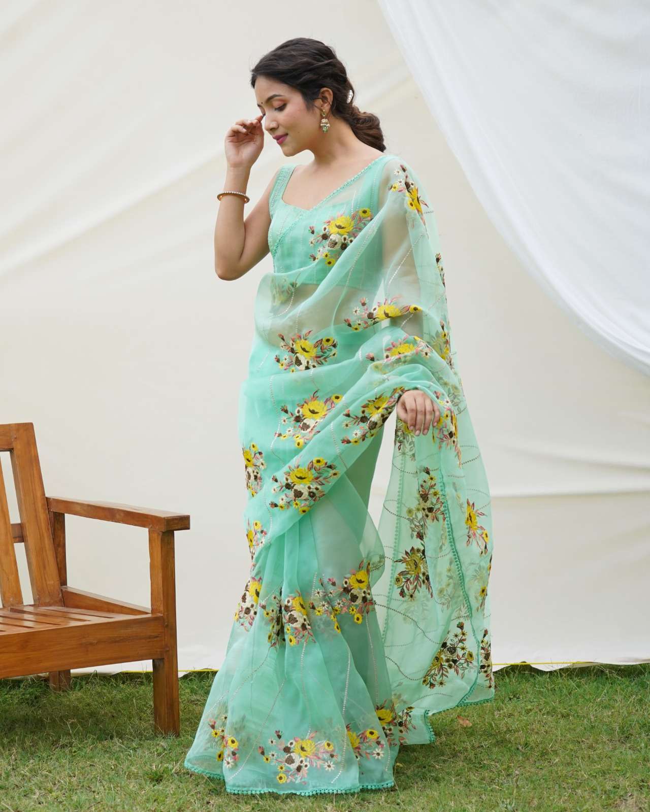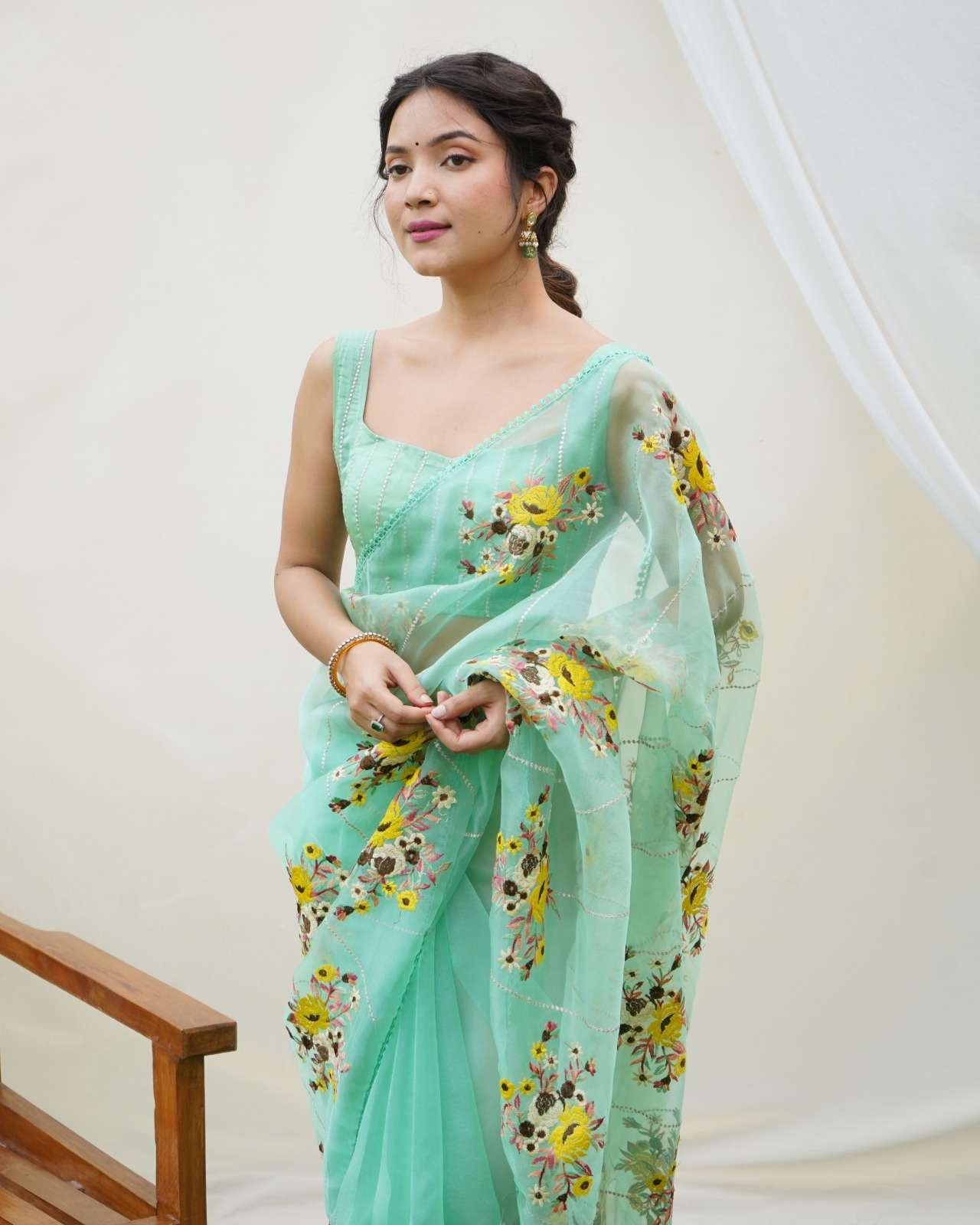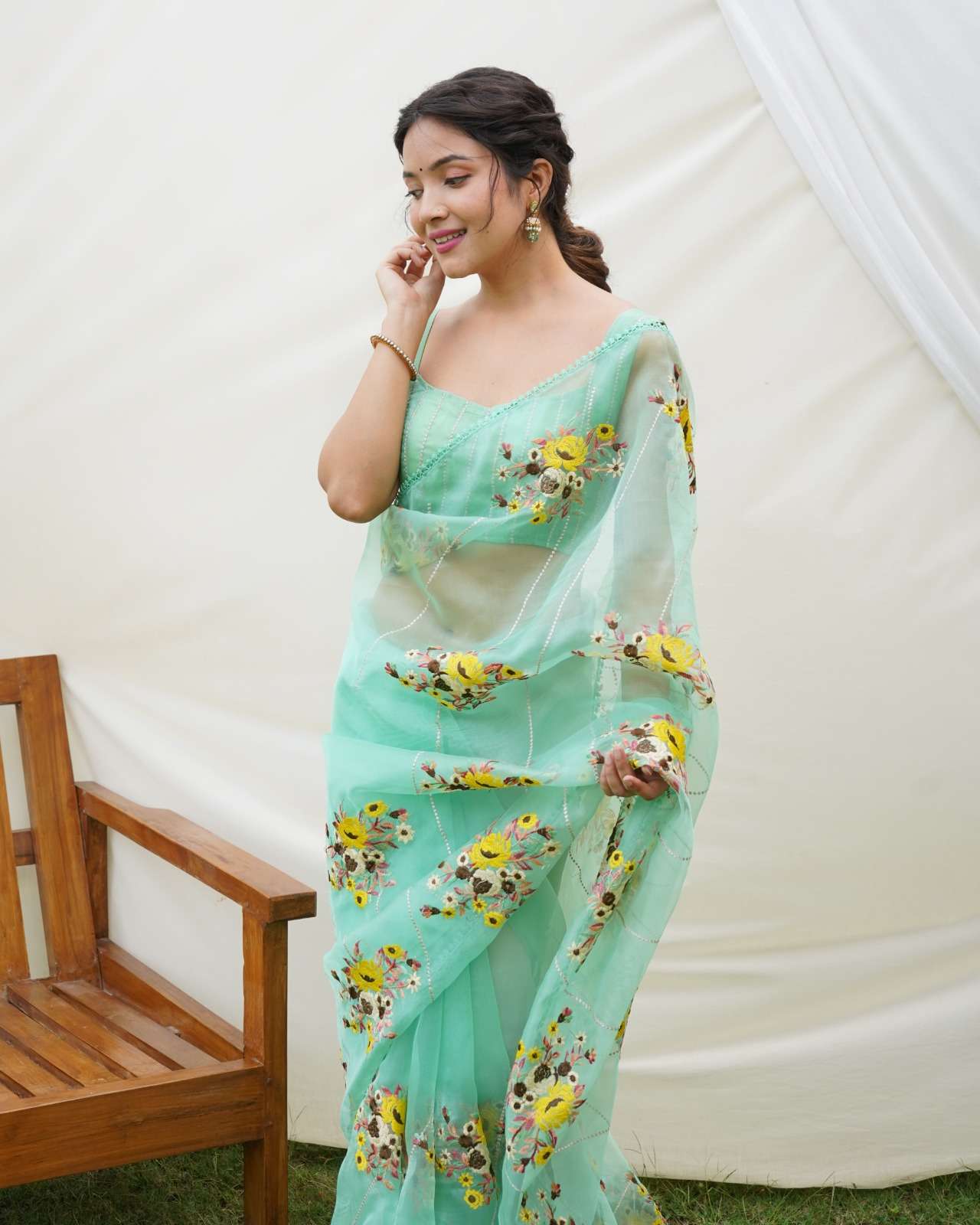 Catalog Name : *Anamika* No of Pcs : 4 Fabric : Organza Silk Work : Embroidery Work Border - Dyable Lace border Blouse Fabric - Silk Organza Blouse - Unstitched