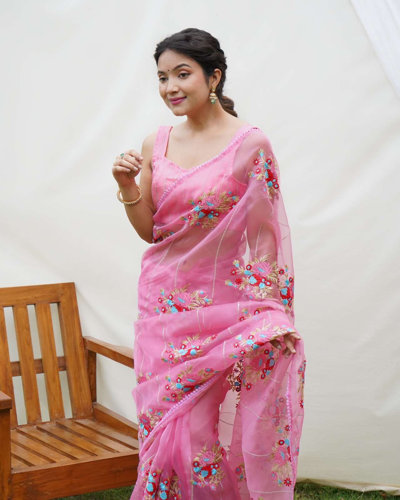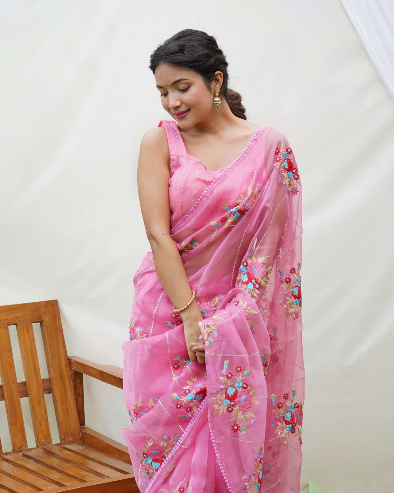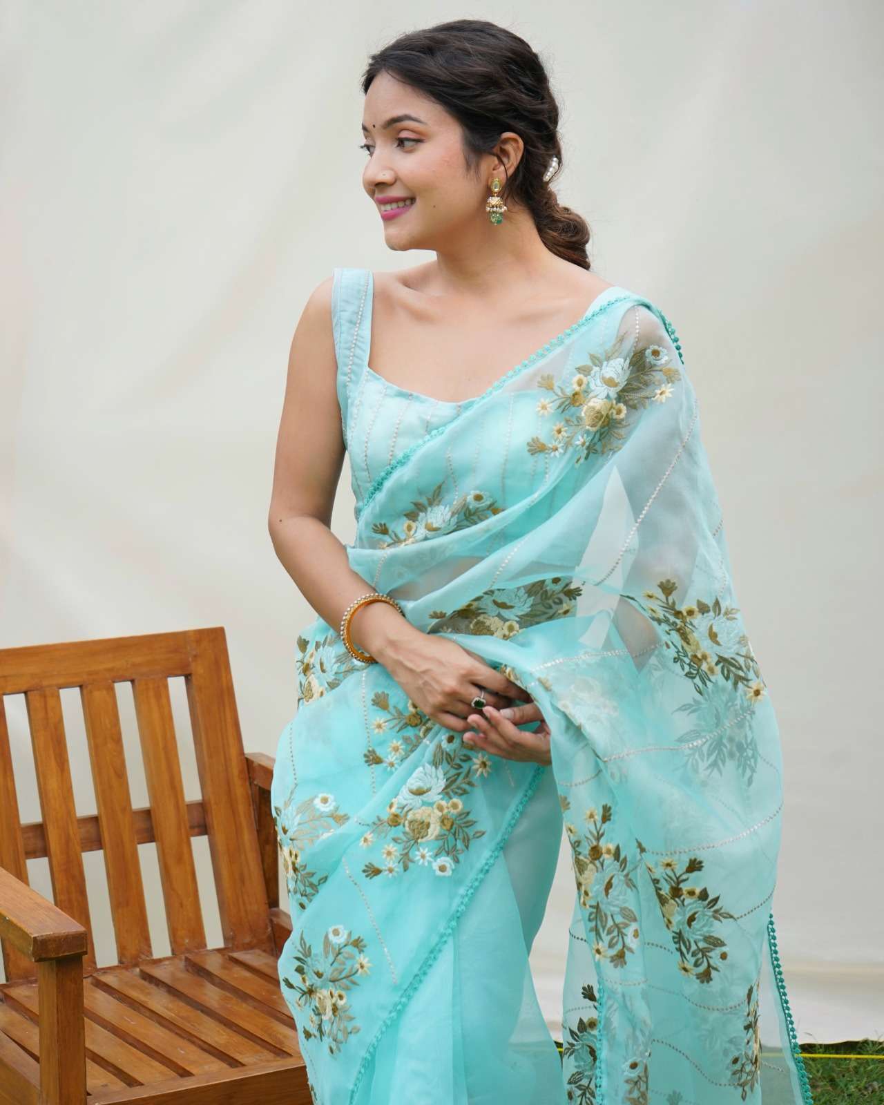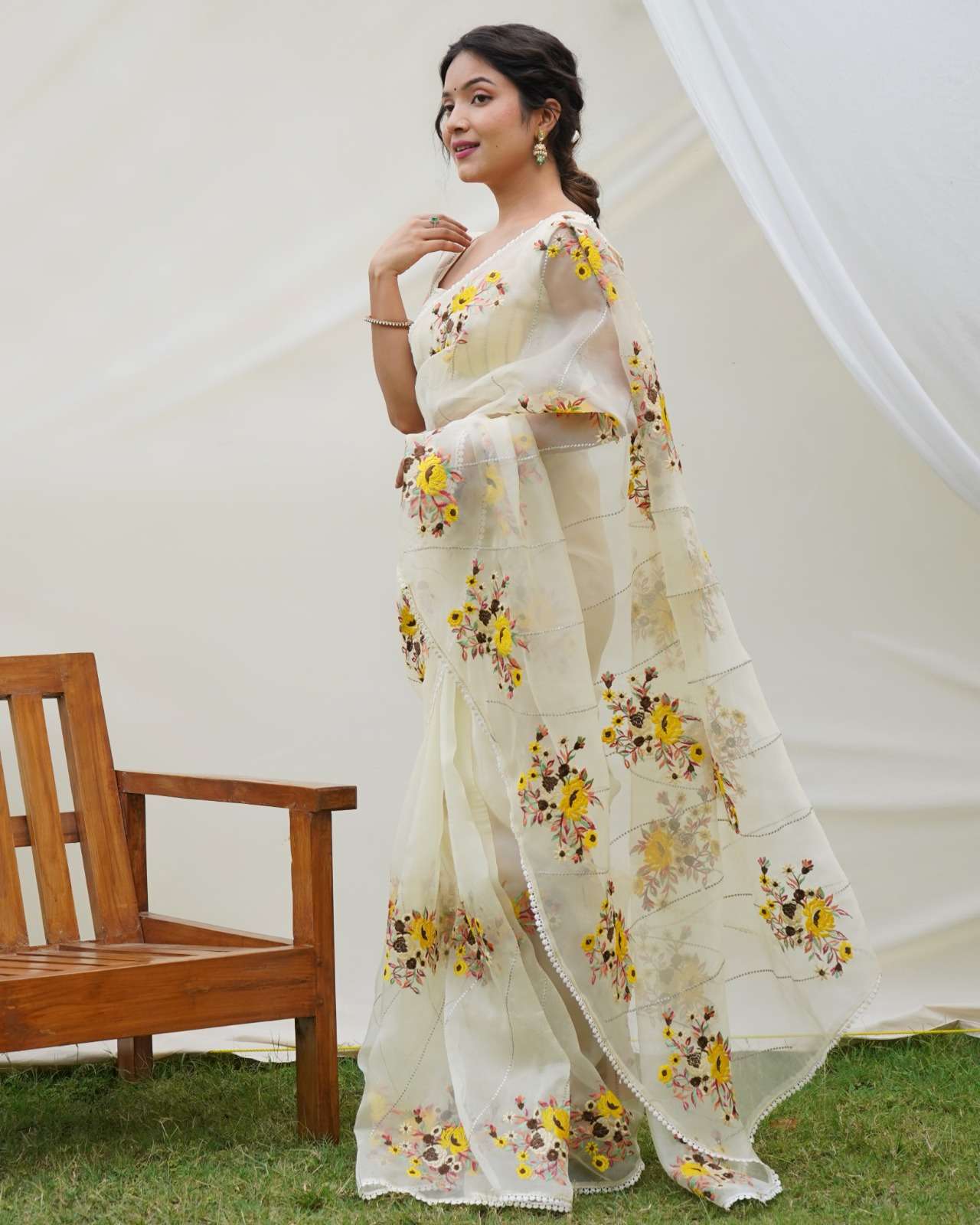 Catalog Name : *Anamika* No of Pcs : 4 Fabric : Organza Silk Work : Embroidery Work Border - Dyable Lace border Blouse Fabric - Silk Organza Blouse - Unstitched