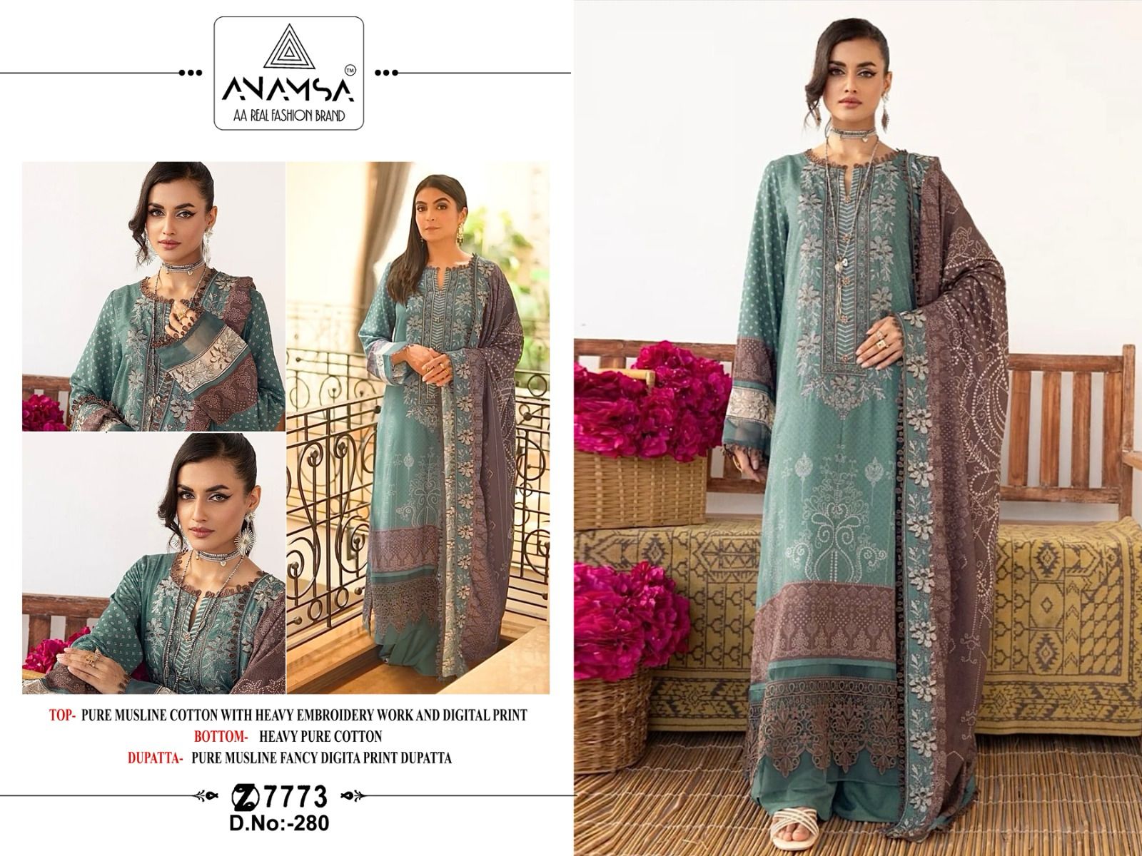Buy Online Anamsa 280 Pure Cotton Suits Eid Collection Surat 5 Pcs of Full Catalogue at Wholesale Price. Looking for Anamsa 280 Pure Cotton Suits Eid Collection Surat Full Catalouge at Best Price? Buy Now Anamsa 280 Pure Cotton Suits Eid Collection Surat at Wholesale Rate of Rs 4745 with Total 5 Pcs from authroized dealer and supplier of Brand. Cost of Each piece is just only Rs 949 which is very low and affordable price to resale the product in your retail store ,This is Surat based Wholesale Supplier & Dealer of Brand. Click on Brand name to Know more about Brand's products.Call or Whatsapp on 9898838984 for booking or enquiry