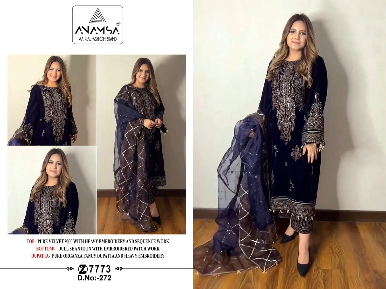 Buy Online Anamsa D No 272 Pure Velvet Embroidery Work Designer Suits 5 Pcs of Full Catalogue at Wholesale Price. Looking for Anamsa D No 272 Pure Velvet Embroidery Work Designer Suits Full Catalouge at Best Price? Buy Now Anamsa D No 272 Pure Velvet Embroidery Work Designer Suits at Wholesale Rate of Rs 6250 with Total 5 Pcs from authroized dealer and supplier of Brand. Cost of Each piece is just only Rs 1250 which is very low and affordable price to resale the product in your retail store ,This is Surat based Wholesale Supplier & Dealer of Brand. Click on Brand name to Know more about Brand's products.Call or Whatsapp on 9898838984 for booking or enquiry