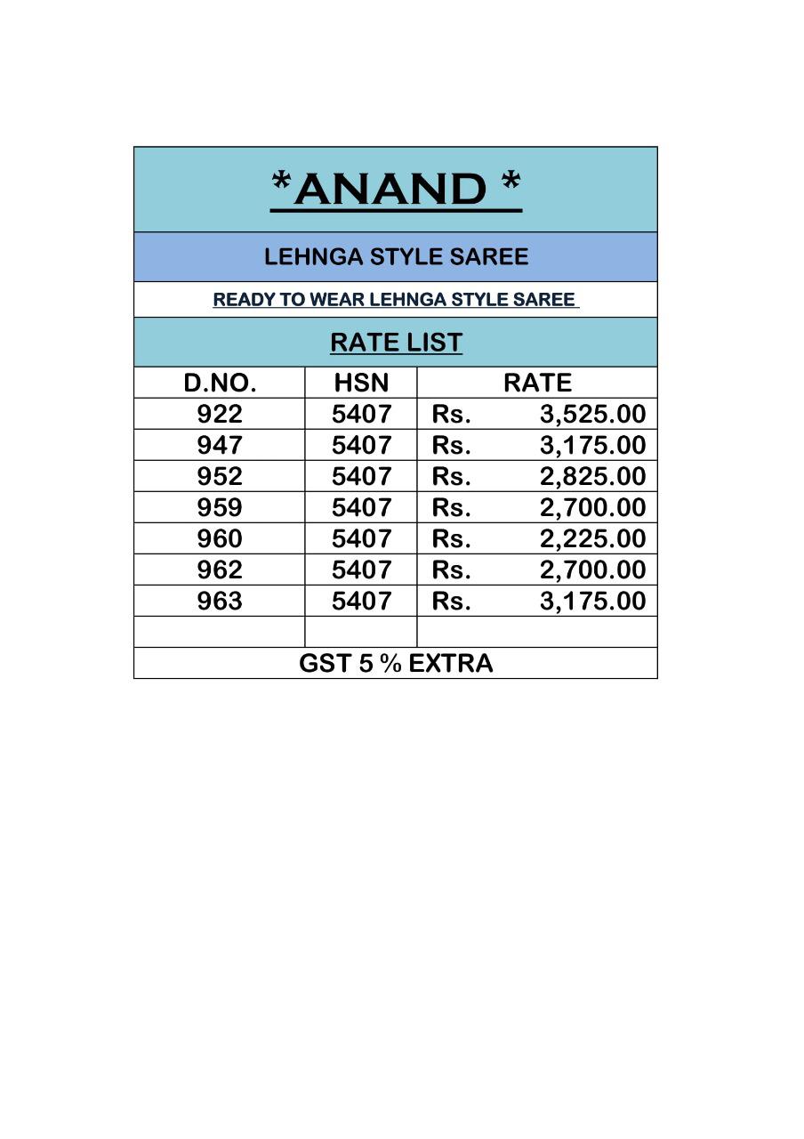 Buy Online Anand Series 5407 Lehnga Style Sarees Collection Wholesale Supplier And Dealer Surat 0 Pcs of Full Catalogue at Wholesale Price. Looking for Anand Series 5407 Lehnga Style Sarees Collection Wholesale Supplier And Dealer Surat Full Catalouge at Best Price? Buy Now Anand Series 5407 Lehnga Style Sarees Collection Wholesale Supplier And Dealer Surat at Wholesale Rate of Rs 0 with Total 0 Pcs from authroized dealer and supplier of Brand. Cost of Each piece is just only Rs 0 which is very low and affordable price to resale the product in your retail store ,This is Surat based Wholesale Supplier & Dealer of Brand. Click on Brand name to Know more about Brand's products.Call or Whatsapp on 9898838984 for booking or enquiry