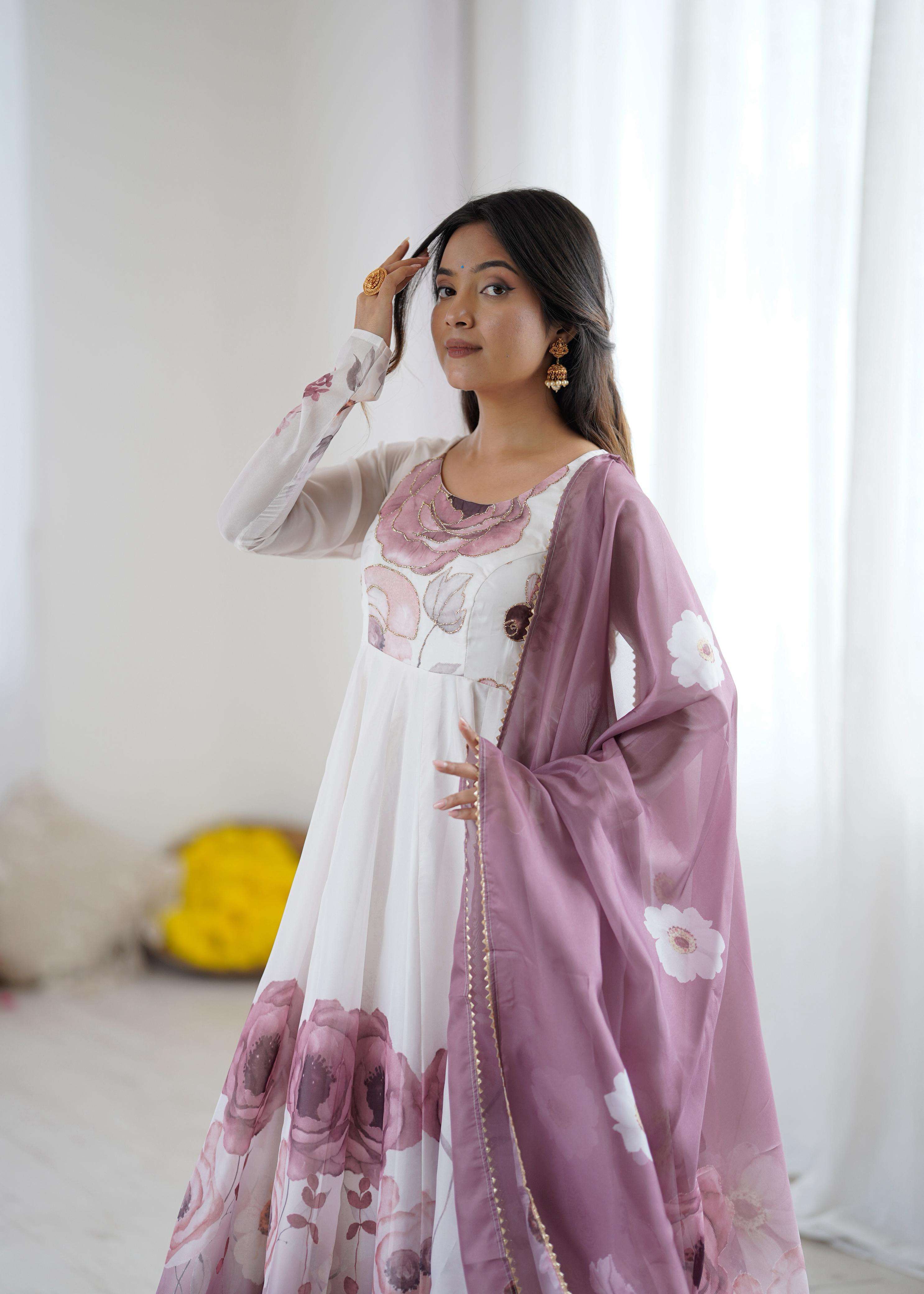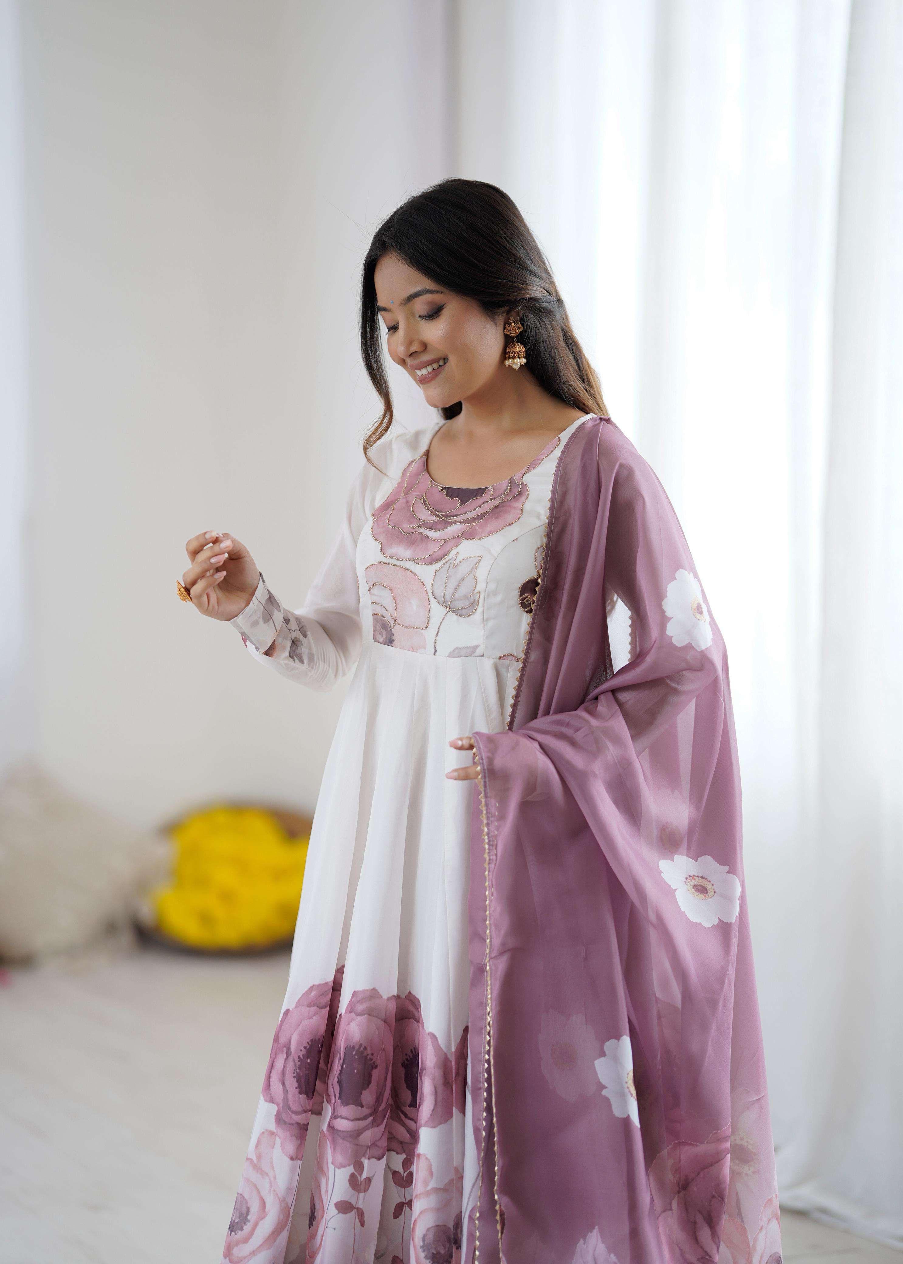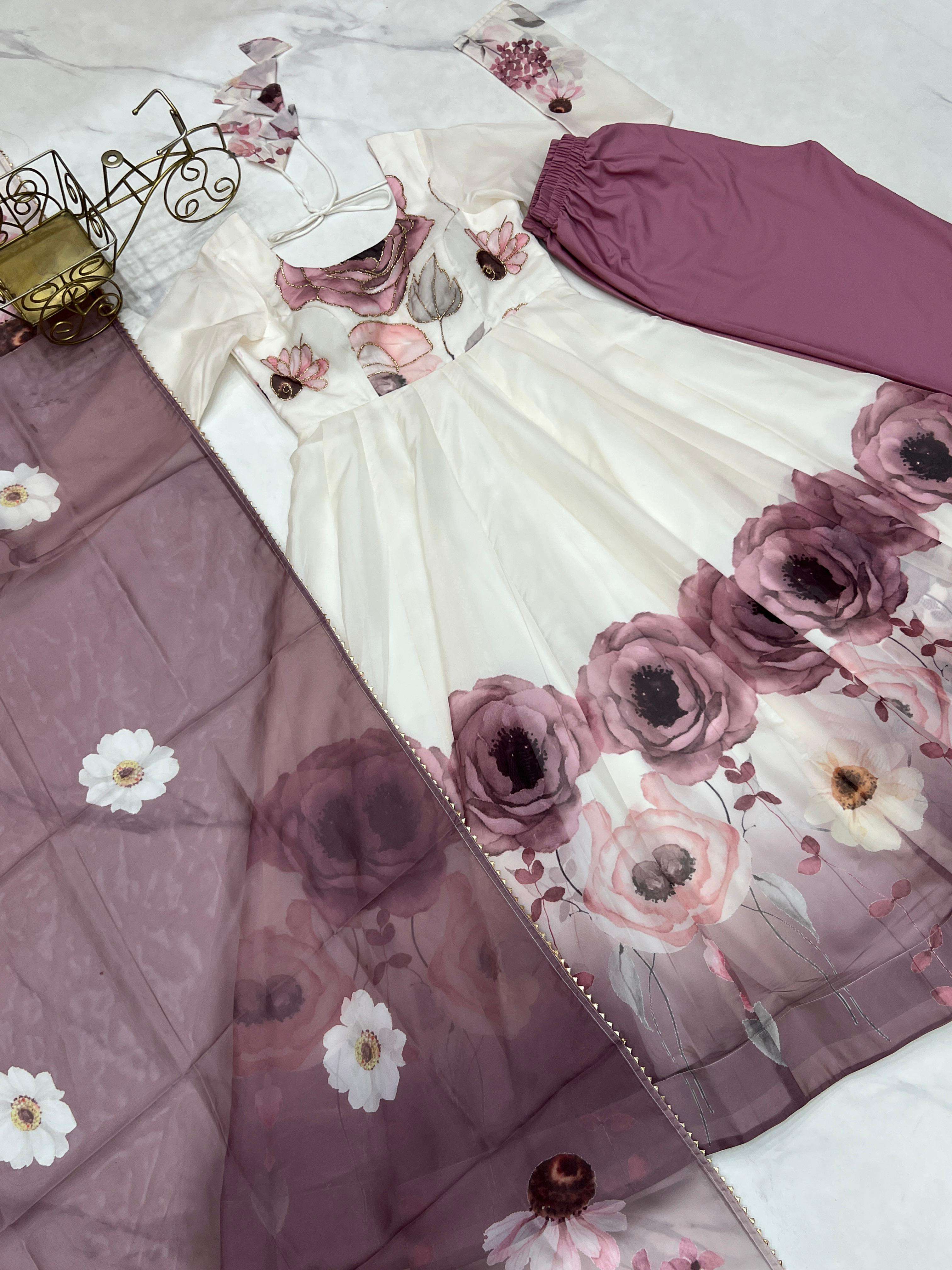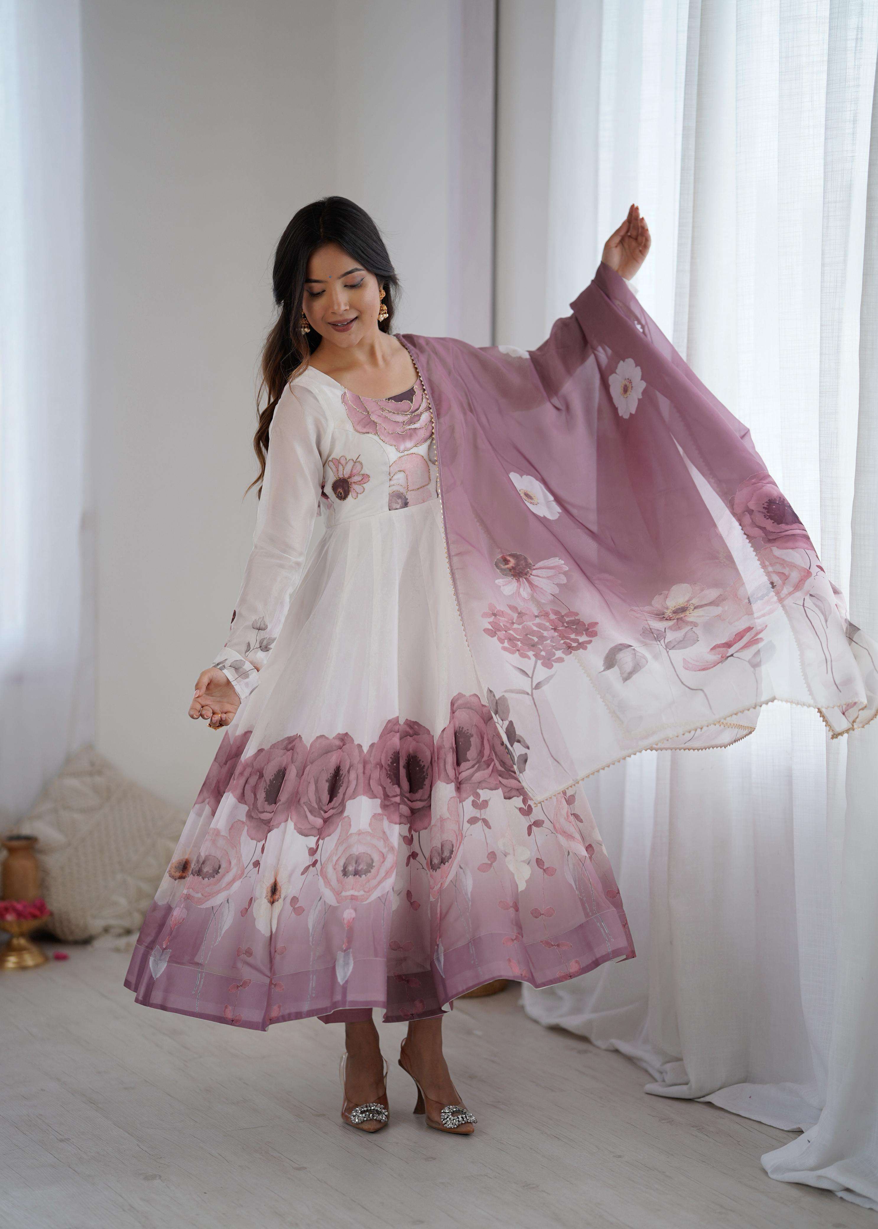 *REGISTERED TM PATENTED BY OWNER* *Launching this timeless and classic onion pink floral printed organza anarkali suit set for the upcoming festivities and wedding season* *REAL MODELING PURE SOFT ORGANJA SILK FABRIC FULLY FLAIR KALI PATTERN AND CANVAS PATTA WITH DUPPTA SET ,PENT READY TO WEAR*