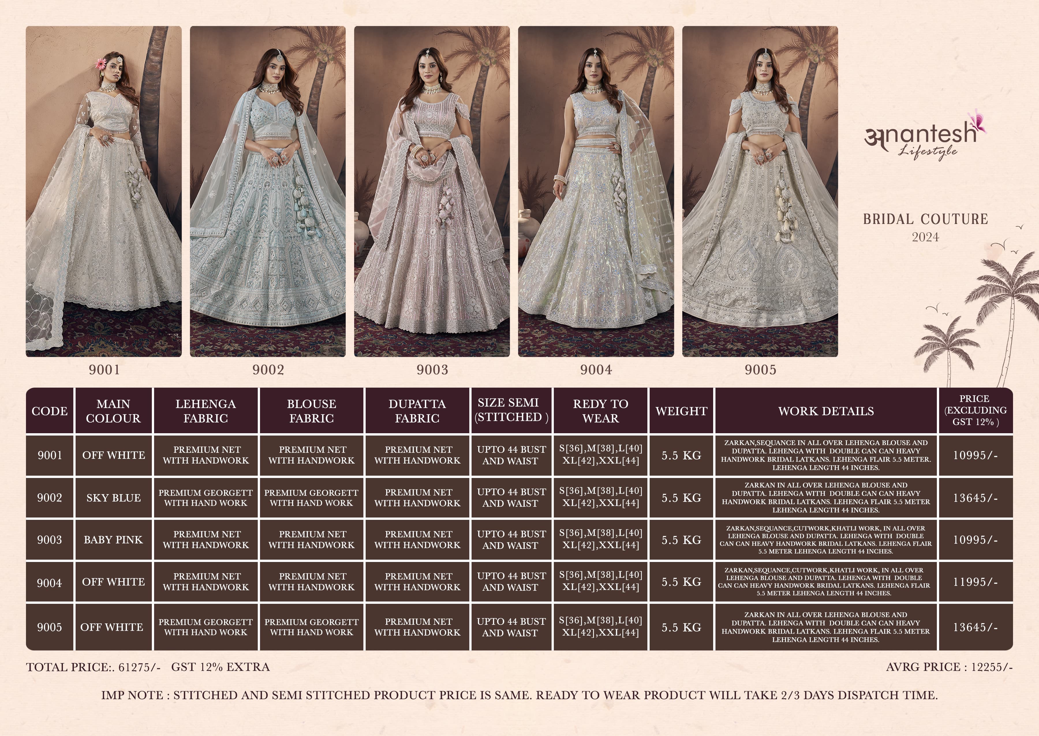 Buy Online Anatesh Lifestyle New Bridal Couture 2024 Series 9001 To 9005 Handwork Wedding Lehengacholi Collection Manufacturer Surat 5 Pcs of Full Catalogue at Wholesale Price. Looking for Anatesh Lifestyle New Bridal Couture 2024 Series 9001 To 9005 Handwork Wedding Lehengacholi Collection Manufacturer Surat Full Catalouge at Best Price? Buy Now Anatesh Lifestyle New Bridal Couture 2024 Series 9001 To 9005 Handwork Wedding Lehengacholi Collection Manufacturer Surat at Wholesale Rate of Rs 61275 with Total 5 Pcs from authroized dealer and supplier of Brand. Cost of Each piece is just only Rs 12255 which is very low and affordable price to resale the product in your retail store ,This is Surat based Wholesale Supplier & Dealer of Brand. Click on Brand name to Know more about Brand's products.Call or Whatsapp on 9898838984 for booking or enquiry