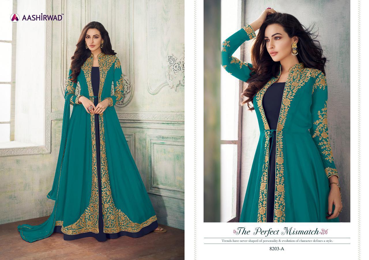 AASHIRWAD ANAYA 8203 Colors Top Real georgette with dull santoon inner n bottom with narzling duptta Price-2195 per Pcs . * set & loose & Singel * GST 5 Percent Extra Single Extra 100 Dispatching in 4 days ... |