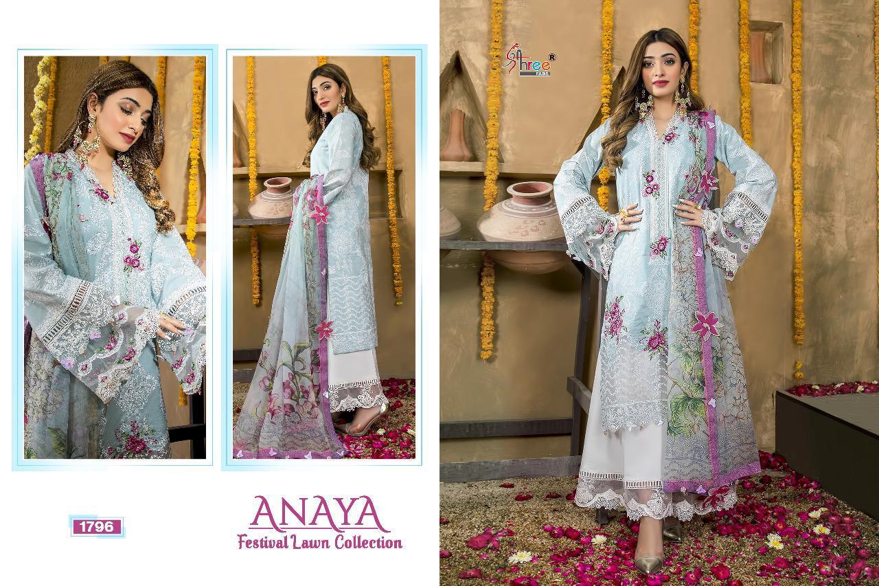 ANAYA FESTIVAL LAWN COLLECTION TOP PURE LAWN COTTON PRINT WITH EXCLUSIVE EMBRODERY BOTTOM SEMILAWN DUPPTA SILVER SIFFON / COTTON MALMAL 1 DES NO 1798 EMBRODERD NET DUPPTA DESIGNS 6 RATE 799+ GST SIFFON 851+GST COTTON SHREE FABS SURAT |