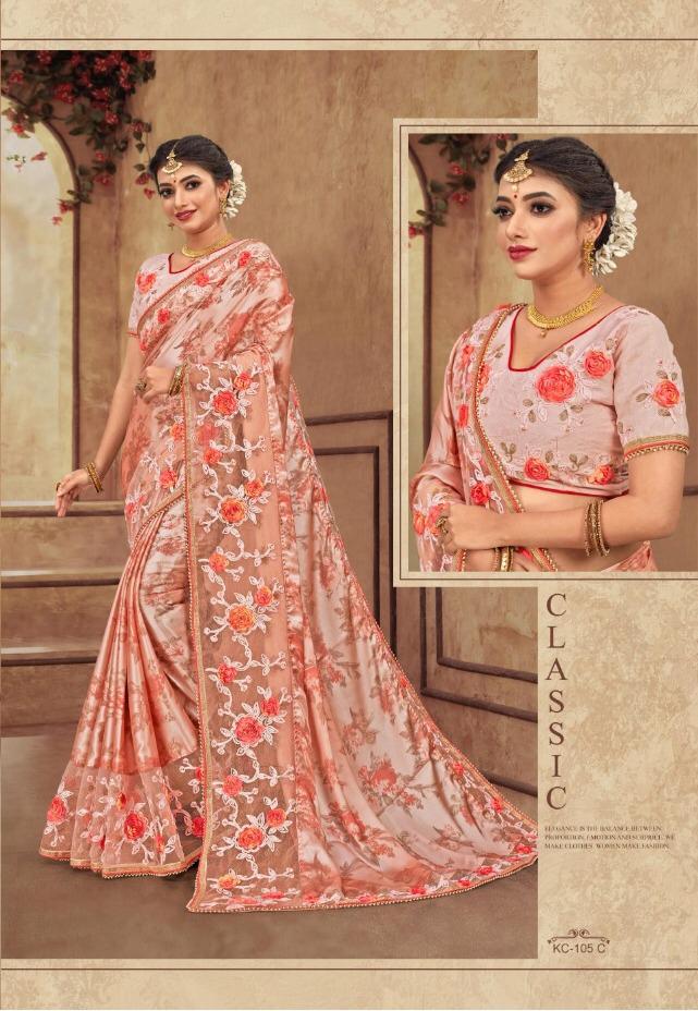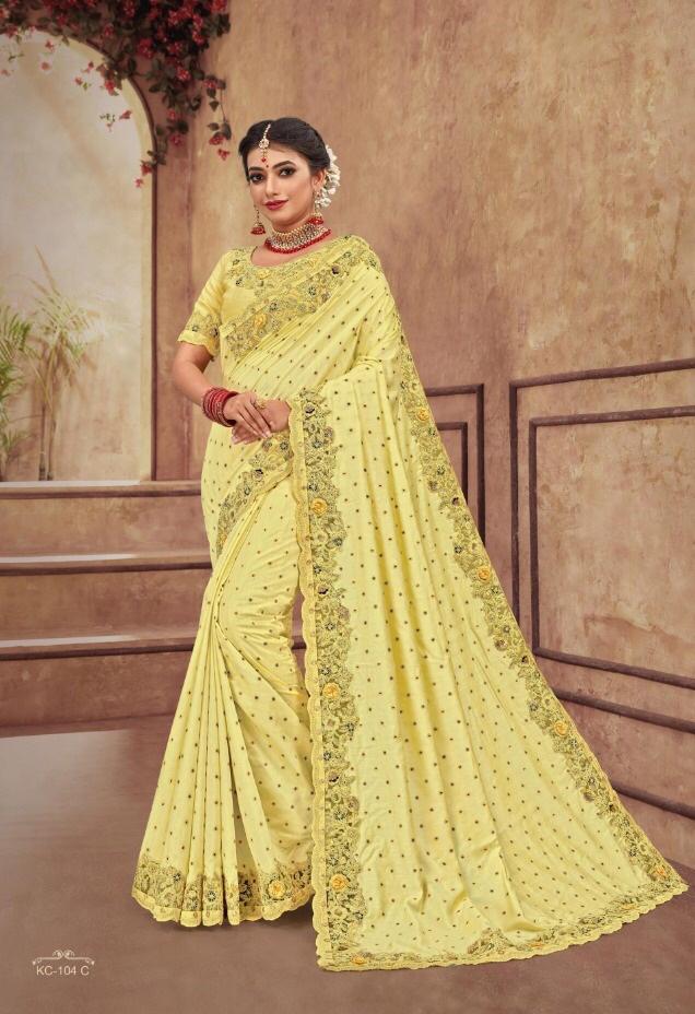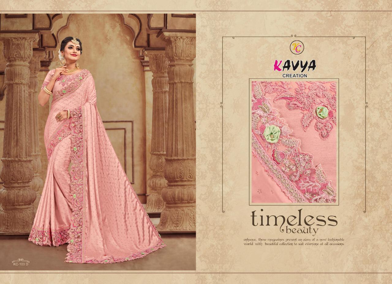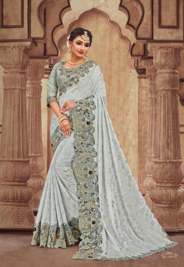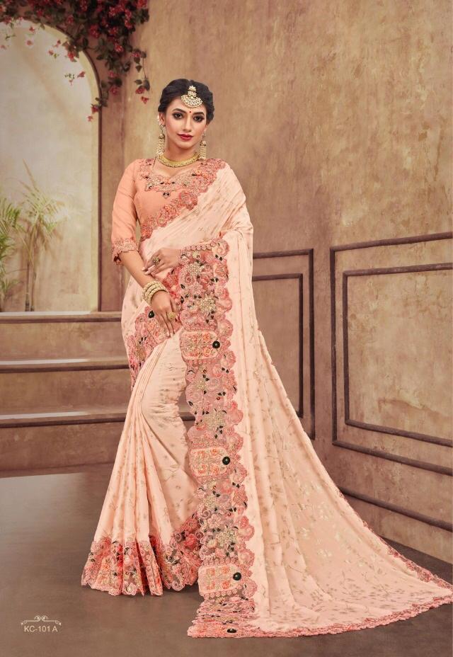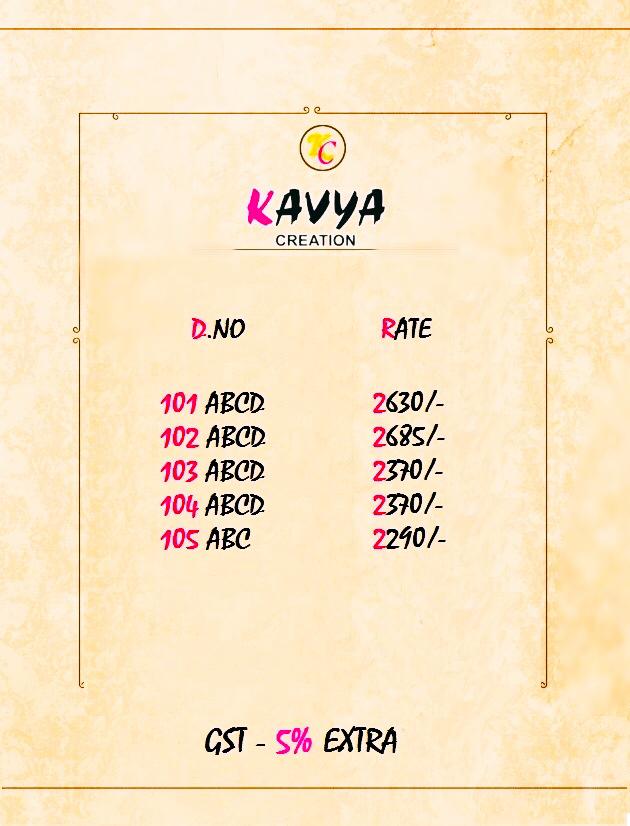 Brand - Kavya cretion. Type - Saree. 101 A B C D to 105 A B C . Total 19 Pcs in set. Single extra 100 * set & loose & singel * GST 5 Percent Extra. Delivery from tomorrow |