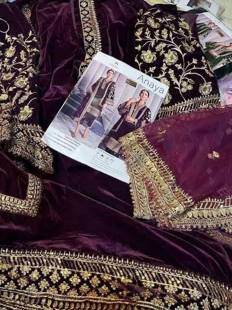 *Anaya velevt Colour by DEEPSY SUITS* Top -Velvet with embroidery Bot - Rayon Dup - Net with embroidery Pcs: 3 *Rate - 1299/-* GST ship extra *_Quilted Fabric Used For best quality results_* 100+single |