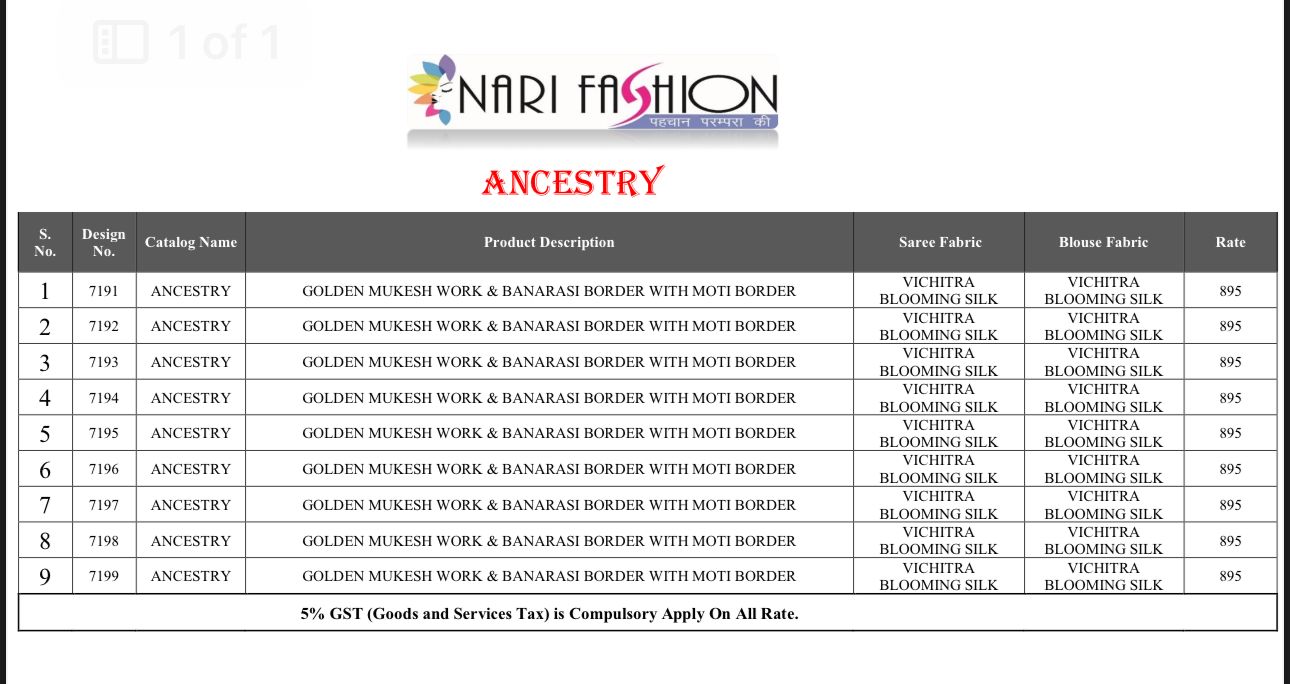 Buy Online Ancestry Nari Fashion Designer Sarees 9 Pcs of Full Catalogue at Wholesale Price. Looking for Ancestry Nari Fashion Designer Sarees Full Catalouge at Best Price? Buy Now Ancestry Nari Fashion Designer Sarees at Wholesale Rate of Rs 8055 with Total 9 Pcs from authroized dealer and supplier of Nari Fashion Brand. Cost of Each piece is just only Rs 895 which is very low and affordable price to resale the product in your retail store ,This is Surat based Wholesale Supplier & Dealer of Nari Fashion Brand. Click on Brand name to Know more about Nari Fashion Brand's products.Call or Whatsapp on 9898838984 for booking or enquiry