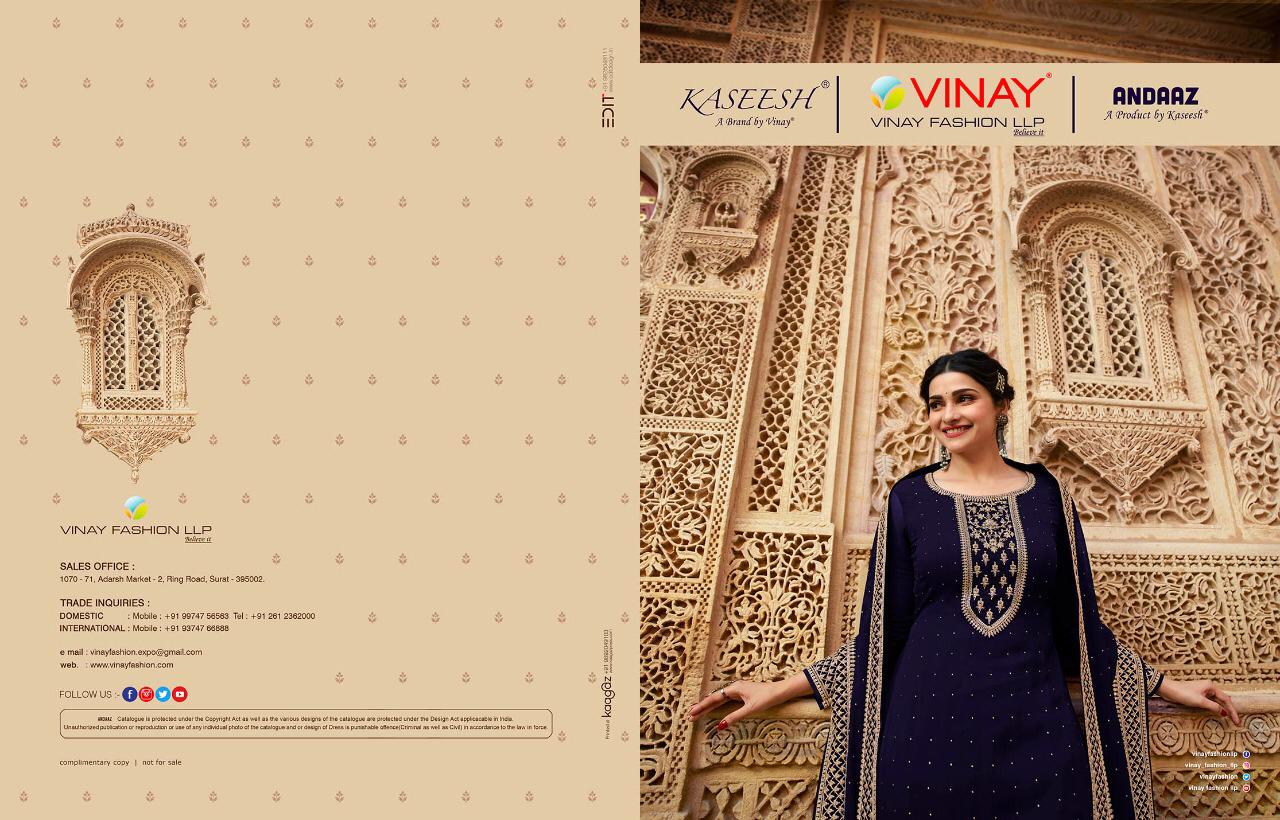 Buy Online Andaaz By Kaseesh By Vinay Manufacturer Traders Surat 9 Pcs of Full Catalogue at Wholesale Price. Looking for Andaaz By Kaseesh By Vinay Manufacturer Traders Surat Full Catalouge at Best Price? Buy Now Andaaz By Kaseesh By Vinay Manufacturer Traders Surat at Wholesale Rate of Rs 14310 with Total 9 Pcs from authroized dealer and supplier of VINAY Brand. Cost of Each piece is just only Rs 1590 which is very low and affordable price to resale the product in your retail store ,This is Surat based Wholesale Supplier & Dealer of VINAY Brand. Click on Brand name to Know more about VINAY Brand's products.Call or Whatsapp on 9898838984 for booking or enquiry