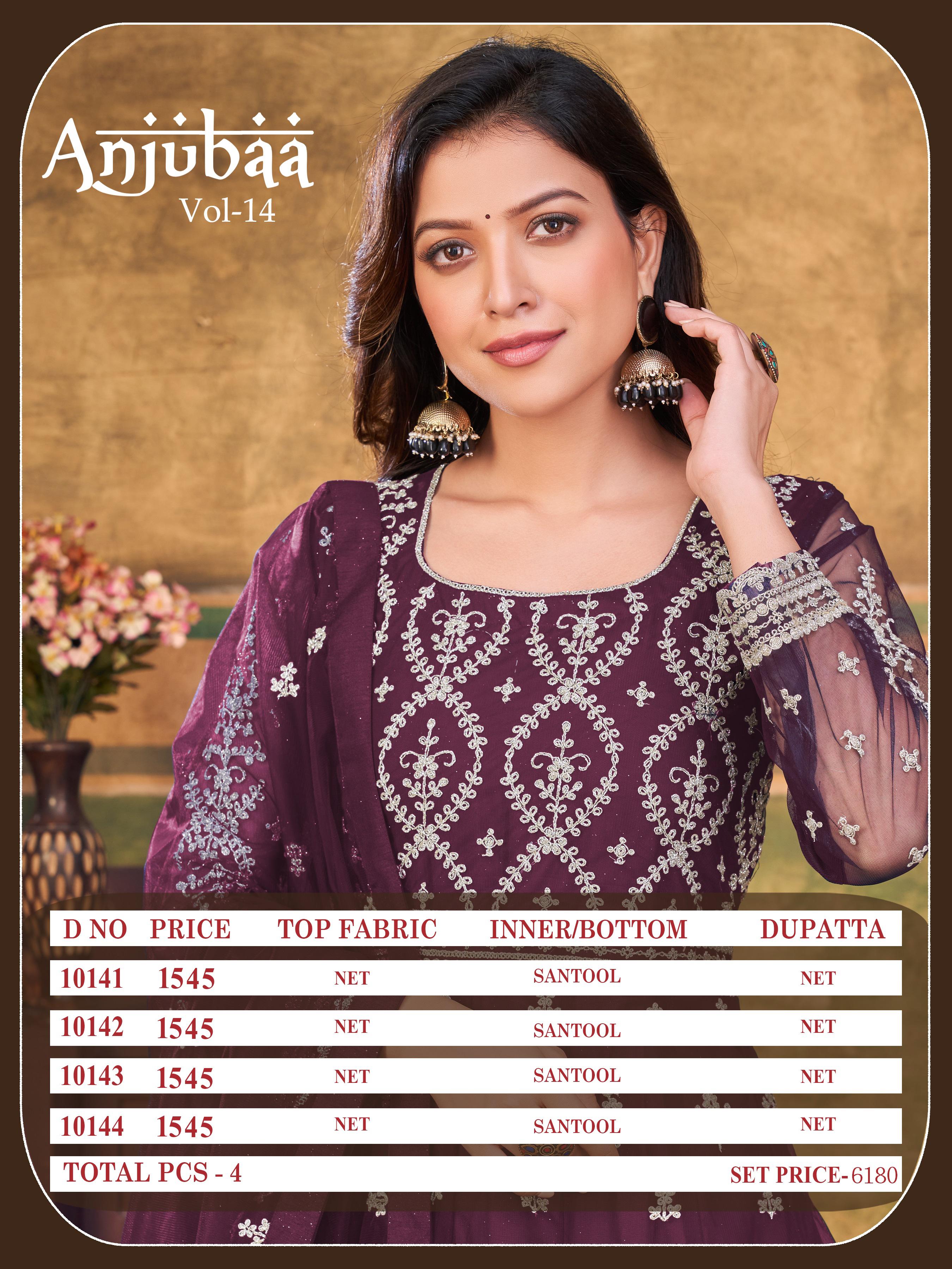 Buy Online Anjubaa Vol 14 Heavy Net Anarkali Dress 4 Pcs of Full Catalogue at Wholesale Price. Looking for Anjubaa Vol 14 Heavy Net Anarkali Dress Full Catalouge at Best Price? Buy Now Anjubaa Vol 14 Heavy Net Anarkali Dress at Wholesale Rate of Rs 6180 with Total 4 Pcs from authroized dealer and supplier of Brand. Cost of Each piece is just only Rs 1545 which is very low and affordable price to resale the product in your retail store ,This is Surat based Wholesale Supplier & Dealer of Brand. Click on Brand name to Know more about Brand's products.Call or Whatsapp on 9898838984 for booking or enquiry