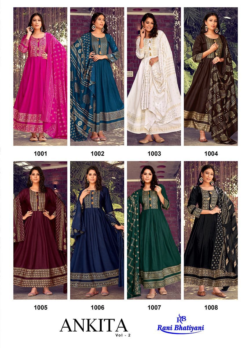 Buy Online Ankita Vol 2 By Rani Bhatiyani Designer Gown With Dupatta Wholesaler Supplier From Surat 8 Pcs of Full Catalogue at Wholesale Price. Looking for Ankita Vol 2 By Rani Bhatiyani Designer Gown With Dupatta Wholesaler Supplier From Surat Full Catalouge at Best Price? Buy Now Ankita Vol 2 By Rani Bhatiyani Designer Gown With Dupatta Wholesaler Supplier From Surat at Wholesale Rate of Rs 5160 with Total 8 Pcs from authroized dealer and supplier of Brand. Cost of Each piece is just only Rs 645 which is very low and affordable price to resale the product in your retail store ,This is Surat based Wholesale Supplier & Dealer of Brand. Click on Brand name to Know more about Brand's products.Call or Whatsapp on 9898838984 for booking or enquiry