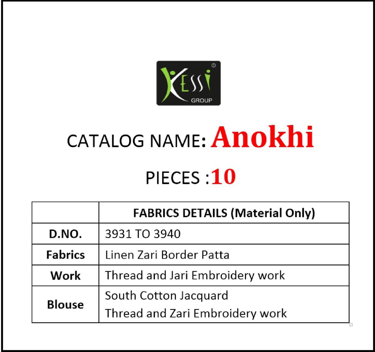 Brand - Kessi . Type - saree. Catlog name - ANOKHI. Series -3931 to 3940. Rate - 999 per Pcs . GST 5 Percent Extra. Delivery 2 days |
