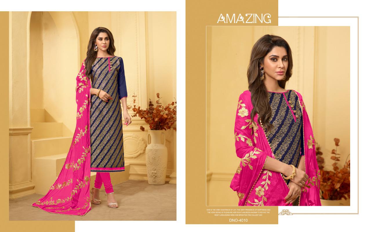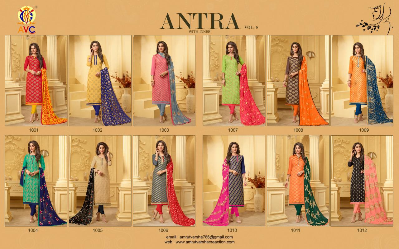 Buy Online Antara Vol 8 By Avc Banarasi Jacquard Suits Wholesale Supplier Nd Trader Surat 12 Pcs of Full Catalogue at Wholesale Price. Looking for Antara Vol 8 By Avc Banarasi Jacquard Suits Wholesale Supplier Nd Trader Surat Full Catalouge at Best Price? Buy Now Antara Vol 8 By Avc Banarasi Jacquard Suits Wholesale Supplier Nd Trader Surat at Wholesale Rate of Rs 6420 with Total 12 Pcs from authroized dealer and supplier of AVC Brand. Cost of Each piece is just only Rs 535 which is very low and affordable price to resale the product in your retail store ,This is Surat based Wholesale Supplier & Dealer of AVC Brand. Click on Brand name to Know more about AVC Brand's products.Call or Whatsapp on 9898838984 for booking or enquiry