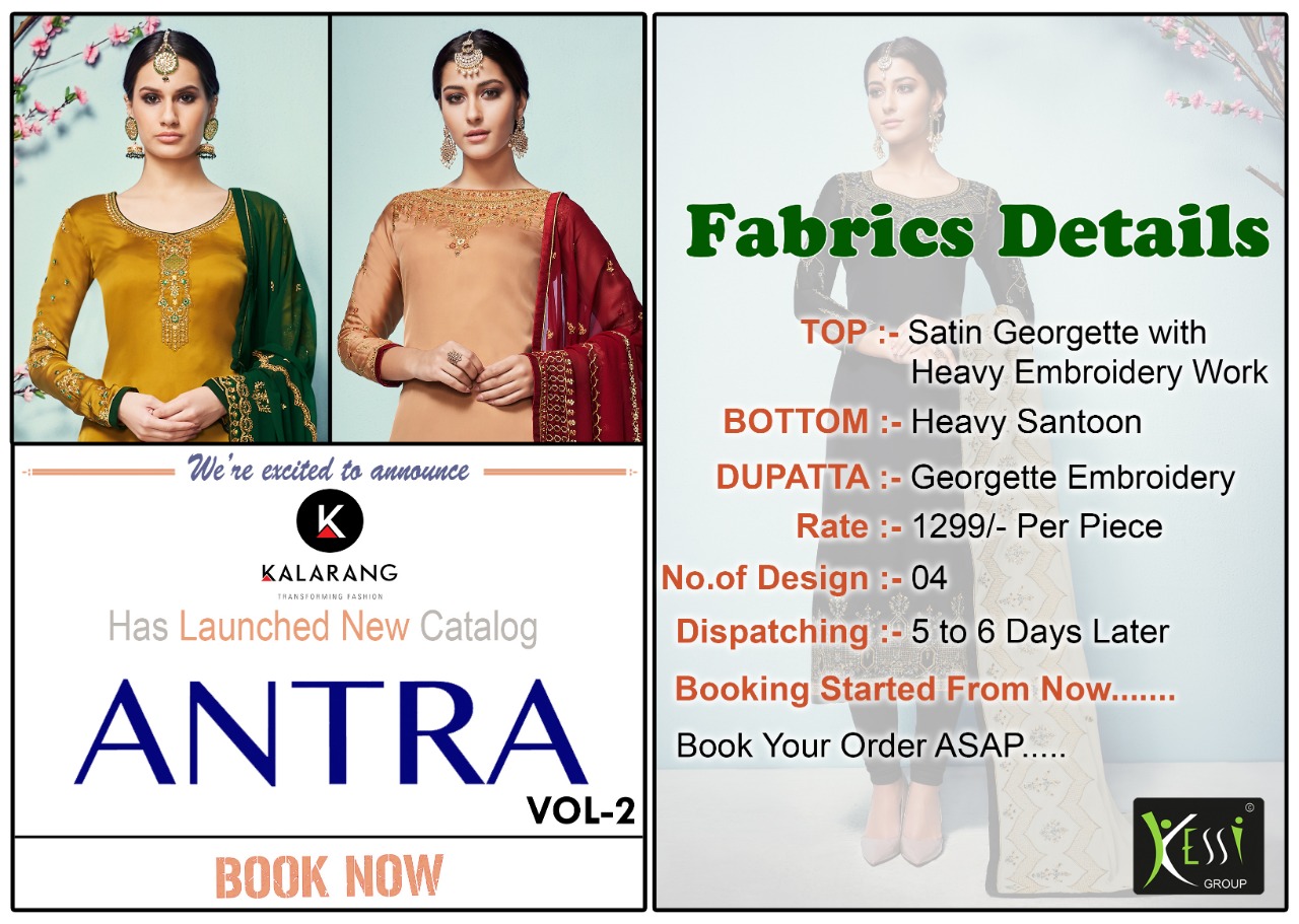 Buy Online Antra Vol 2 By Kalarang Series 501 To 504 Satin Georgette Embroidered Designer Party Wear Suits Wholesale Supplier Gujarat 4 Pcs of Full Catalogue at Wholesale Price. Looking for Antra Vol 2 By Kalarang Series 501 To 504 Satin Georgette Embroidered Designer Party Wear Suits Wholesale Supplier Gujarat Full Catalouge at Best Price? Buy Now Antra Vol 2 By Kalarang Series 501 To 504 Satin Georgette Embroidered Designer Party Wear Suits Wholesale Supplier Gujarat at Wholesale Rate of Rs 5196 with Total 4 Pcs from authroized dealer and supplier of KALARANG Brand. Cost of Each piece is just only Rs 1299 which is very low and affordable price to resale the product in your retail store ,This is Surat based Wholesale Supplier & Dealer of KALARANG Brand. Click on Brand name to Know more about KALARANG Brand's products.Call or Whatsapp on 9898838984 for booking or enquiry