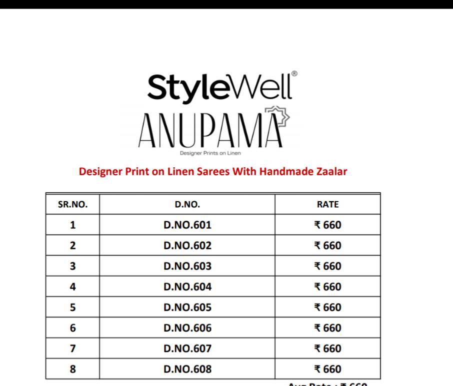 Buy Online Anupama By Style Well Series 601 To 608 Sarees Set And Single Wholesale Supplier And Dealer Gujarat 8 Pcs of Full Catalogue at Wholesale Price. Looking for Anupama By Style Well Series 601 To 608 Sarees Set And Single Wholesale Supplier And Dealer Gujarat Full Catalouge at Best Price? Buy Now Anupama By Style Well Series 601 To 608 Sarees Set And Single Wholesale Supplier And Dealer Gujarat at Wholesale Rate of Rs 5280 with Total 8 Pcs from authroized dealer and supplier of STYLE WELL Brand. Cost of Each piece is just only Rs 660 which is very low and affordable price to resale the product in your retail store ,This is Surat based Wholesale Supplier & Dealer of STYLE WELL Brand. Click on Brand name to Know more about STYLE WELL Brand's products.Call or Whatsapp on 9898838984 for booking or enquiry
