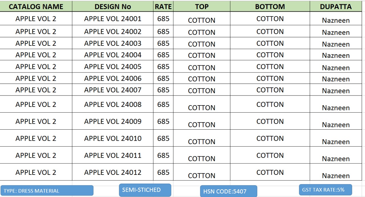 Buy Online Apple Vol 2 By Nitya Nx 24001 Series Fancy Cotton Salwar Kameez Catlog Wholesale Dealer And Supplier Surat 12 Pcs of Full Catalogue at Wholesale Price. Looking for Apple Vol 2 By Nitya Nx 24001 Series Fancy Cotton Salwar Kameez Catlog Wholesale Dealer And Supplier Surat Full Catalouge at Best Price? Buy Now Apple Vol 2 By Nitya Nx 24001 Series Fancy Cotton Salwar Kameez Catlog Wholesale Dealer And Supplier Surat at Wholesale Rate of Rs 8220 with Total 12 Pcs from authroized dealer and supplier of NITYA NX Brand. Cost of Each piece is just only Rs 685 which is very low and affordable price to resale the product in your retail store ,This is Surat based Wholesale Supplier & Dealer of NITYA NX Brand. Click on Brand name to Know more about NITYA NX Brand's products.Call or Whatsapp on 9898838984 for booking or enquiry