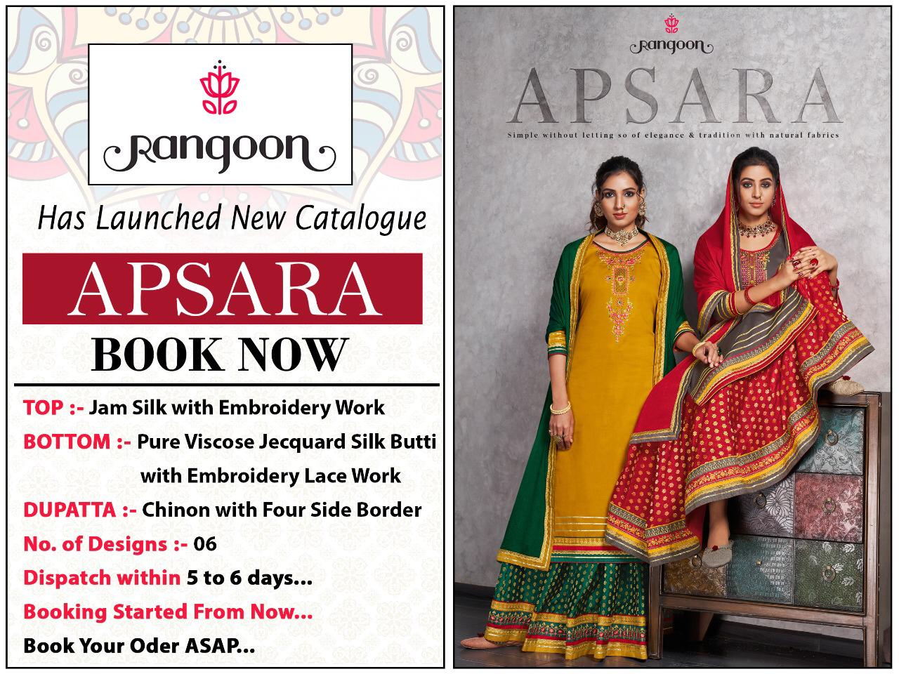 Buy Online Apsara By Rangoon Ready To Wear Suits Wholesale Supplier Gujarat 6 Pcs of Full Catalogue at Wholesale Price. Looking for Apsara By Rangoon Ready To Wear Suits Wholesale Supplier Gujarat Full Catalouge at Best Price? Buy Now Apsara By Rangoon Ready To Wear Suits Wholesale Supplier Gujarat at Wholesale Rate of Rs 7194 with Total 6 Pcs from authroized dealer and supplier of RANGOON Brand. Cost of Each piece is just only Rs 1199 which is very low and affordable price to resale the product in your retail store ,This is Surat based Wholesale Supplier & Dealer of RANGOON Brand. Click on Brand name to Know more about RANGOON Brand's products.Call or Whatsapp on 9898838984 for booking or enquiry