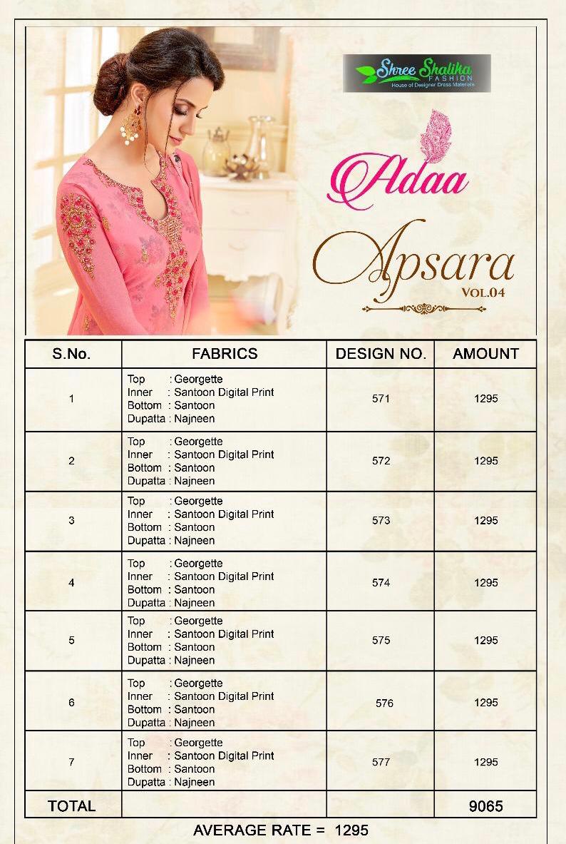 Buy Online Apsara Vol 4 By Shree Shalika Fashion 571 Series Fancy Georgette Party Wear Salwar Kameez Catlog Wholesaler Surat 7 Pcs of Full Catalogue at Wholesale Price. Looking for Apsara Vol 4 By Shree Shalika Fashion 571 Series Fancy Georgette Party Wear Salwar Kameez Catlog Wholesaler Surat Full Catalouge at Best Price? Buy Now Apsara Vol 4 By Shree Shalika Fashion 571 Series Fancy Georgette Party Wear Salwar Kameez Catlog Wholesaler Surat at Wholesale Rate of Rs 9065 with Total 7 Pcs from authroized dealer and supplier of SHREE SHALIKA FASHION Brand. Cost of Each piece is just only Rs 1295 which is very low and affordable price to resale the product in your retail store ,This is Surat based Wholesale Supplier & Dealer of SHREE SHALIKA FASHION Brand. Click on Brand name to Know more about SHREE SHALIKA FASHION Brand's products.Call or Whatsapp on 9898838984 for booking or enquiry
