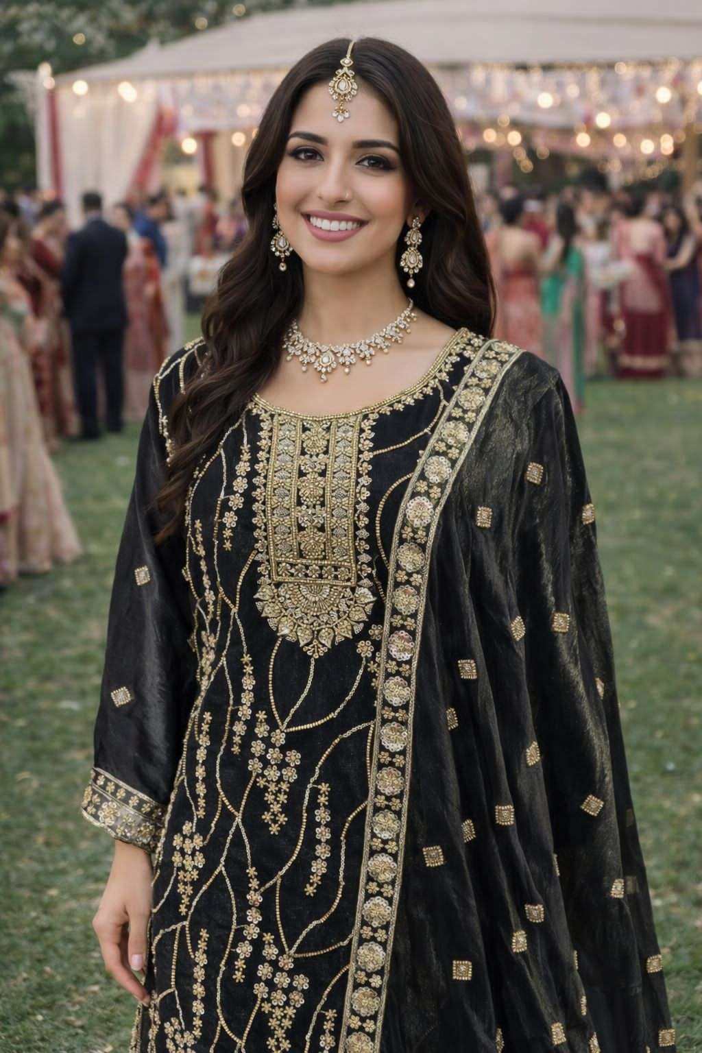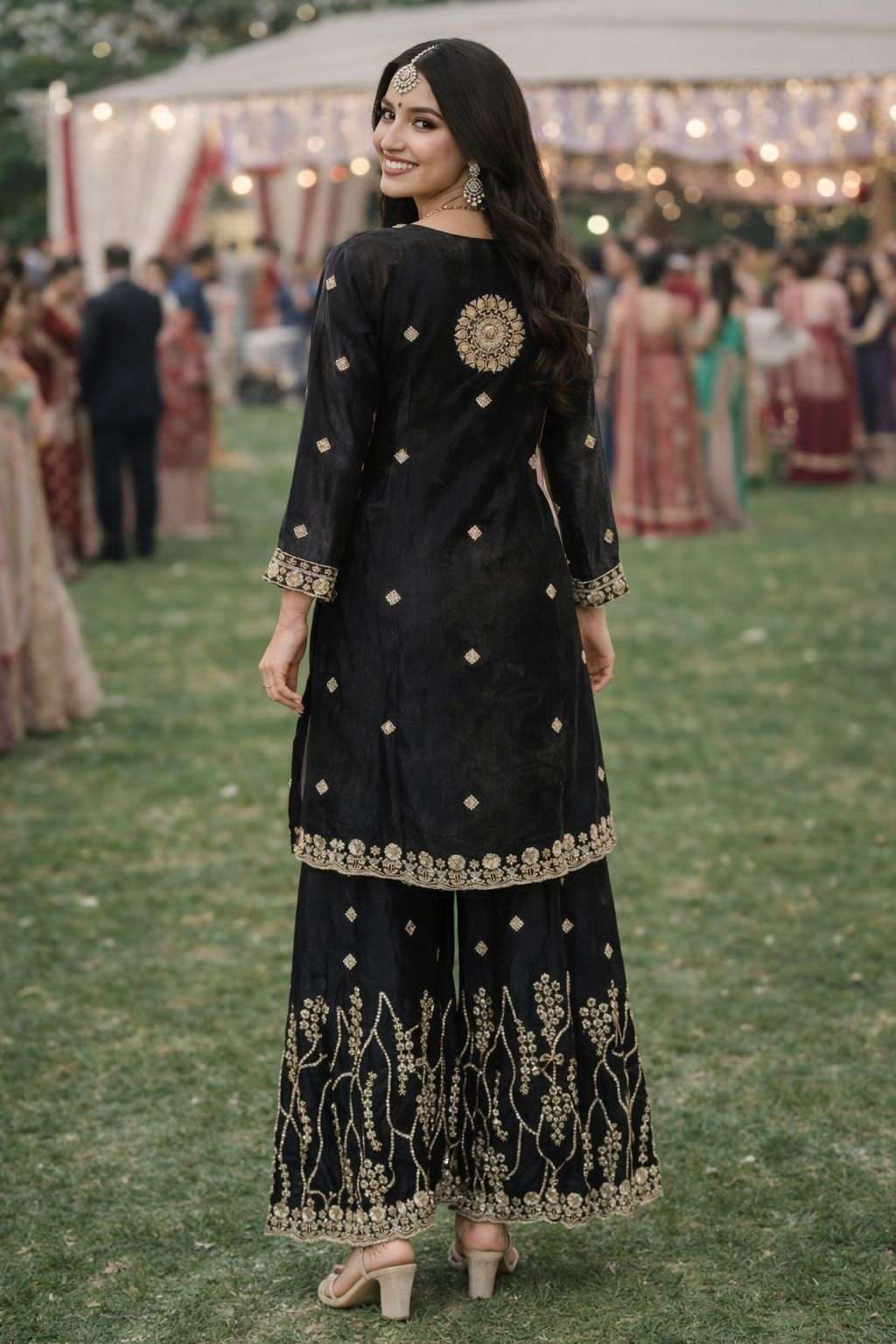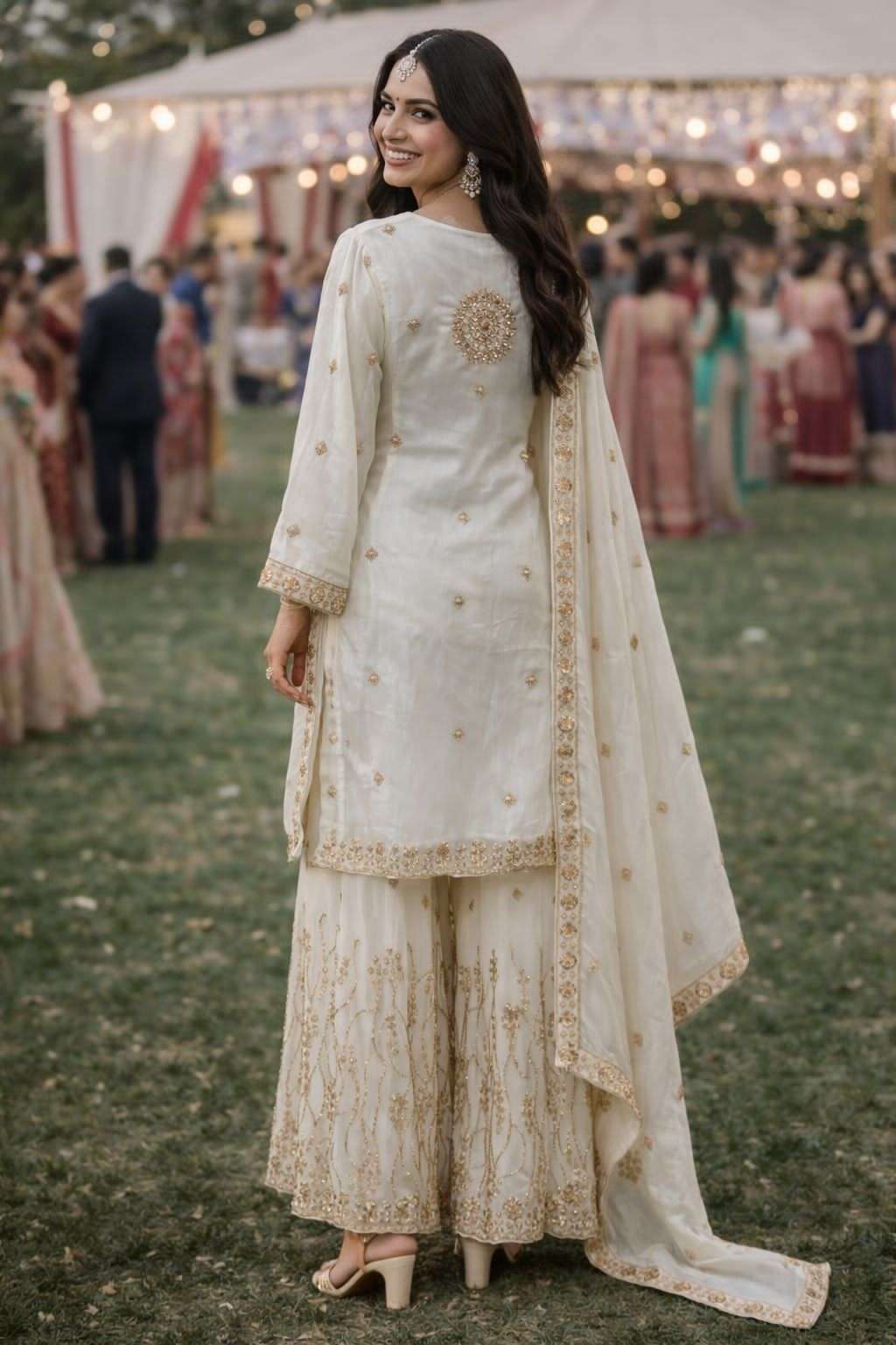 FABRIC - REAL PREMIUM FENDY SILK ( HEAVY FRONT & BACK EMBROIDERED SEQUENCE & CUT BEADS WORK TOP WITH PLAZZO AND DUPATTA )