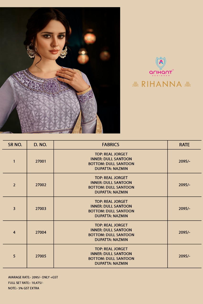 Buy Online Arihant Designer Rihanna 27001 Series Designer Gown Suits 5 Pcs of Full Catalogue at Wholesale Price. Looking for Arihant Designer Rihanna 27001 Series Designer Gown Suits Full Catalouge at Best Price? Buy Now Arihant Designer Rihanna 27001 Series Designer Gown Suits at Wholesale Rate of Rs 10475 with Total 5 Pcs from authroized dealer and supplier of ARIHANT Brand. Cost of Each piece is just only Rs 2095 which is very low and affordable price to resale the product in your retail store ,This is Surat based Wholesale Supplier & Dealer of ARIHANT Brand. Click on Brand name to Know more about ARIHANT Brand's products.Call or Whatsapp on 9898838984 for booking or enquiry