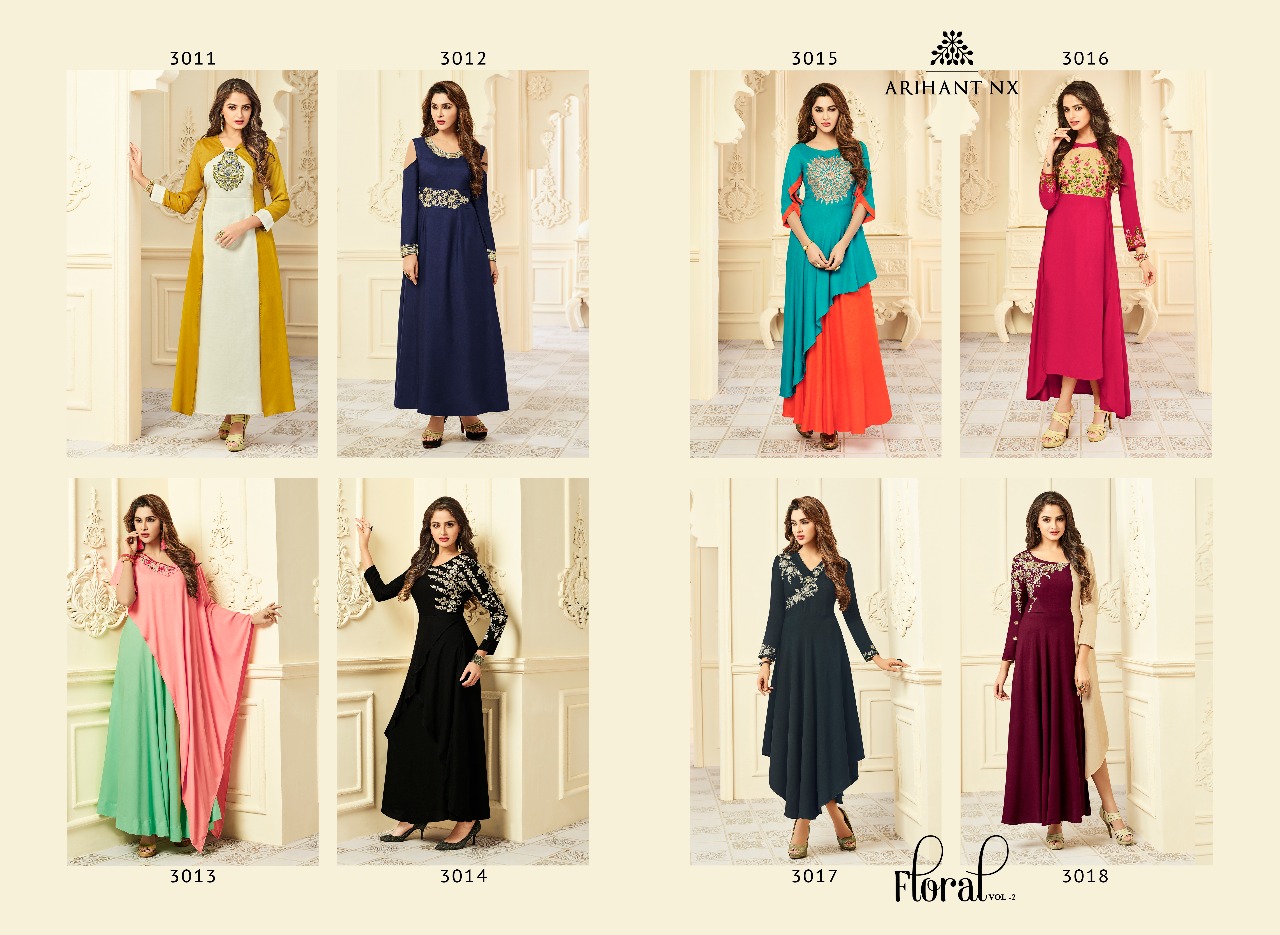 Buy Online Arihant Nx Floral Vol 2 3011 Series Designer Reyon Dyed Kurti Catlogue Wholesale Dealer And Supplier Surat 8 Pcs of Full Catalogue at Wholesale Price. Looking for Arihant Nx Floral Vol 2 3011 Series Designer Reyon Dyed Kurti Catlogue Wholesale Dealer And Supplier Surat Full Catalouge at Best Price? Buy Now Arihant Nx Floral Vol 2 3011 Series Designer Reyon Dyed Kurti Catlogue Wholesale Dealer And Supplier Surat at Wholesale Rate of Rs 6760 with Total 8 Pcs from authroized dealer and supplier of ARIHANT NX Brand. Cost of Each piece is just only Rs 845 which is very low and affordable price to resale the product in your retail store ,This is Surat based Wholesale Supplier & Dealer of ARIHANT NX Brand. Click on Brand name to Know more about ARIHANT NX Brand's products.Call or Whatsapp on 9898838984 for booking or enquiry