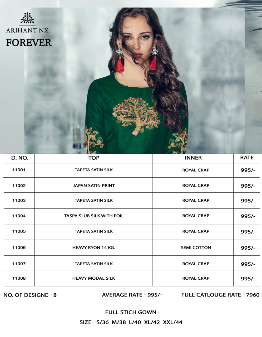 Buy Online Arihant Nx Forever 11001 Series Designer Gown Suit Collection Wholesale Dealer And Supplier Surat 8 Pcs of Full Catalogue at Wholesale Price. Looking for Arihant Nx Forever 11001 Series Designer Gown Suit Collection Wholesale Dealer And Supplier Surat Full Catalouge at Best Price? Buy Now Arihant Nx Forever 11001 Series Designer Gown Suit Collection Wholesale Dealer And Supplier Surat at Wholesale Rate of Rs 7960 with Total 8 Pcs from authroized dealer and supplier of ARIHANT NX Brand. Cost of Each piece is just only Rs 995 which is very low and affordable price to resale the product in your retail store ,This is Surat based Wholesale Supplier & Dealer of ARIHANT NX Brand. Click on Brand name to Know more about ARIHANT NX Brand's products.Call or Whatsapp on 9898838984 for booking or enquiry