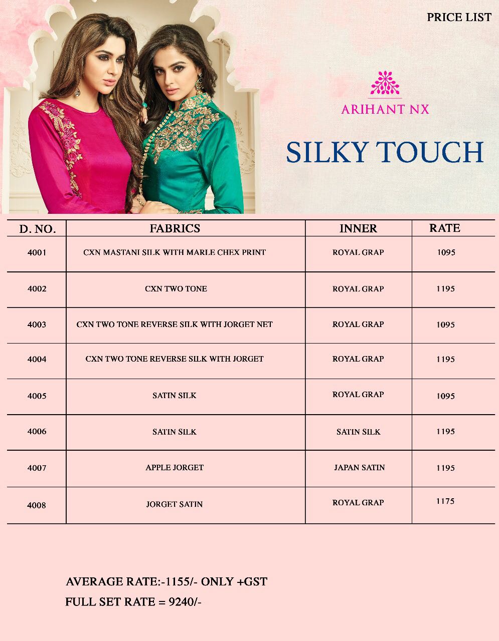 Buy Online Arihant Nx Silky Touch 4001 To 4008 Series Gown Type Kurti 8 Pcs of Full Catalogue at Wholesale Price. Looking for Arihant Nx Silky Touch 4001 To 4008 Series Gown Type Kurti Full Catalouge at Best Price? Buy Now Arihant Nx Silky Touch 4001 To 4008 Series Gown Type Kurti at Wholesale Rate of Rs 9240 with Total 8 Pcs from authroized dealer and supplier of ARIHANT NX Brand. Cost of Each piece is just only Rs 1155 which is very low and affordable price to resale the product in your retail store ,This is Surat based Wholesale Supplier & Dealer of ARIHANT NX Brand. Click on Brand name to Know more about ARIHANT NX Brand's products.Call or Whatsapp on 9898838984 for booking or enquiry