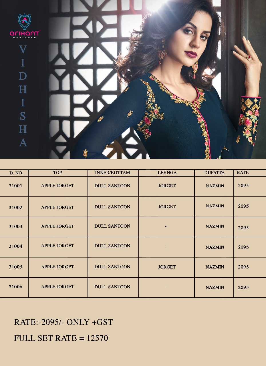 ARIHANT DESIGNER Present New Catlog ?VIDHISHA? FabRics Detail Top:Apple Jorjat Inner&Bottom:-Dull Santoon Duppta:-Narzling Des.6 Pcs Rate-2095/- Disptch Date- Next Week Series -31001 to 31006. GST 5 Percent Extra. Regard:- Arihant Designer |