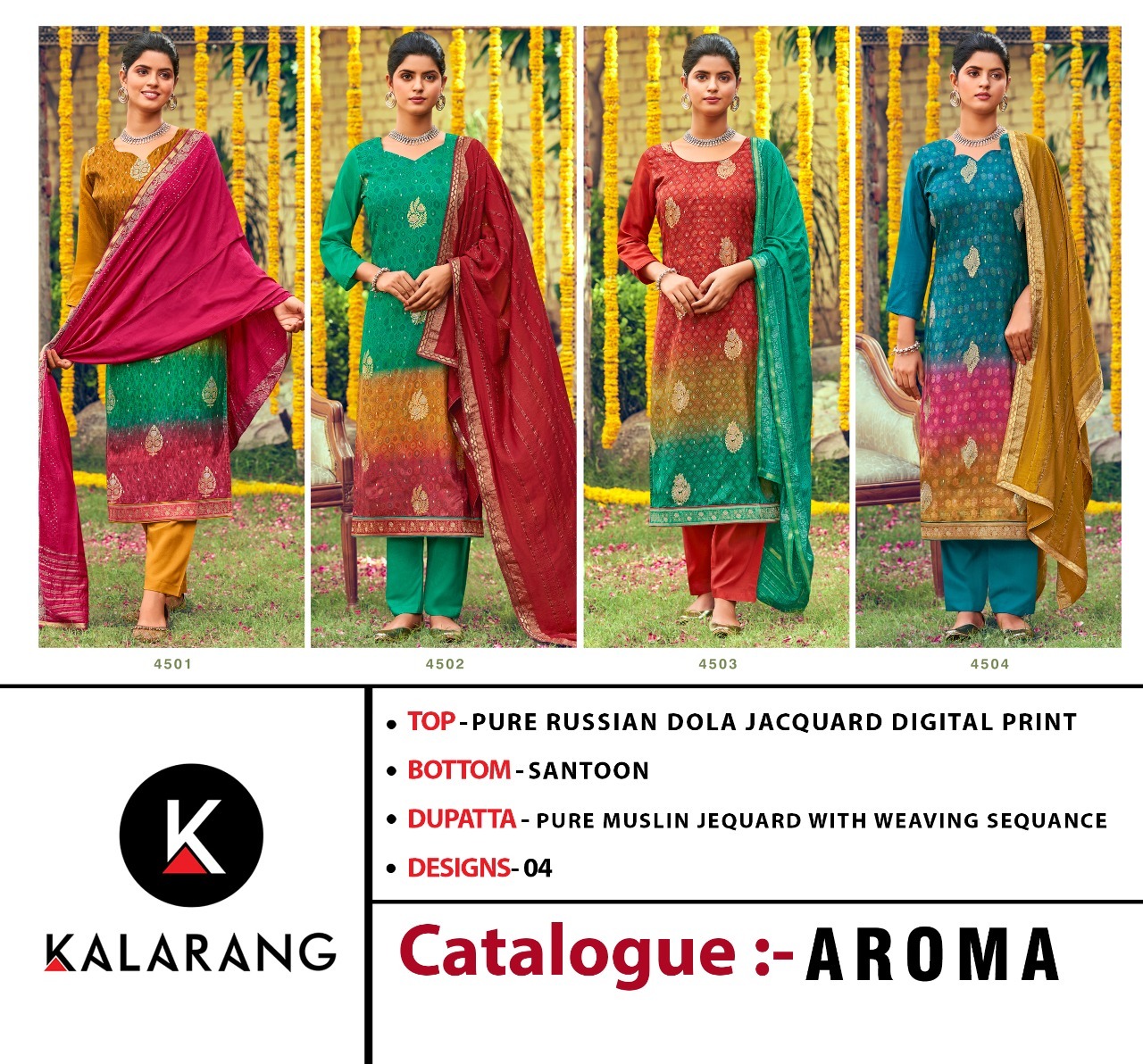 ???? ?????? ???* ? KALARANG has launched Catalog name : *AROMA* ? Fabric Details ? ?Top:- *Pure Russian Dola Jacquard Digital Print* ?BOTTOM:- *Santoon* ?Dupatta:- *Pure Muslin Jequard With Weaving Sequance* ?Total Design:- 4 ? 1099 per pcs Set to set ?Booking started from now... |