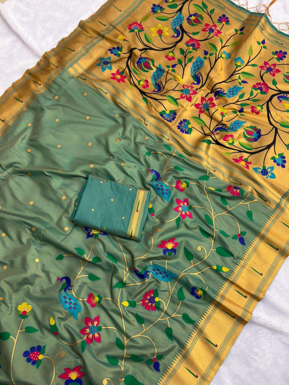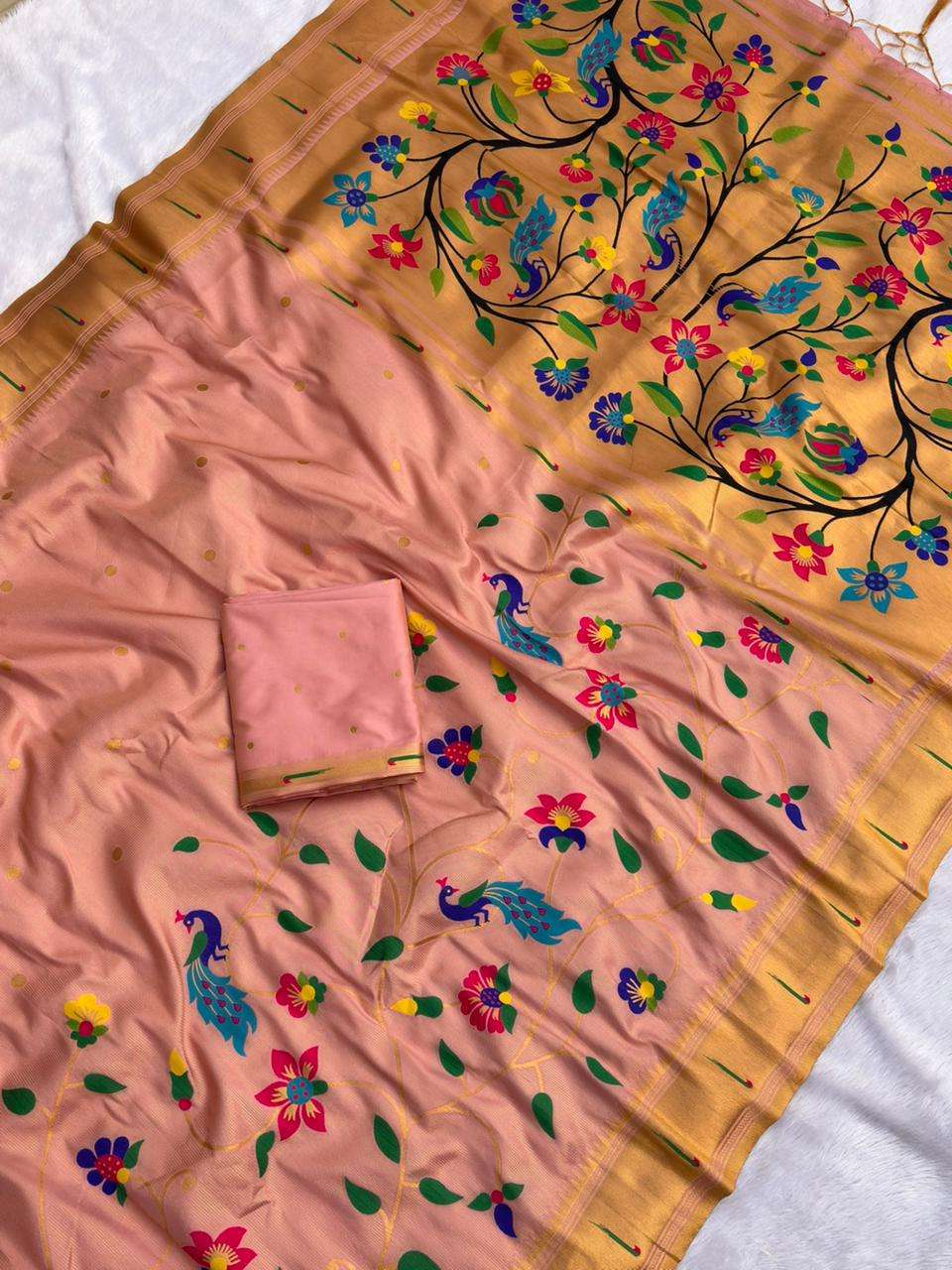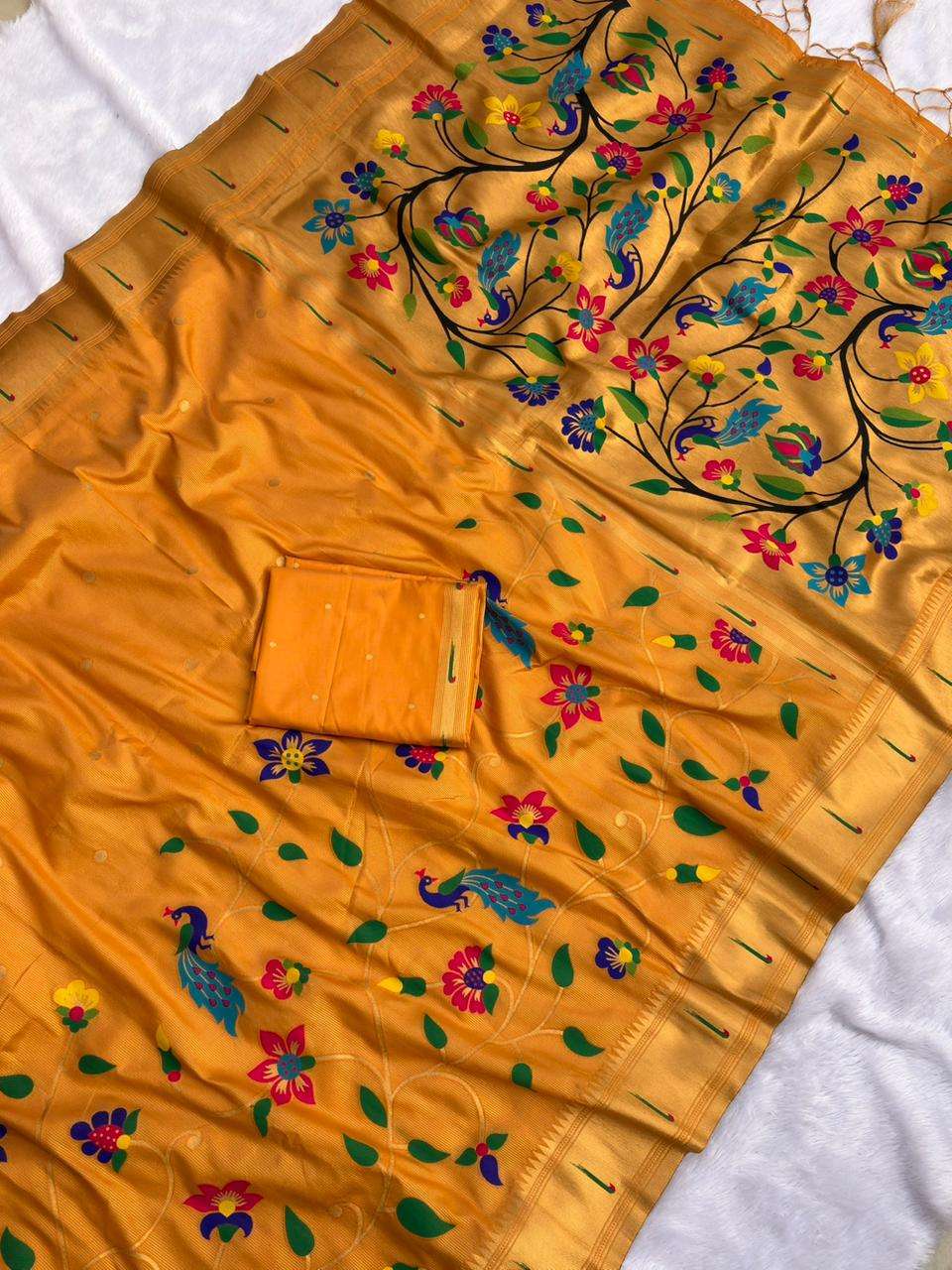 BambooTissue Silk Paithani Saree with traditional meenakari motifs all over the body in half half concept having rich woven traditional original Paithani meenakari Pallu, traditional muniya border and paired with Blouse same as shown.