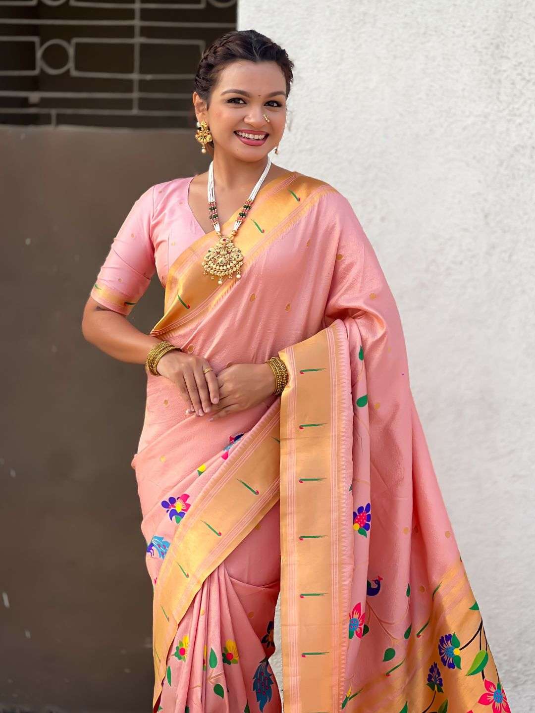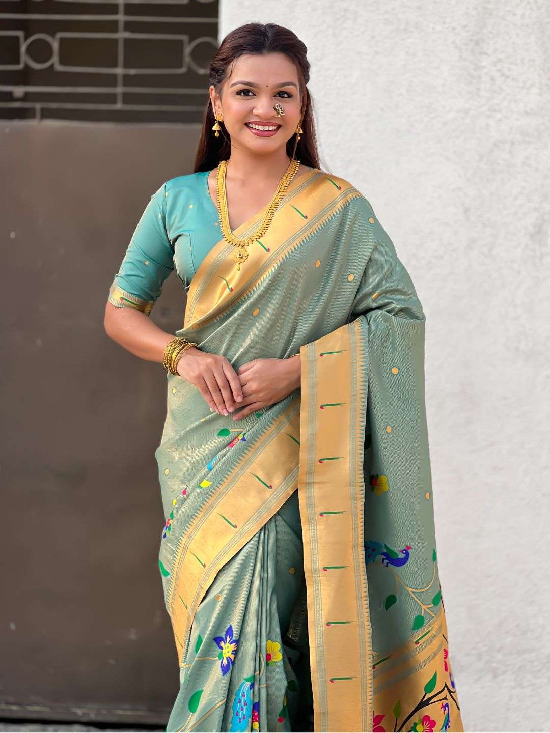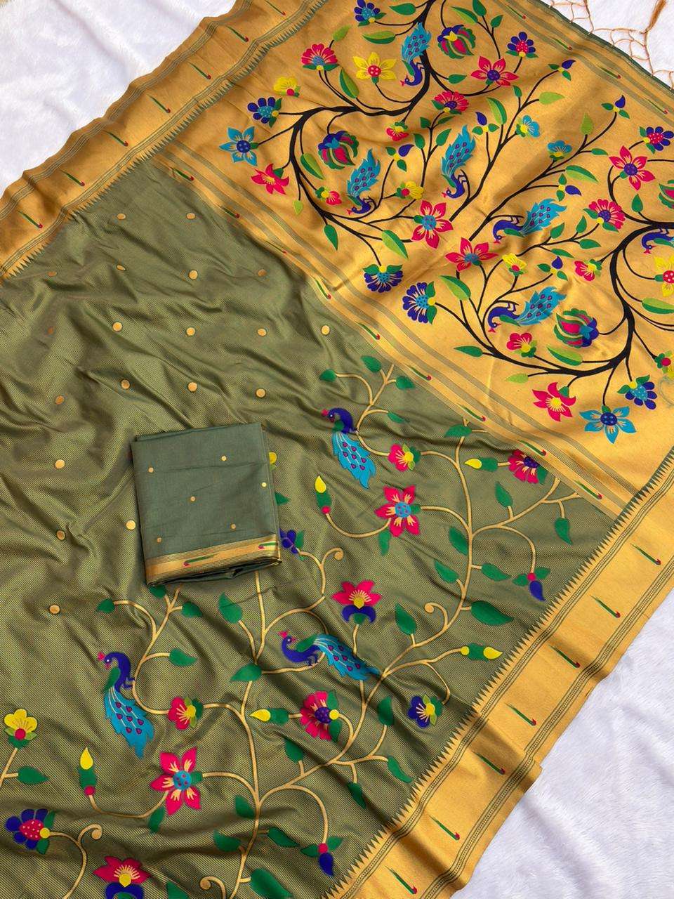 BambooTissue Silk Paithani Saree with traditional meenakari motifs all over the body in half half concept having rich woven traditional original Paithani meenakari Pallu, traditional muniya border and paired with Blouse same as shown.