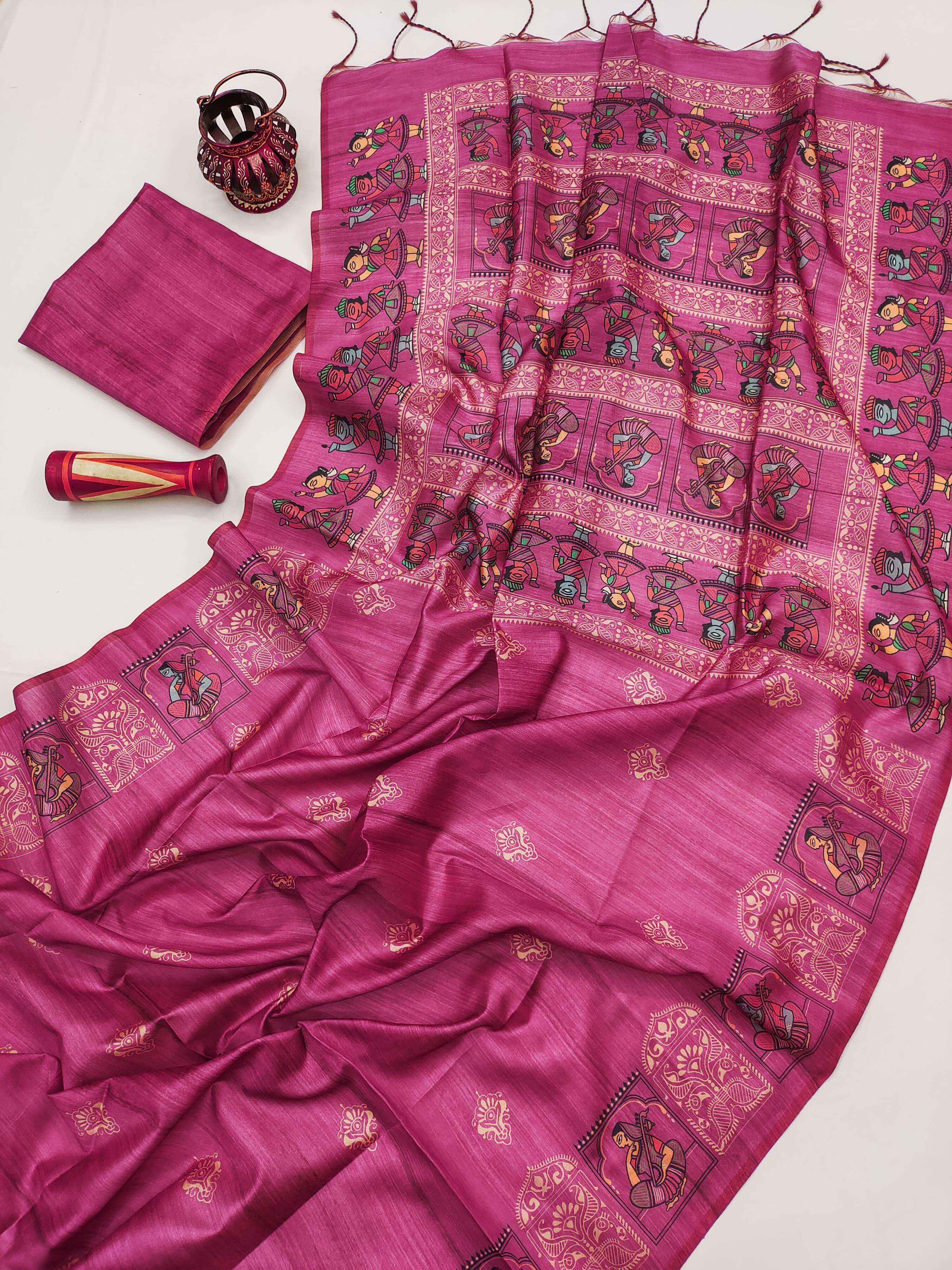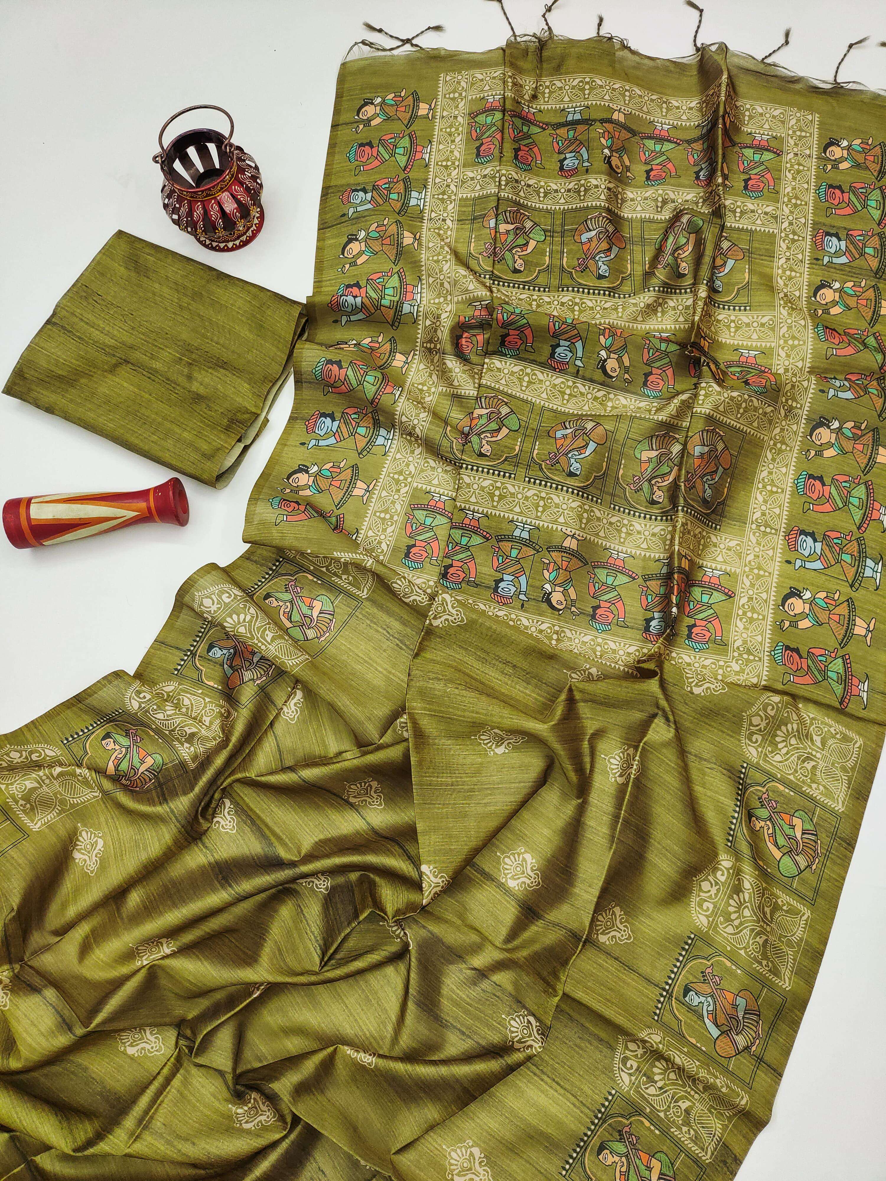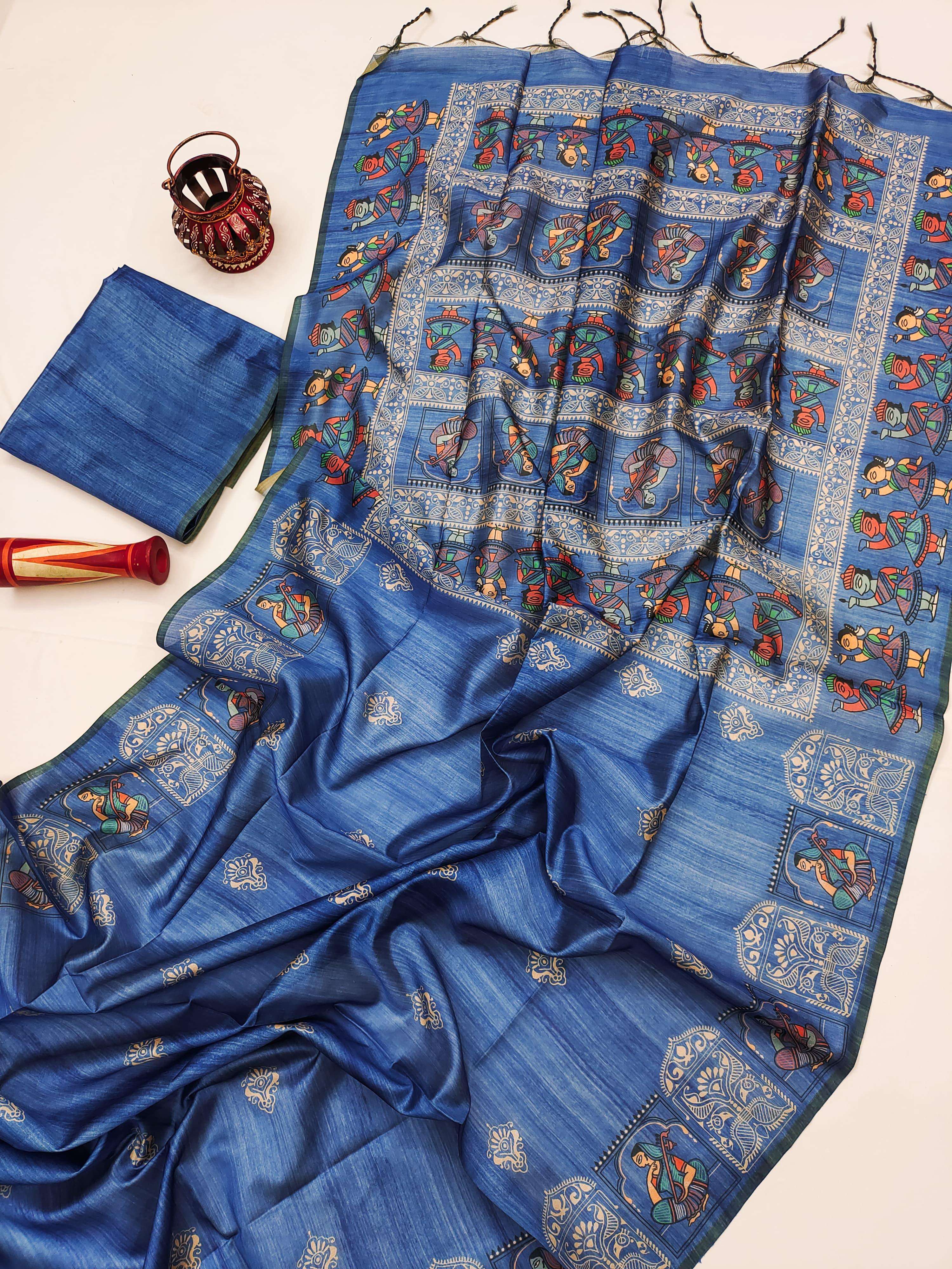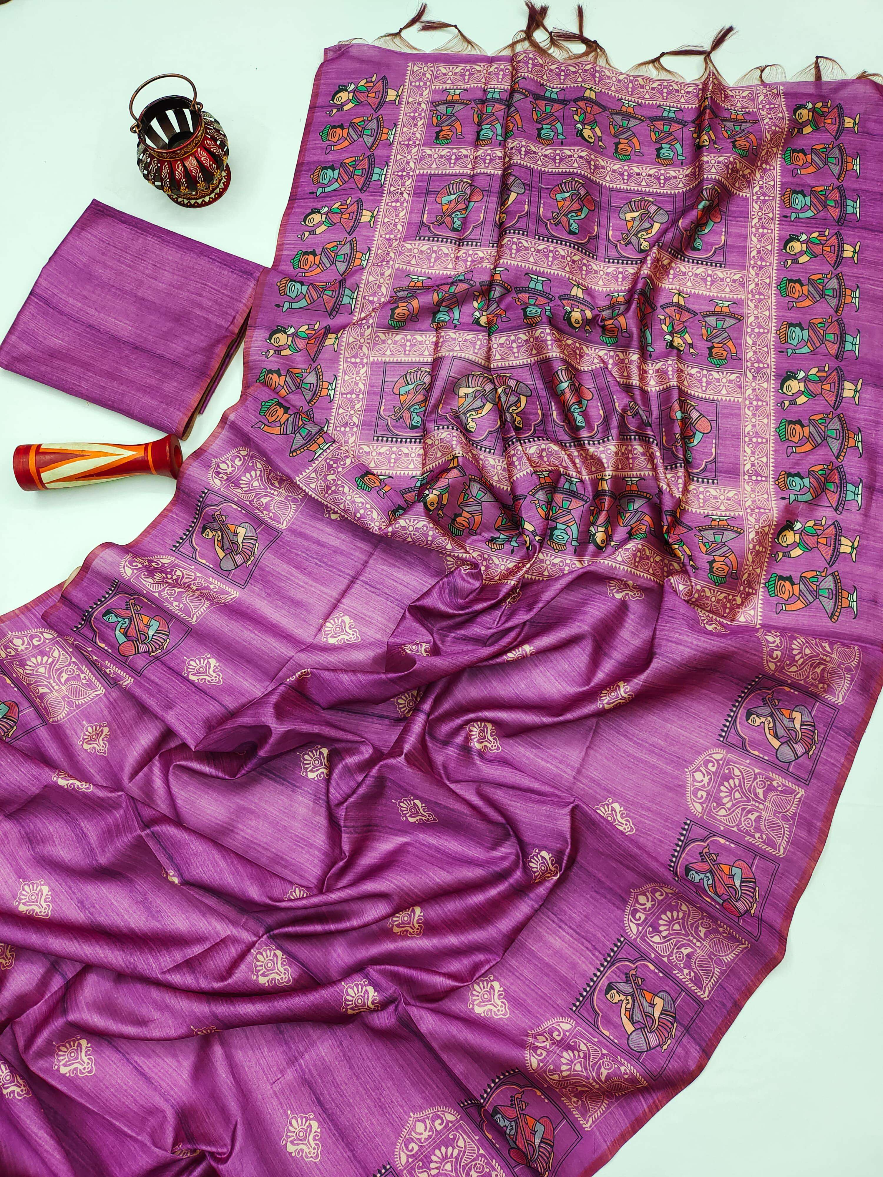 Experience the timeless charm of art and silk with Arushi Madhubani. Crafted in soft Tussar Silk, this elegant saree features a beautiful Madhubani print on the pallu and border, paired with a classic all-over body print that adds graceful appeal. Comes with a running blouse piece, making it a perfect blend of tradition and sophistication. ✨ A unique mixture of Tussar Silk & Madhubani art Ready stock available