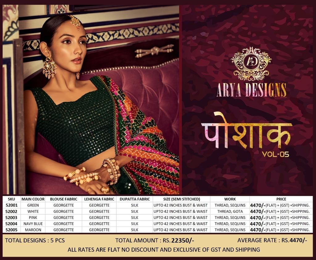 Buy Online Arya Designs New Catalog Poshak Vol 5 5 Pcs of Full Catalogue at Wholesale Price. Looking for Arya Designs New Catalog Poshak Vol 5 Full Catalouge at Best Price? Buy Now Arya Designs New Catalog Poshak Vol 5 at Wholesale Rate of Rs 22350 with Total 5 Pcs from authroized dealer and supplier of Brand. Cost of Each piece is just only Rs 4470 which is very low and affordable price to resale the product in your retail store ,This is Surat based Wholesale Supplier & Dealer of Brand. Click on Brand name to Know more about Brand's products.Call or Whatsapp on 9898838984 for booking or enquiry